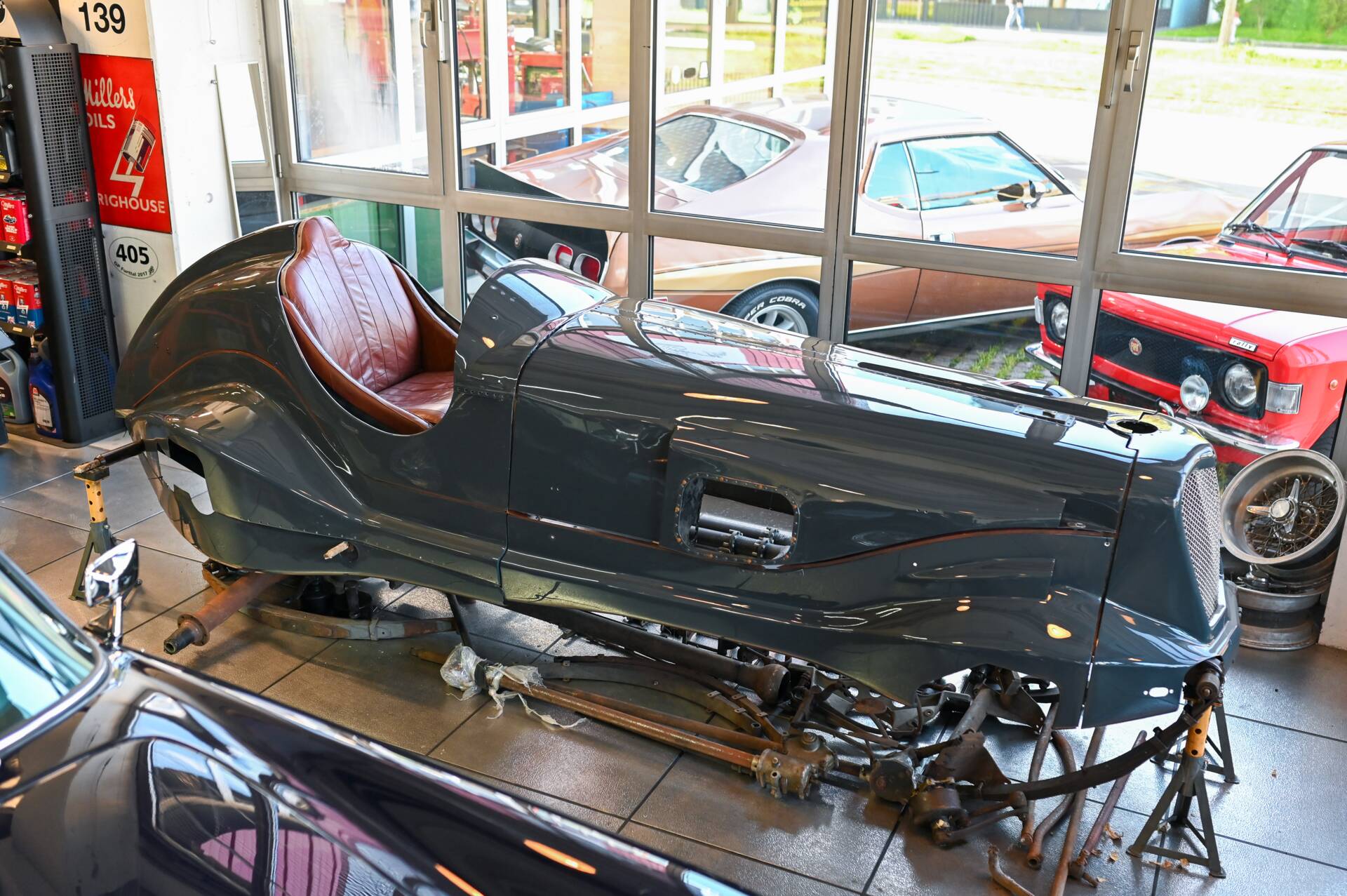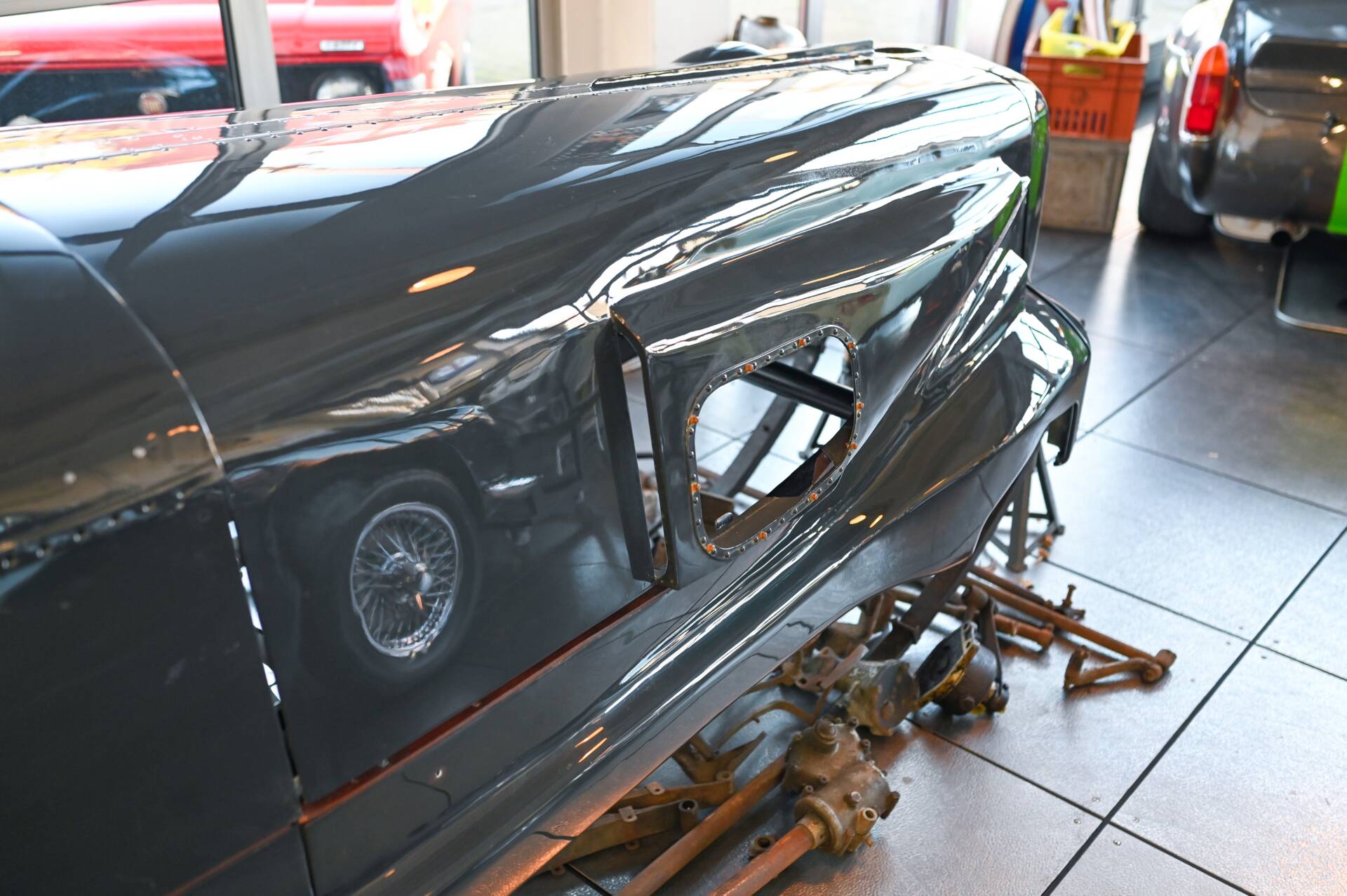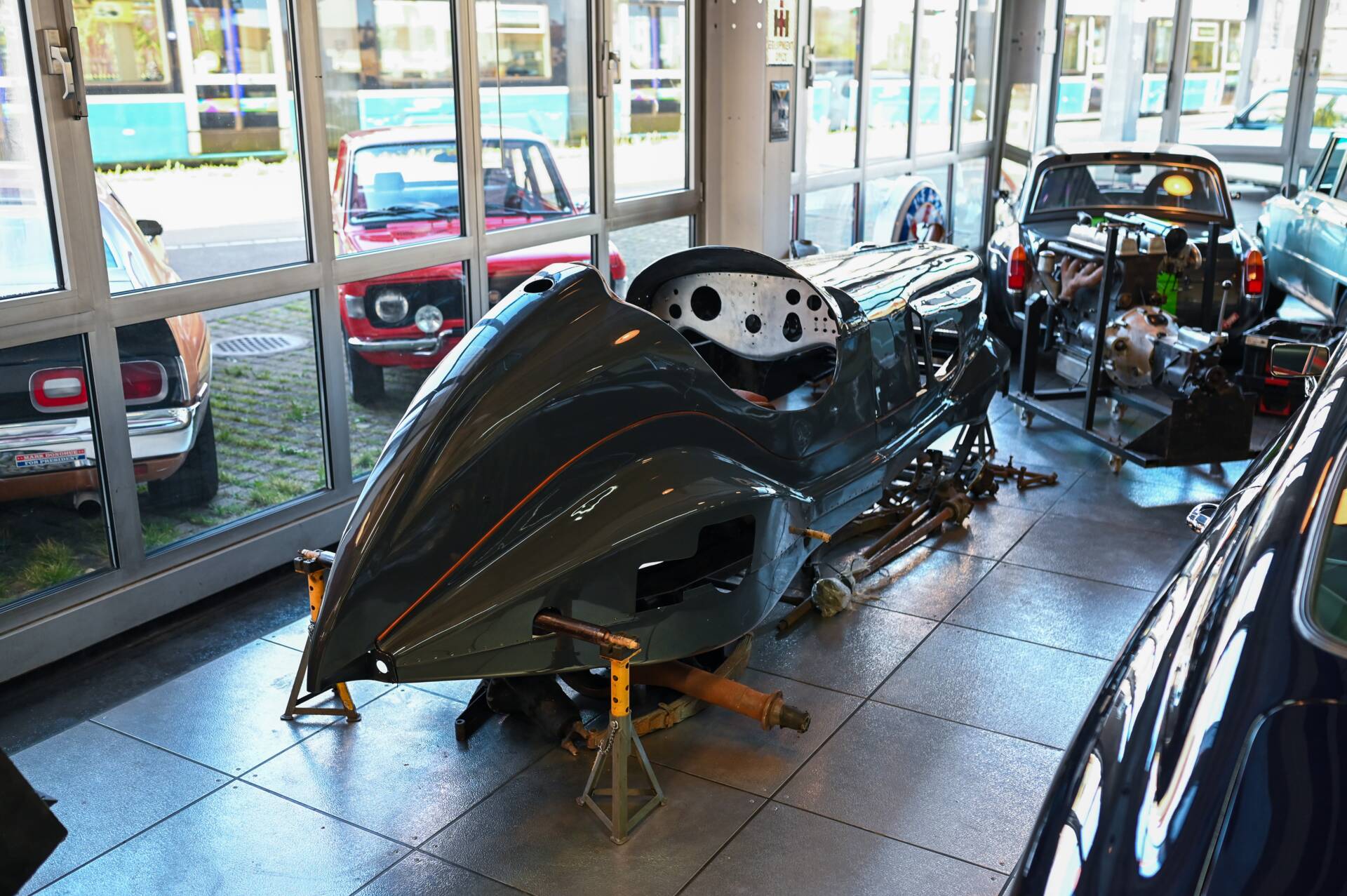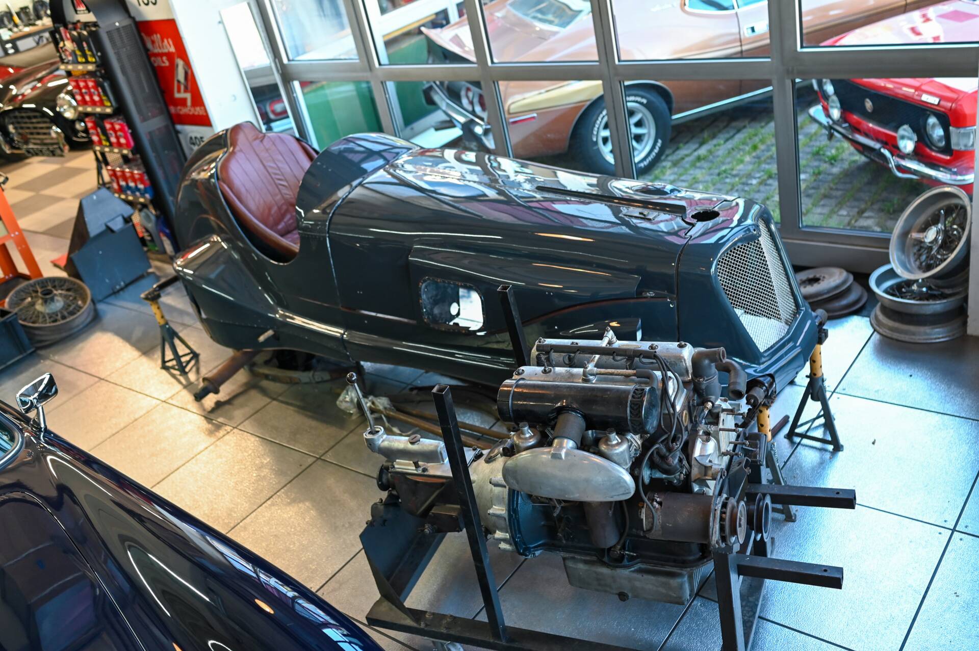 Riley Special Projekt zum Fertigstellen. Rohes Chassis von 1937 mit diversen Teilen und 2. 5 „Big Four“ Motor inklusive korrektem 4-Gang Getriebe. Die Aluminium Carrosserie ist komplett und wurde in der Schweiz für ca. CHF 150‘000.- angefertigt und war bereits auf einem identischen Chassis mit 2. 5 L im Einsatz (komplettes Fahrzeug auf erstem Foto). Alle Teile auf den Fotos gehören zu dem Fahrzeug, zur Komplettierung fehlen jedoch Komponenten wie Vorderachse, Auspuff, Lenkrad oder Instrumente. Eine sehr interessante Basis für einen 1-sitzigen Vorkriegsrennwagen mit Spielraum für Individualisierungen.