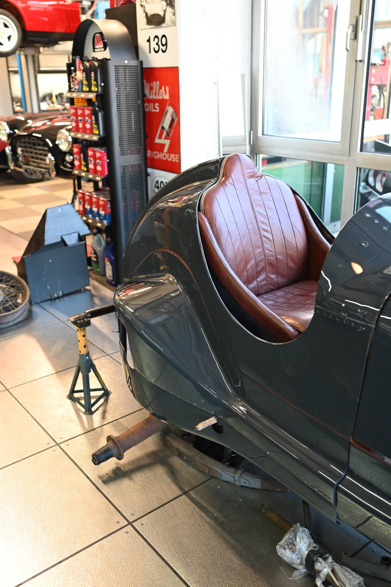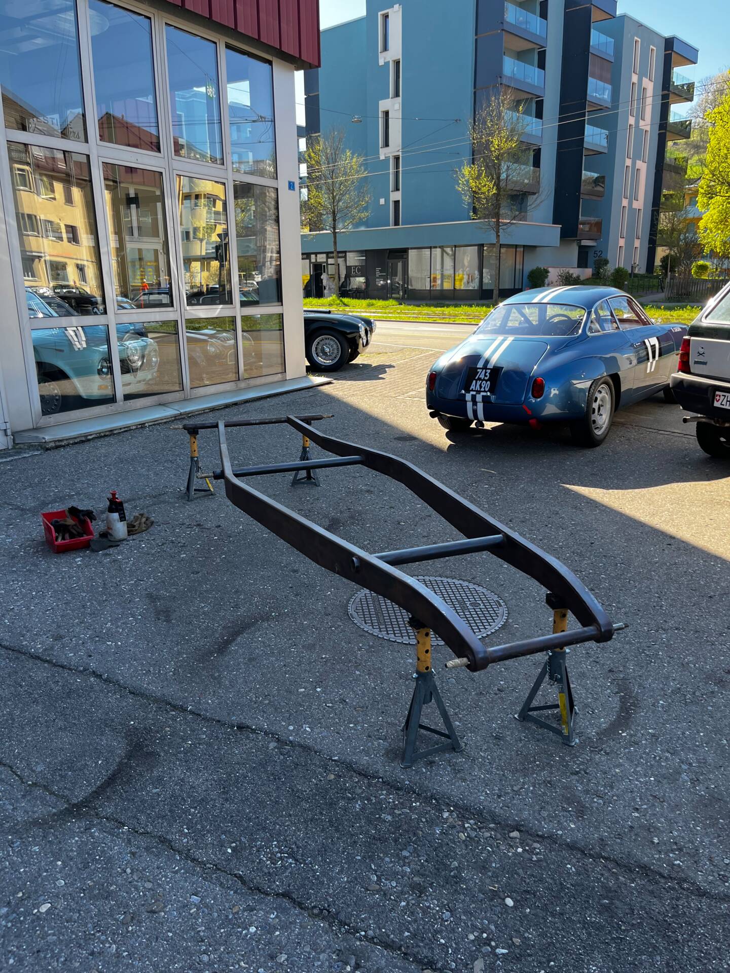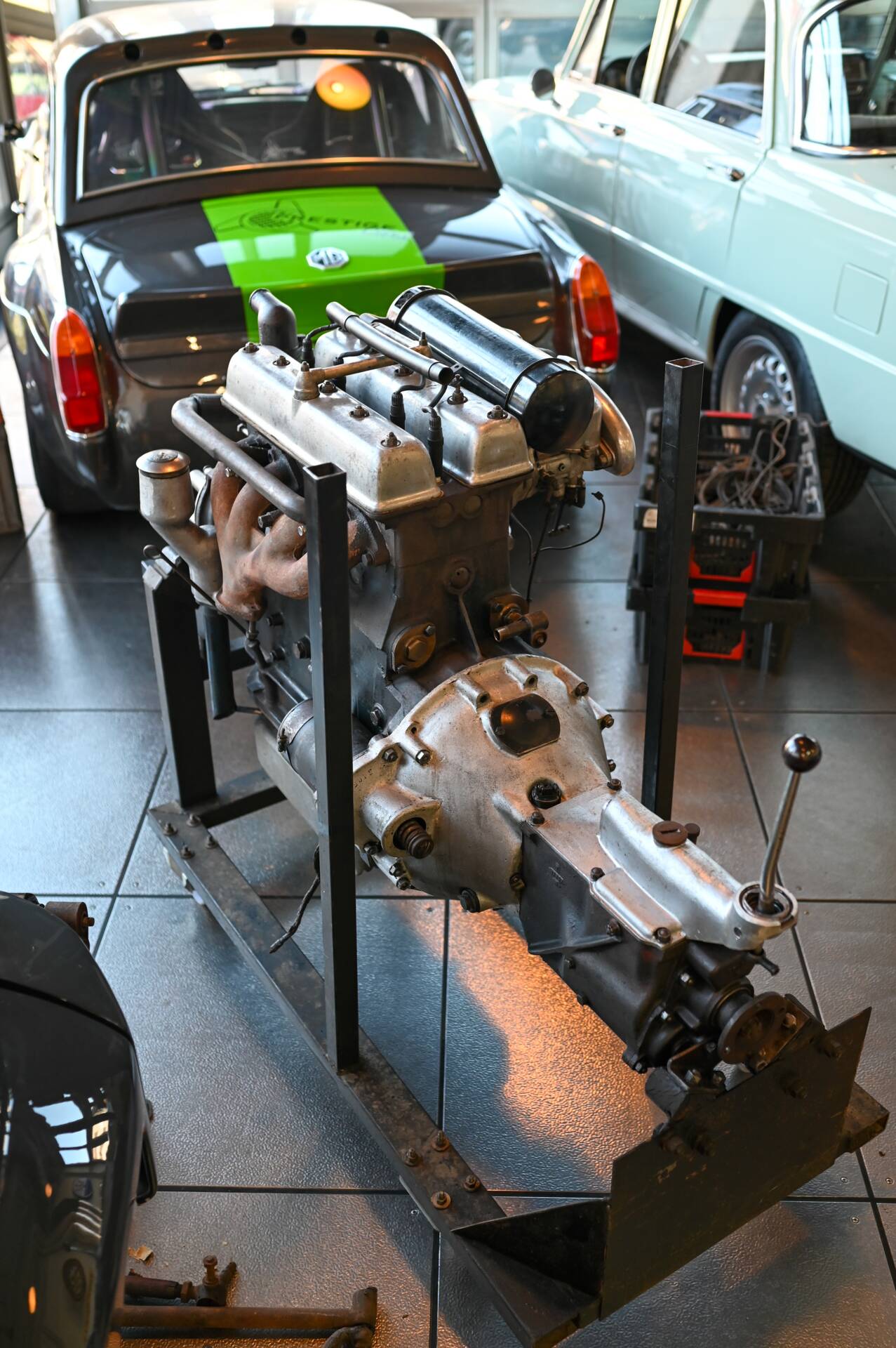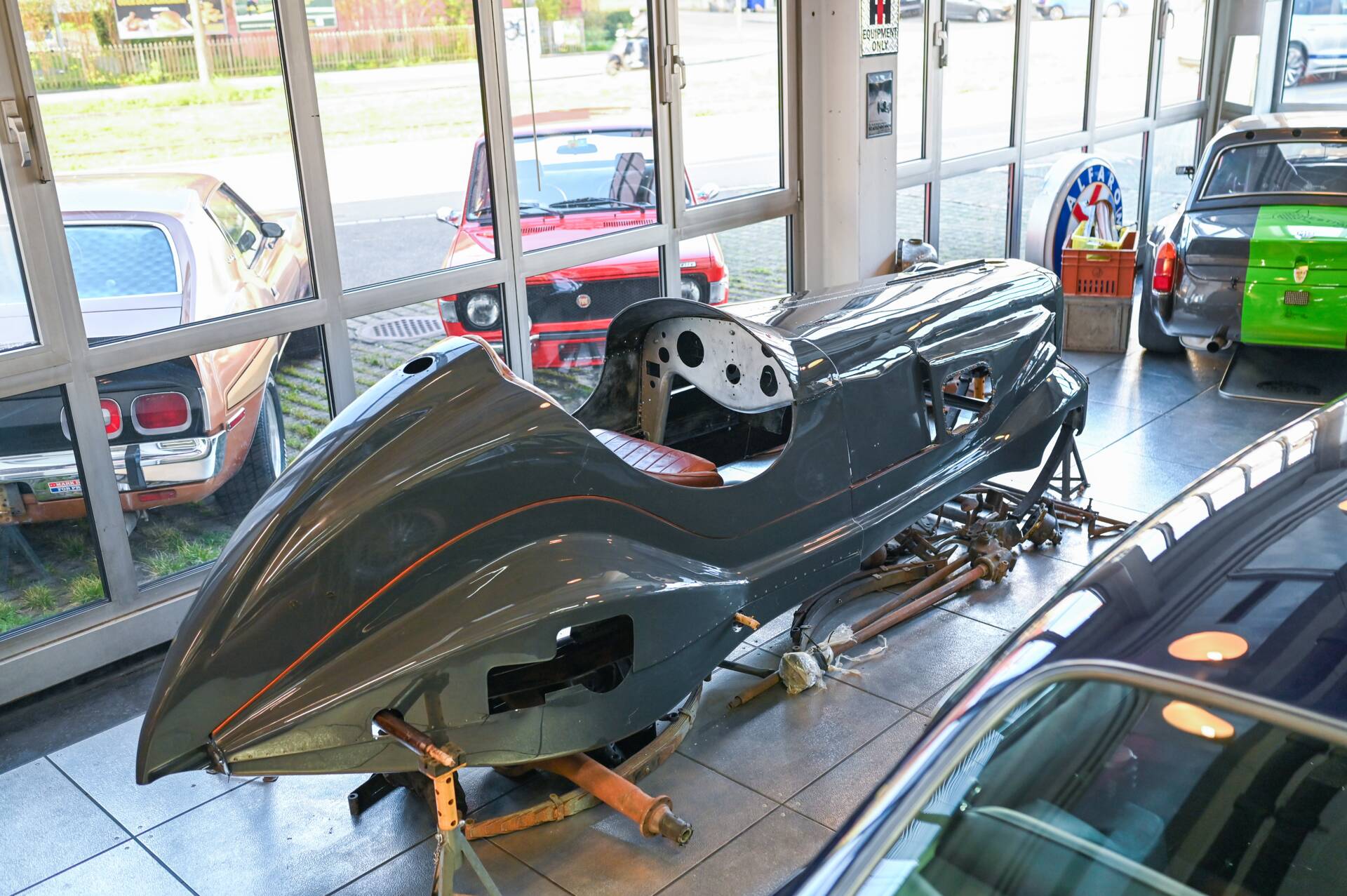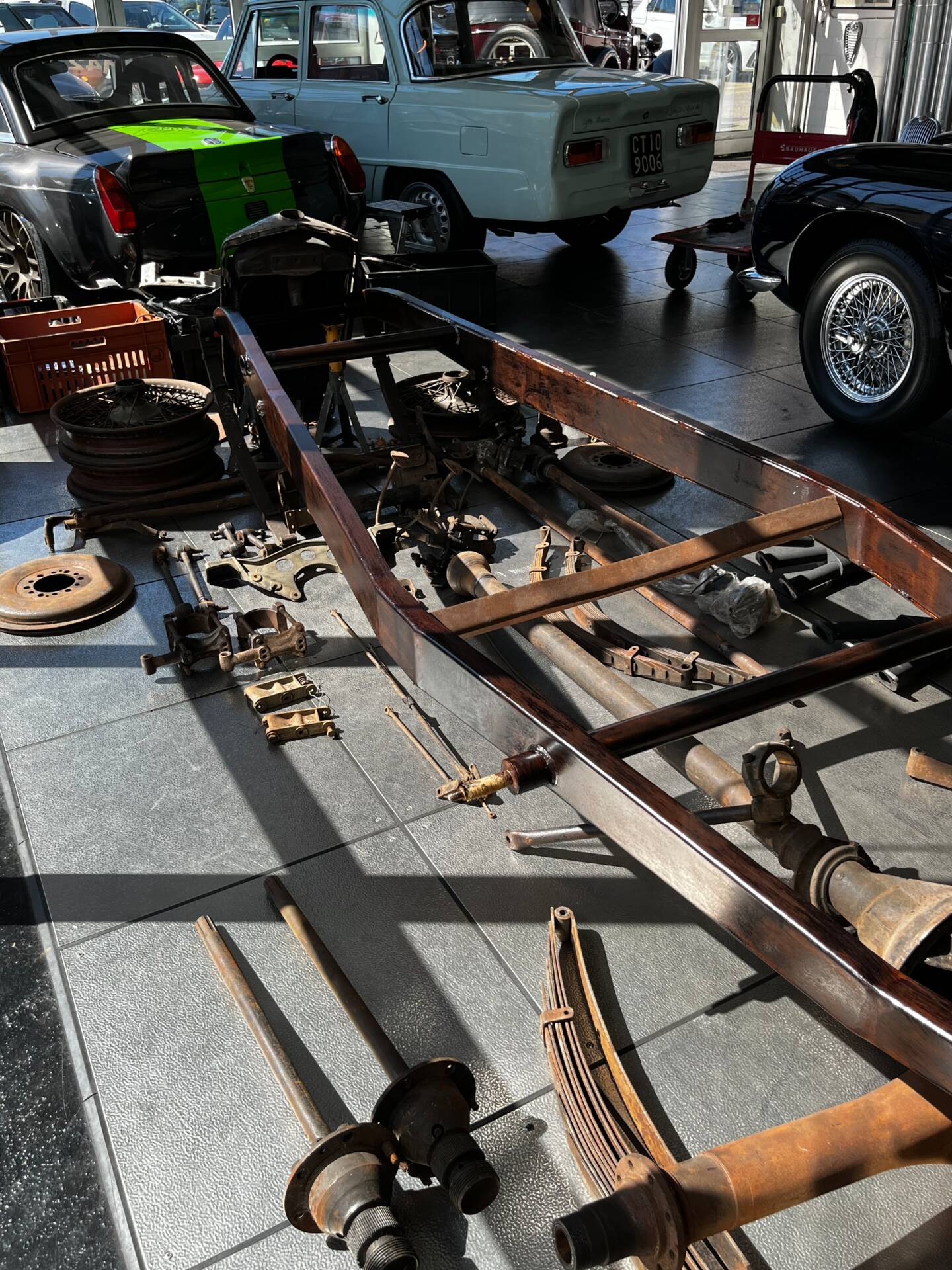 Riley Special Projekt zum Fertigstellen. Rohes Chassis von 1937 mit diversen Teilen und 2. 5 „Big Four“ Motor inklusive korrektem 4-Gang Getriebe. Die Aluminium Carrosserie ist komplett und wurde in der Schweiz für ca. CHF 150‘000.- angefertigt und war bereits auf einem identischen Chassis mit 2. 5 L im Einsatz (komplettes Fahrzeug auf erstem Foto). Alle Teile auf den Fotos gehören zu dem Fahrzeug, zur Komplettierung fehlen jedoch Komponenten wie Vorderachse, Auspuff, Lenkrad oder Instrumente. Eine sehr interessante Basis für einen 1-sitzigen Vorkriegsrennwagen mit Spielraum für Individualisierungen.
