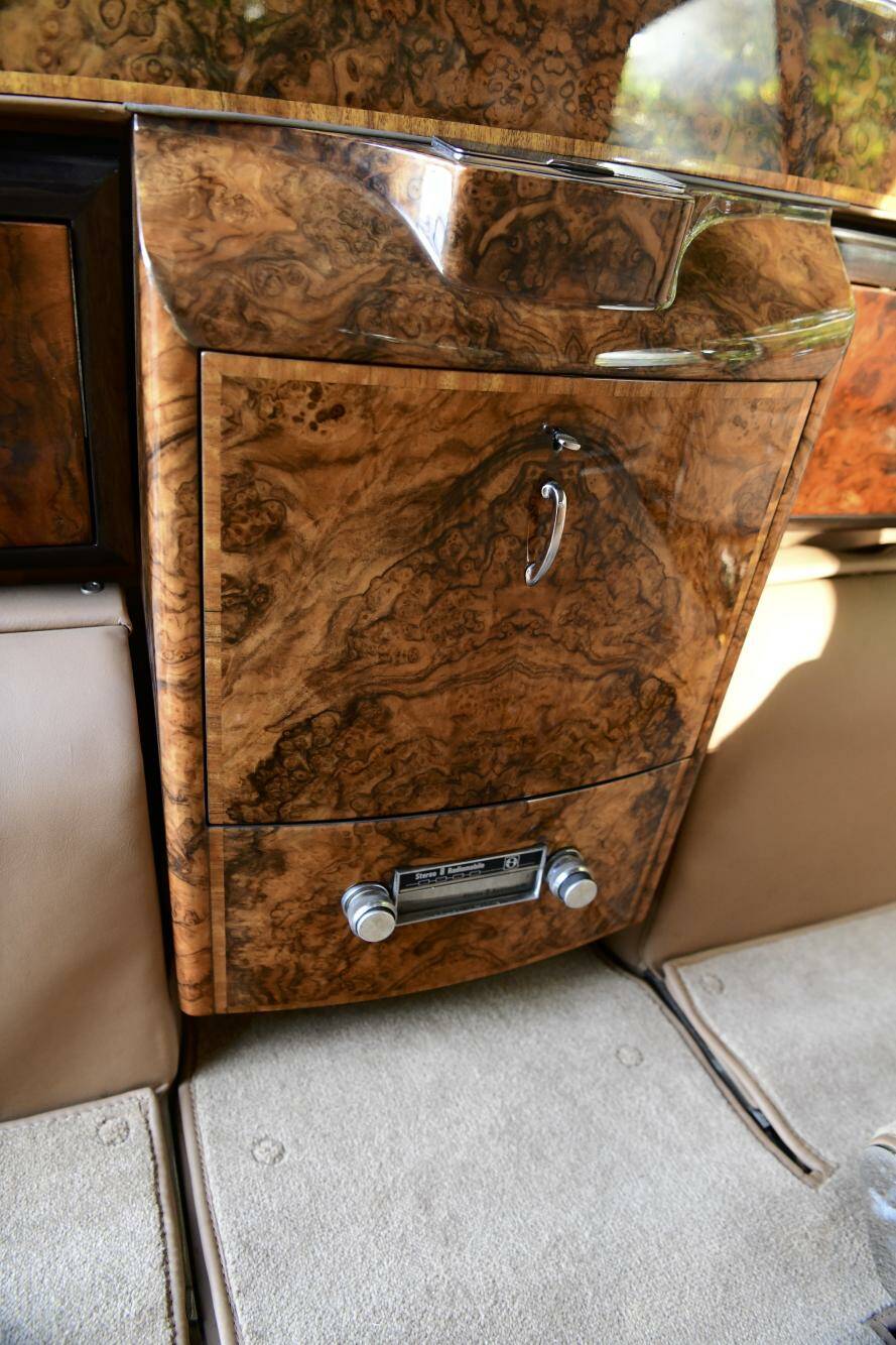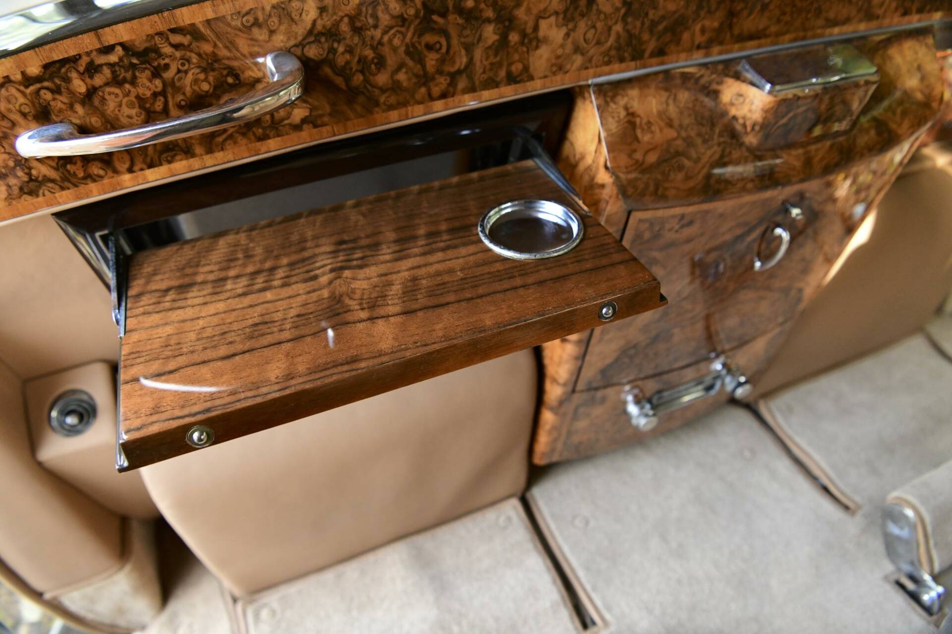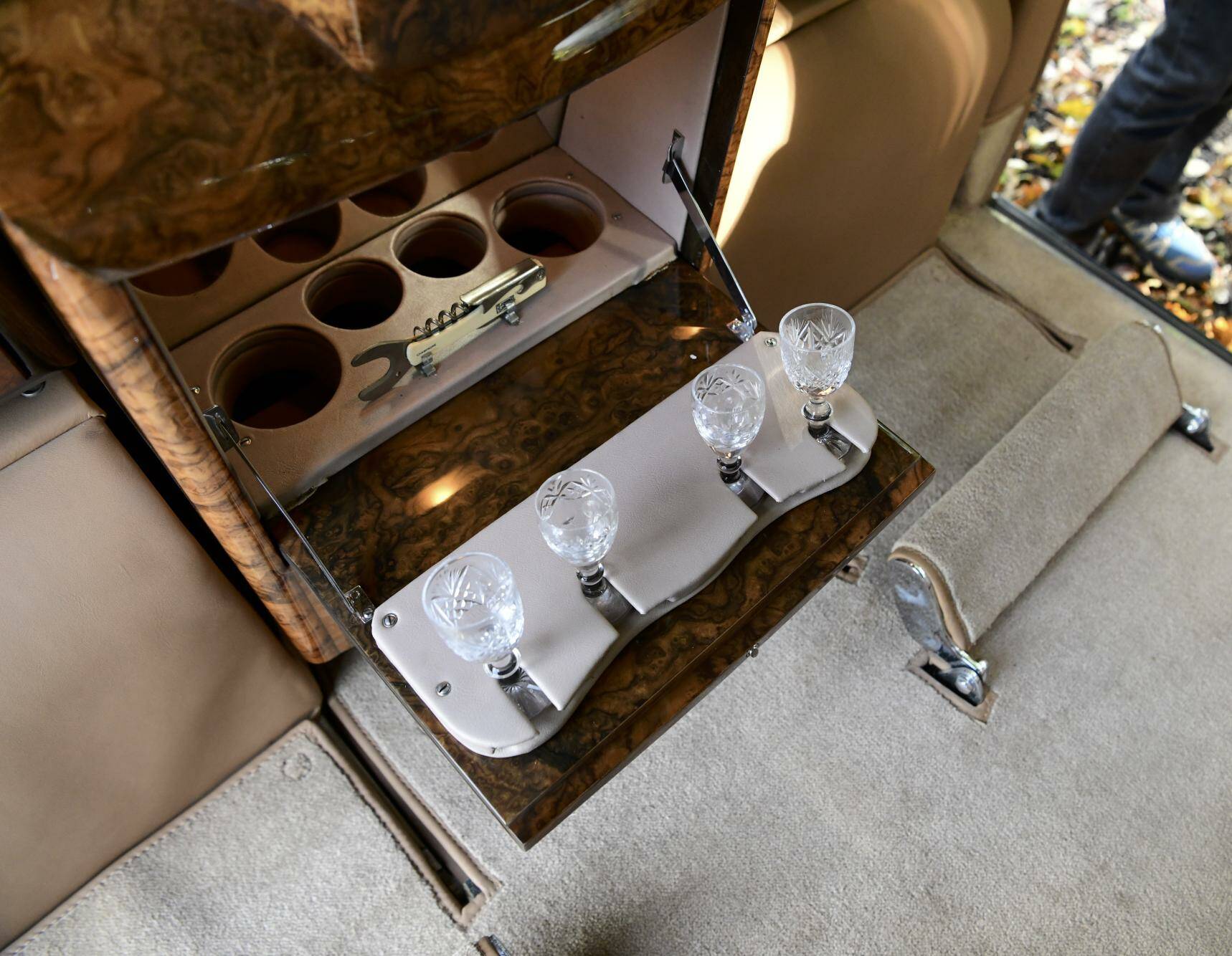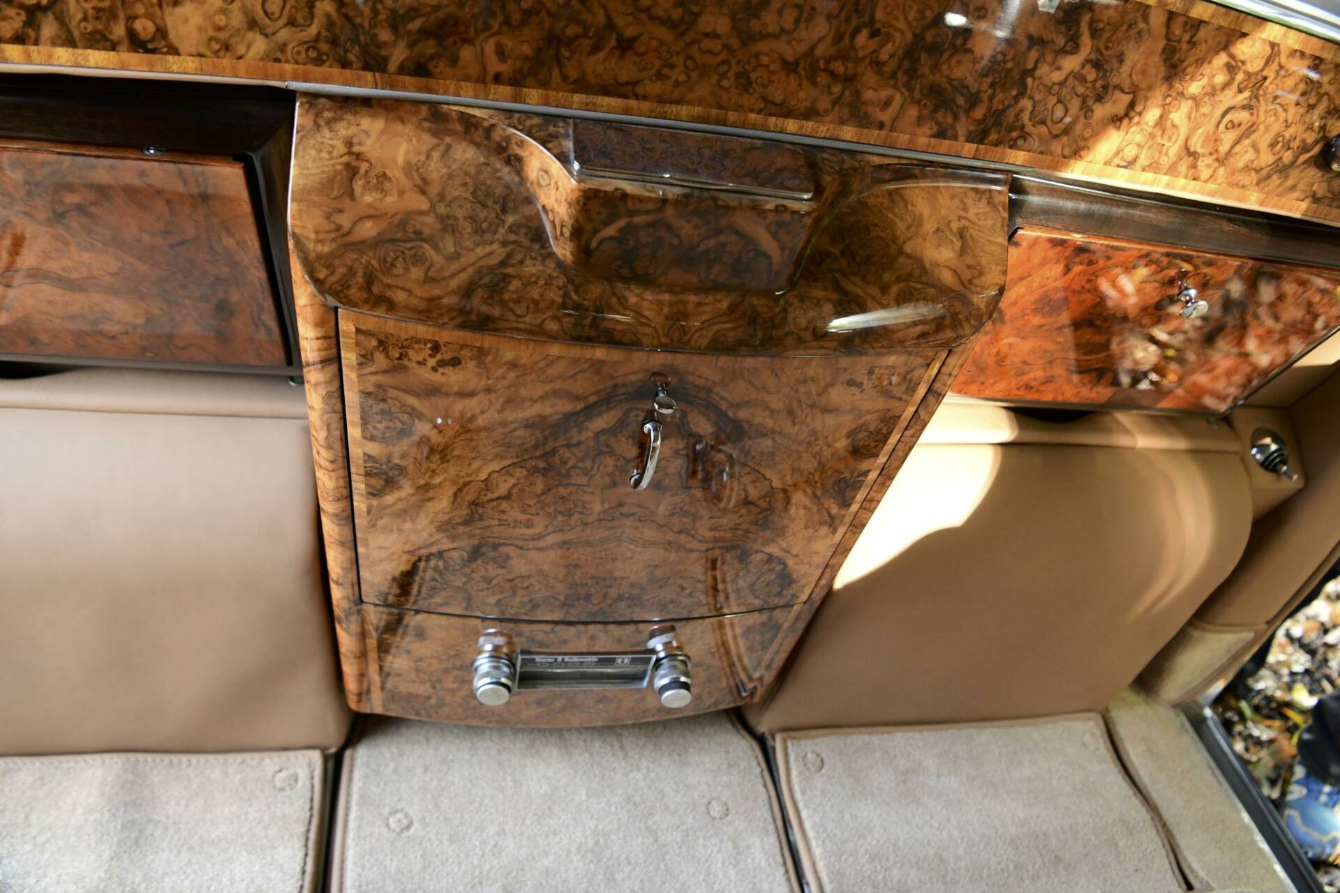 These is a cocktail cabinet in the back & also a modern period looking radio. The rear seat armrest folds open to reveal the usual beauty requisites found in these cars. It is equipped with twin fold out occasional seats making the car a true 7 seat vehicle. There are also rear picnic tables in the car. Being an early example is has the rear suicide door configuration which to our mind is far more elegant then the later front hinged door versions.