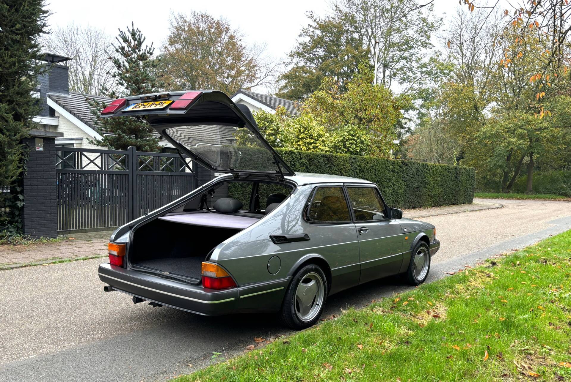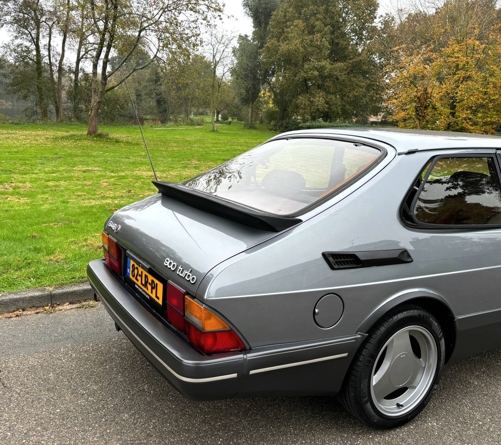 The exterior looks beautiful, and a fortune has been spent in the past to keep the 900 in this condition. The Saab has been resprayed in its original color, "Platana metallic 228," and the quality of the paintwork is top-notch. The metallic paint looks beautiful with a deep shine. Every Saab used to have its weak spots, and these have all been professionally addressed. Invoices from the past 21 years totaling €14,700 are available for respraying and rust-removal of the familiar axle wells, sills, and A-pillars. The beautiful Aero kit was also resprayed in the past, so everything looks very sharp. Recently, 16" AERO alloy wheels were installed, and they look fantastic. A world of difference compared to the small wheels. Thanks to this excellent care in the past, the car is rock-solid with only minor signs of wear.
