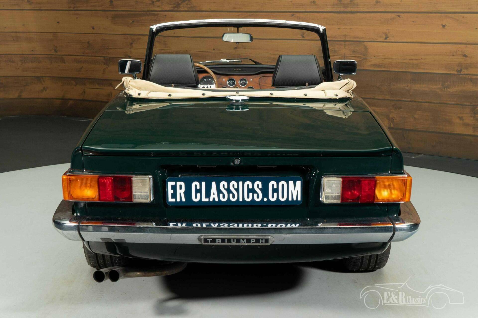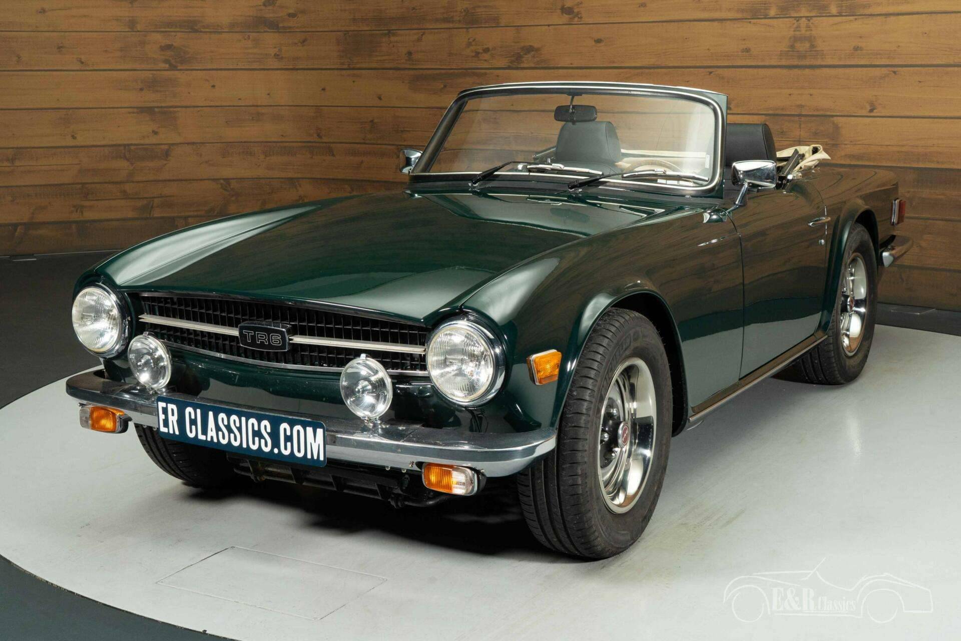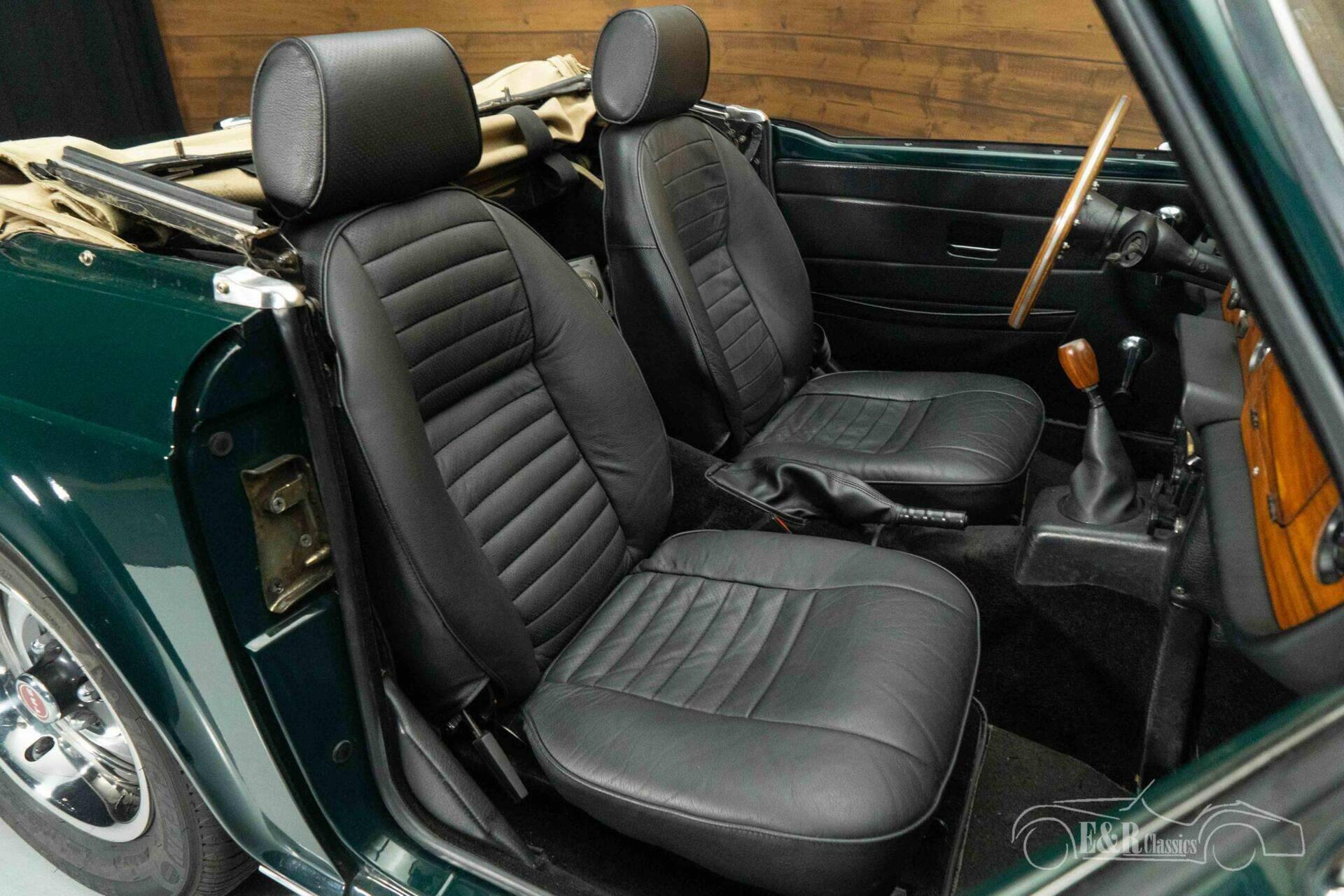 Het exterieur is uitgevoerd in het klassieke British Racing Green lakwerk, dat prachtig combineert met het chroomwerk en de gemonteerde verstralers aan de voorzijde. De auto wordt geleverd met zowel een hardtop als een beigekleurige softtop, waardoor hij geschikt is voor alle seizoenen. Het interieur is uitgevoerd in zwarte bekleding en ademt pure jaren-70 sportiviteit, versterkt door het fraaie houten MotoLita stuurwiel. Het contrast tussen het donkere interieur en het diepe groene lakwerk zorgt voor een stijlvolle en tijdloze uitstraling die deze Triumph TR6 tot een zeer begeerlijke klassieker maakt.
