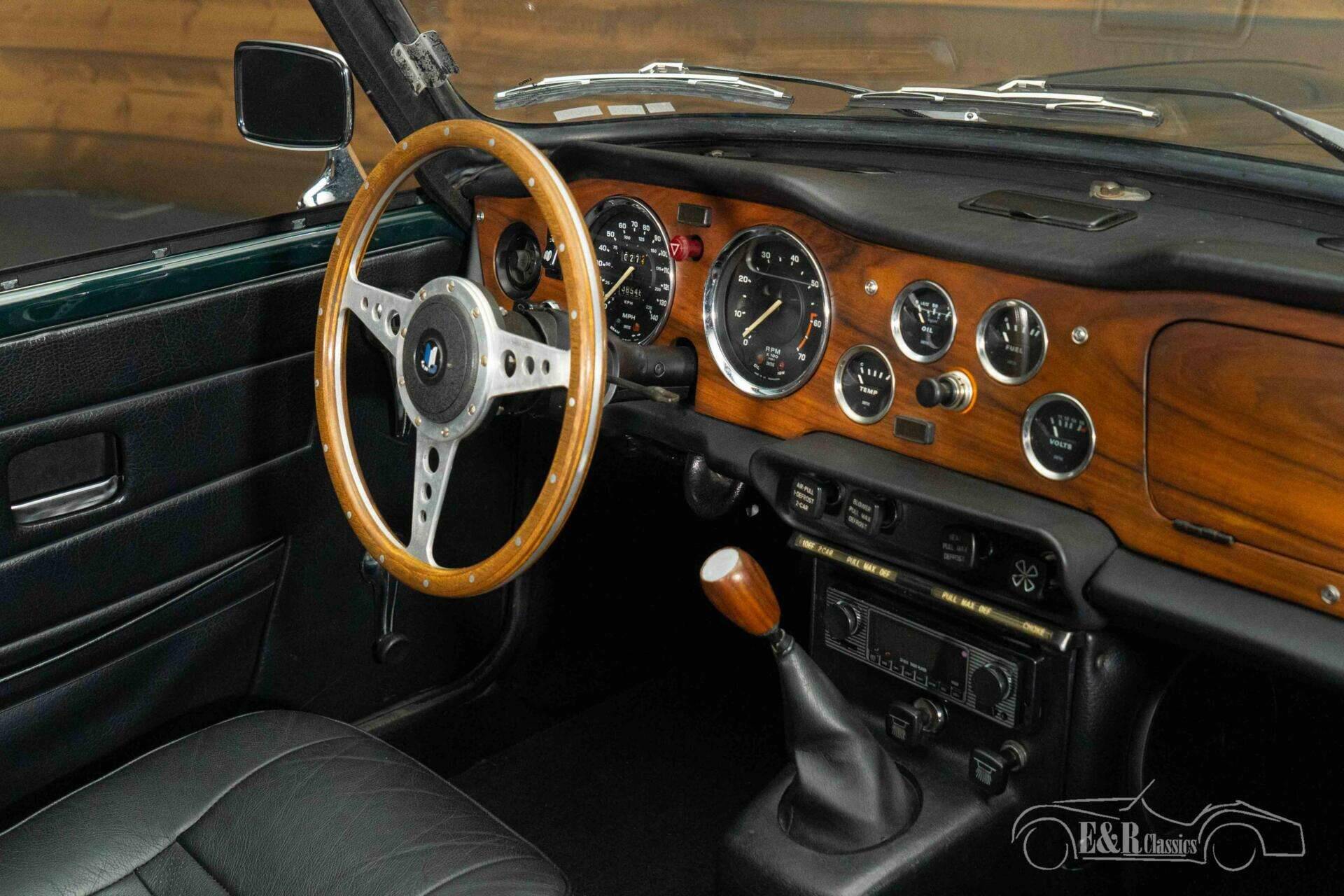 The exterior features classic British Racing Green paintwork, which combines beautifully with the chrome and the mounted spotlights at the front. The car comes with both a hardtop and a beige soft top, making it suitable for all seasons. The interior is upholstered in black and exudes pure 1970s sportiness, enhanced by the beautiful wooden MotoLita steering wheel. The contrast between the dark interior and the deep green paintwork creates a stylish and timeless look that makes this Triumph TR6 a highly desirable classic.