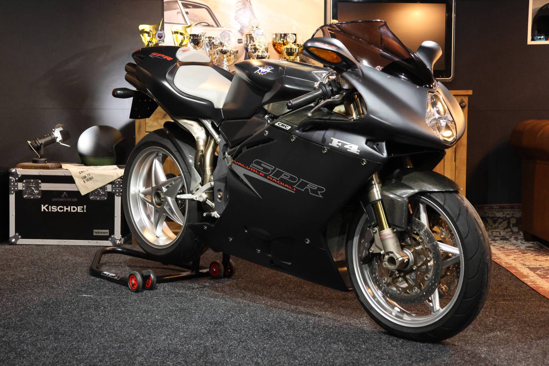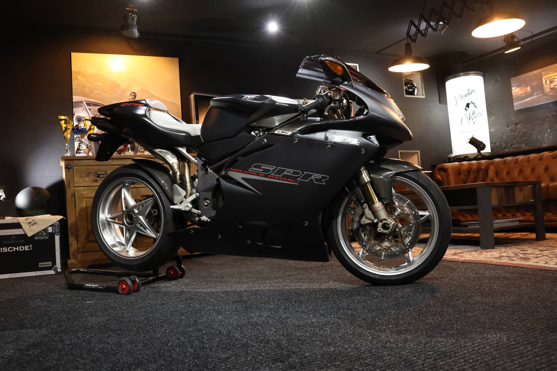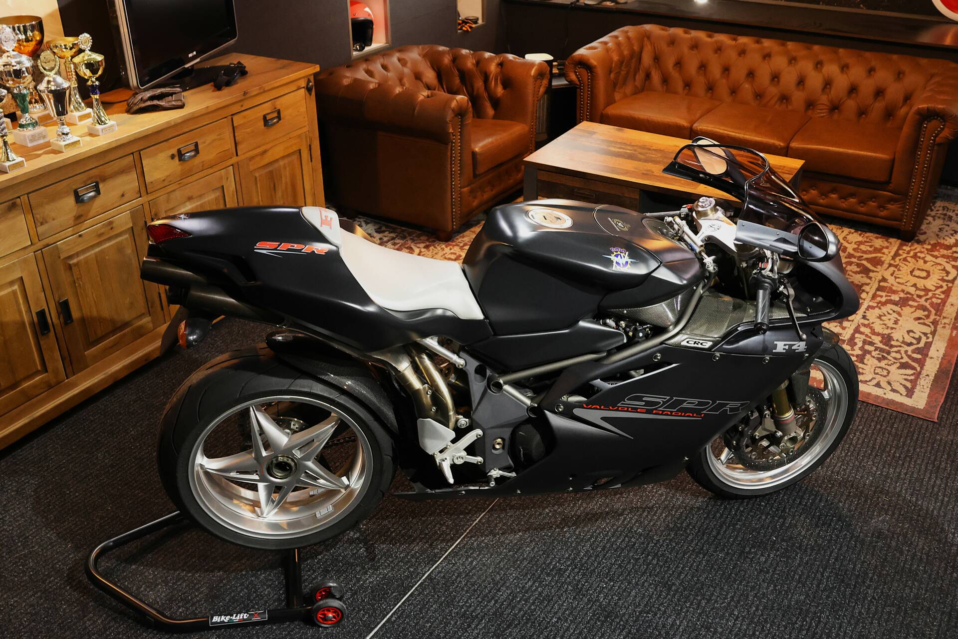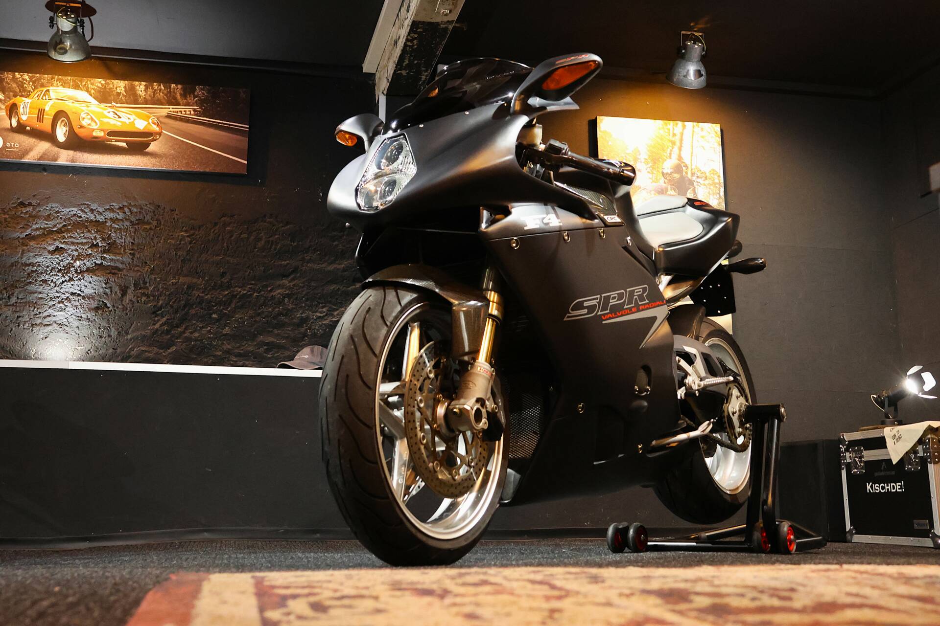 Technisch gesehen ist die «SPR» die finale Evolutionsstufe der 750er, bevor die F4 1000 auf den Markt kam. Die Konstrukteure von MV überarbeiteten den Zylinderkopf, verbauten Schmiedekolben sowie schärfere Nockenwellen, erhöhten die Verdichtung auf 13:1, passten die Motorenelektronik entsprechend an, verstärkten die Kupplung und verkürzten die Getriebeabstufungen. Das Resultat dieses rennsportlichen Vierzylinders mit radial angeordneten Ventilen sind 143 PS und atemberaubende 13`900 U/min Maximaldrehzahl. Auch auf Seiten des Fahrwerks gab es für die «SPR» eine Aufwertung. Vorne federt und dämpft eine edle, titan-nitrit-beschichtete Marzocchi-Gabel, hinten kümmert sich ein Racing-Federbein von Sachs um die Fahrbahnunebenheiten. Beide Komponenten selbstverständlich voll einstellbar. Auch sind mehrere Bauteile in Karbon gefertigt. Ein weiteres Erkennungsmerkmal ist der weisse Drehzahlmesser sowie natürlich die nummerierte Plakette auf der Gabelbrücke. Die 300 Exemplare, welche ausschliesslich in Matt-Schwarz mit silbernen Felgen zu haben war, wurden zwischen Juni und Dezember 2003 gebaut.