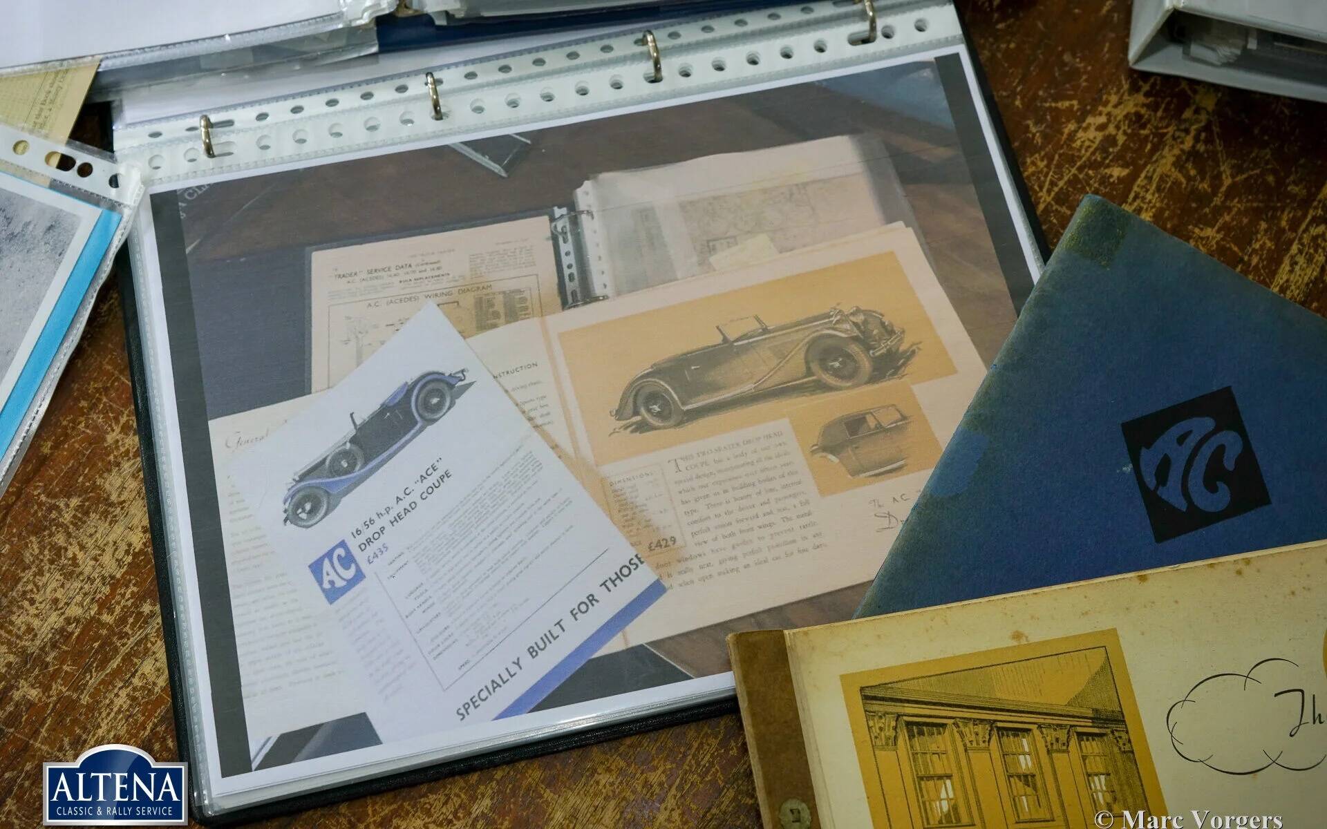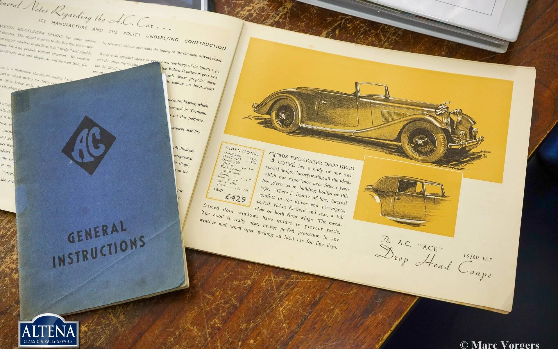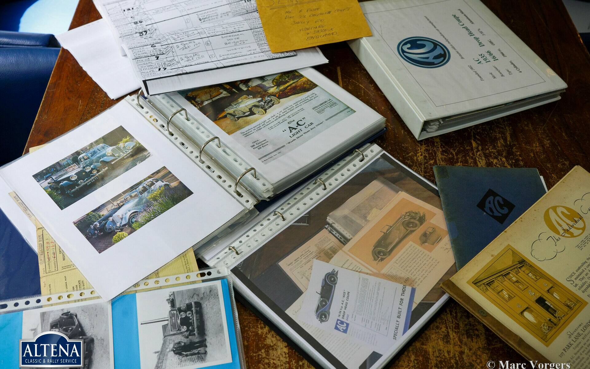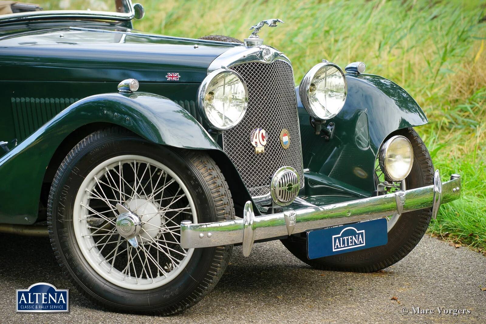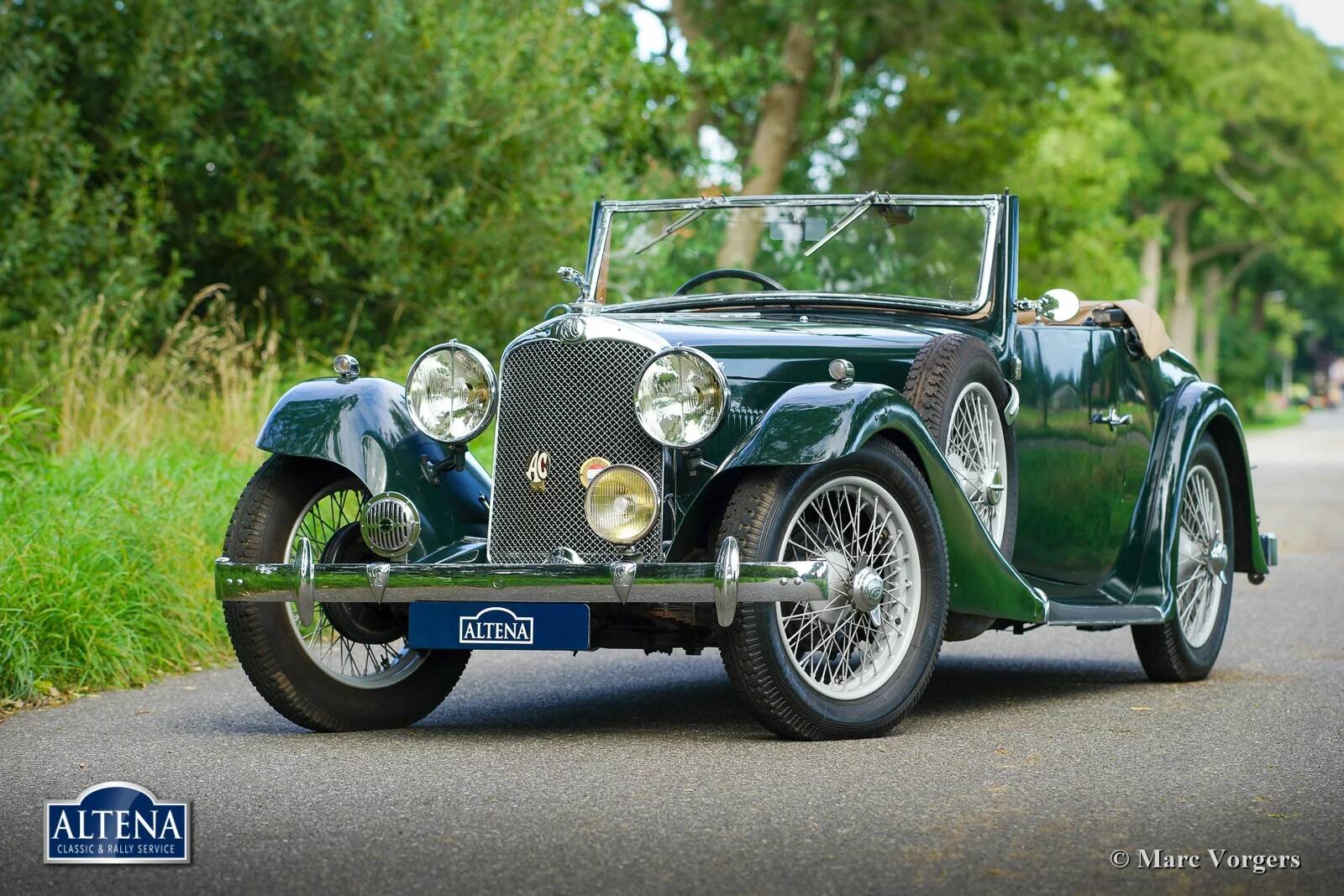 AC (Acédès) 16/66 Drophead Coupe, jaar 1935. Chassisnummer L34X, motornummer UBS.29X. Originele Britse registratie: DPC918. Kleur donker British Racing Green gecombineerd met een beige lederen interieur en lichtbruin tapijt afgezet met beige randen. De auto is voorzien van een zwarte vinyl kap en een lichtbruine mohair tonneau cover.