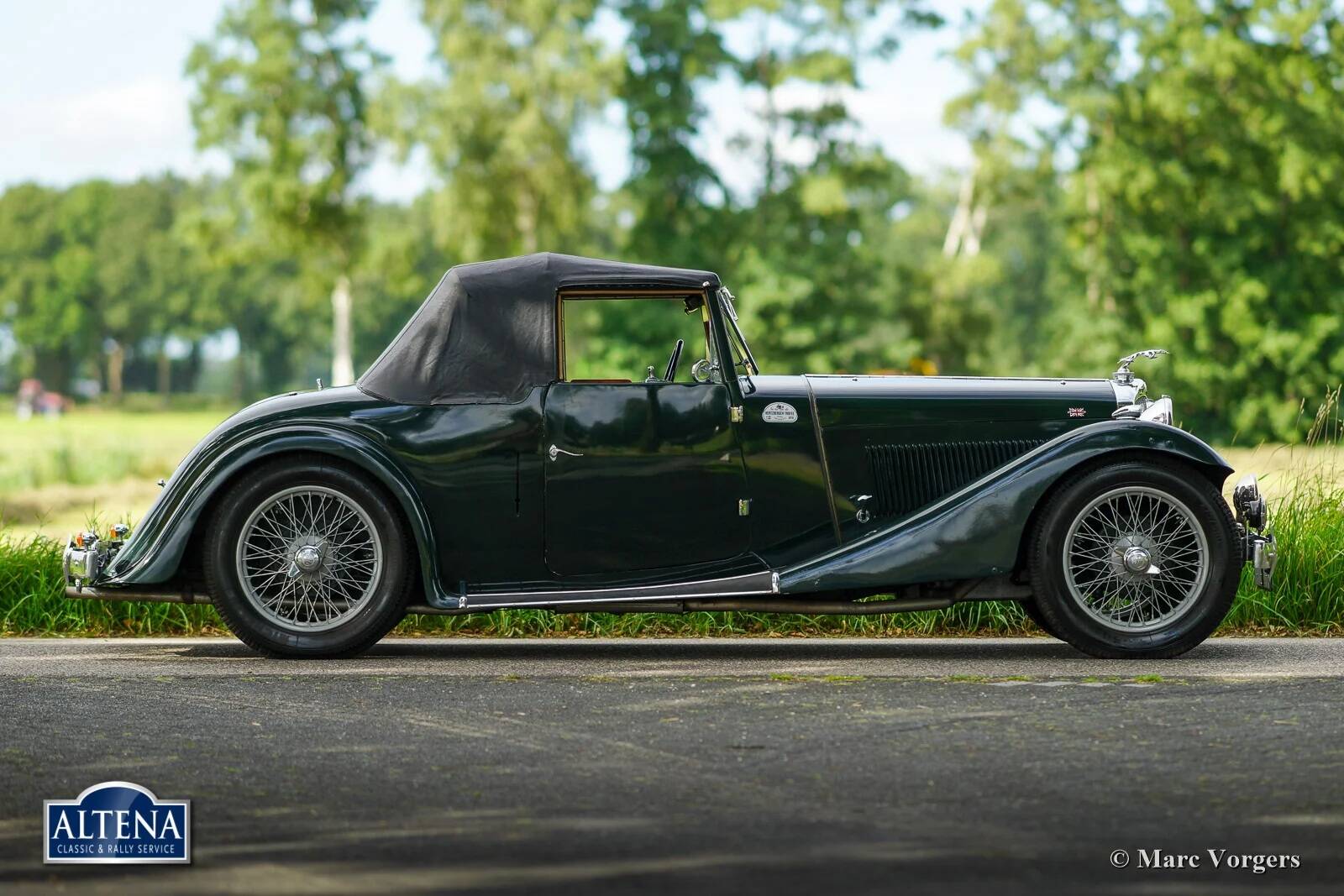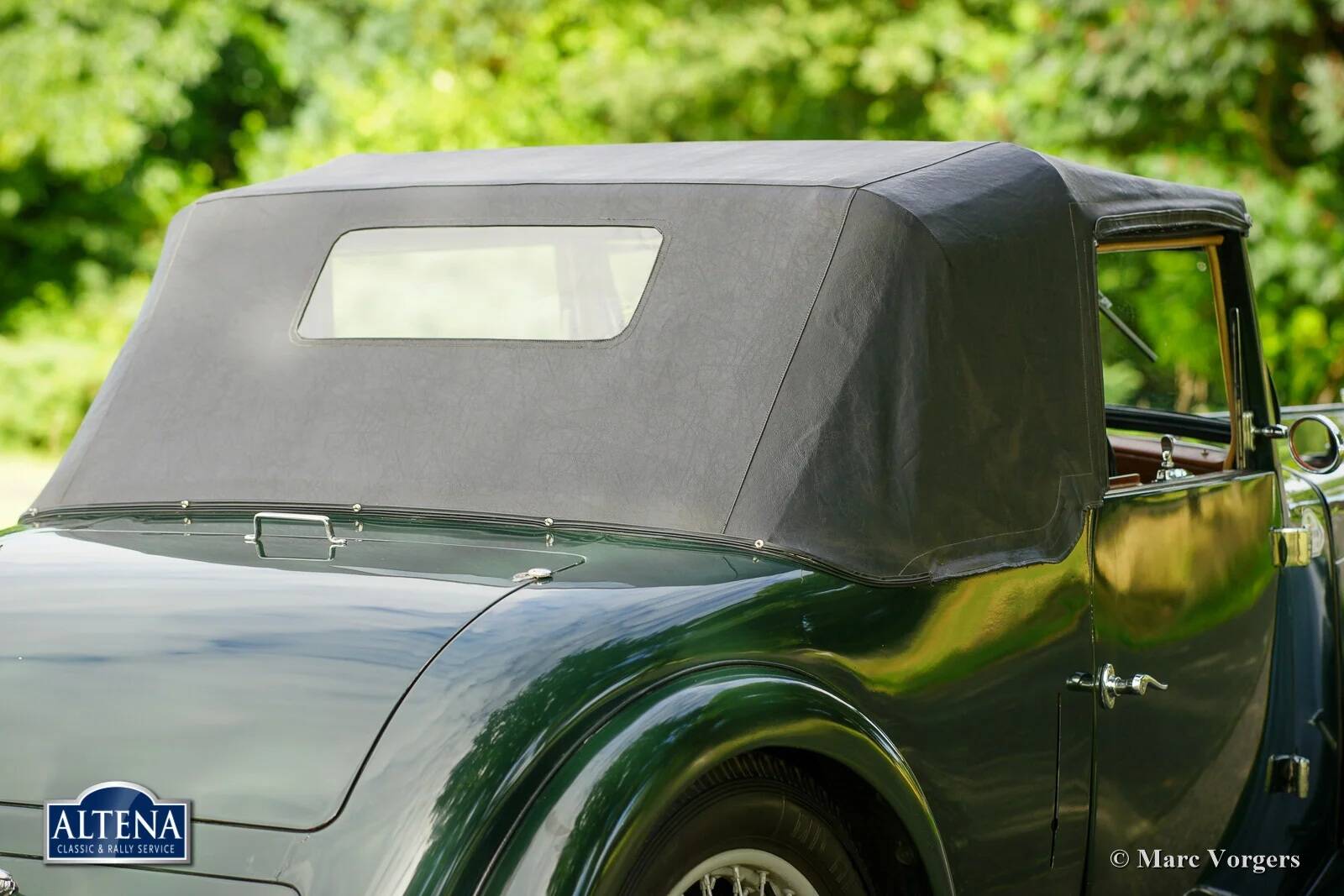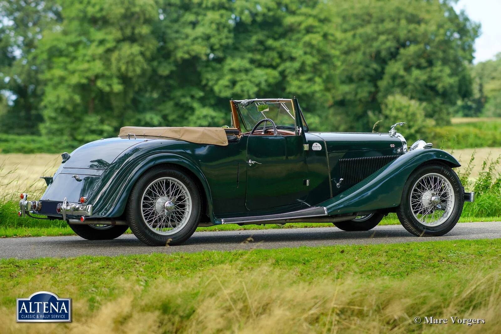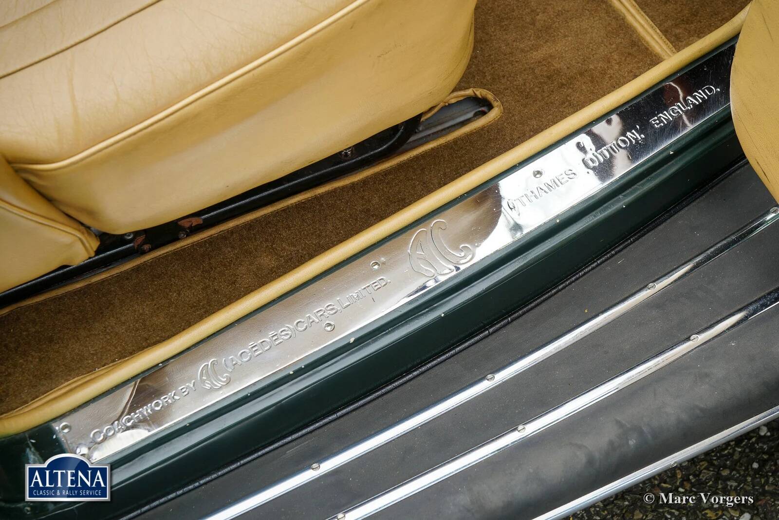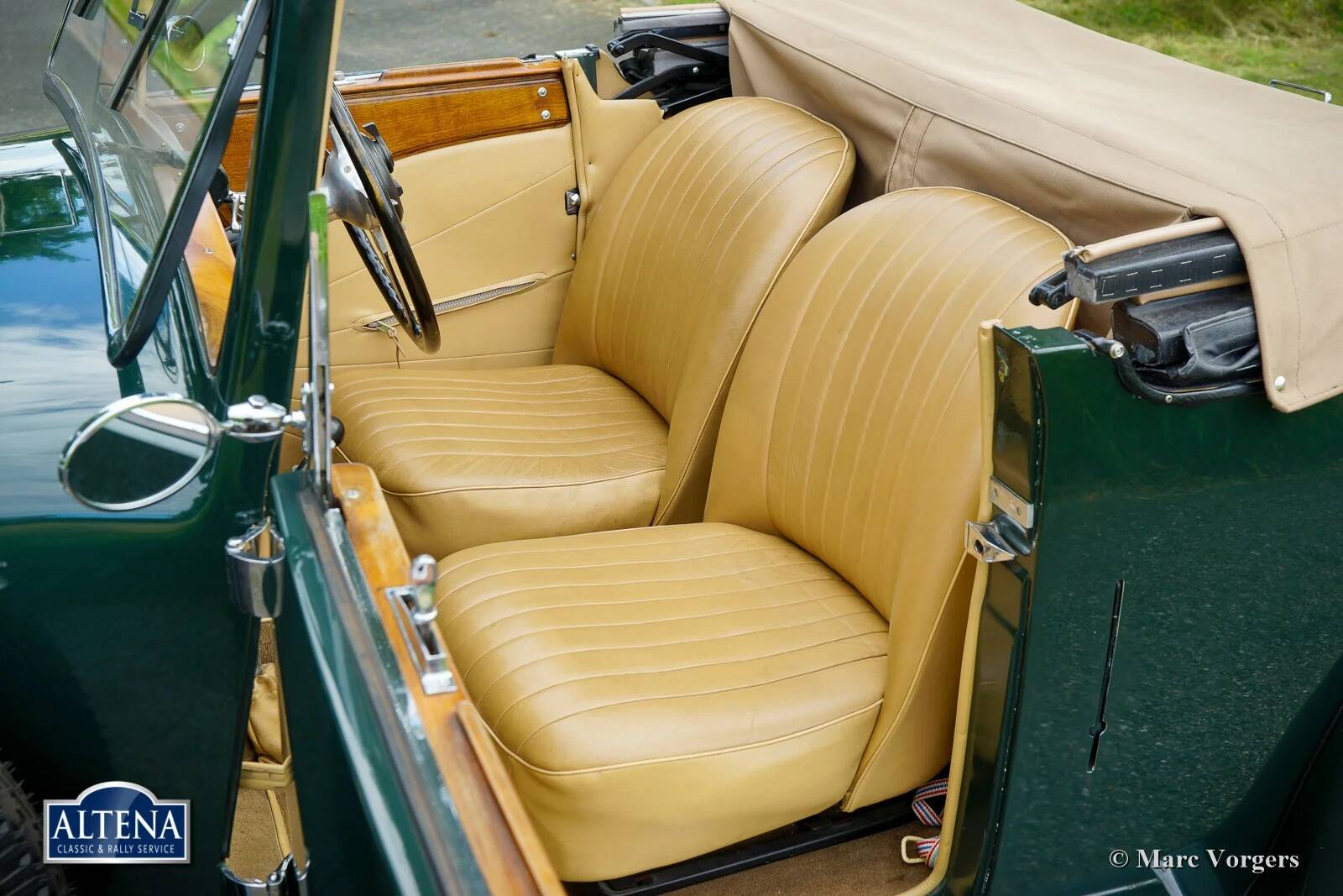 AC (Acédès) 16/66 Drophead Coupe, jaar 1935. Chassisnummer L34X, motornummer UBS.29X. Originele Britse registratie: DPC918. Kleur donker British Racing Green gecombineerd met een beige lederen interieur en lichtbruin tapijt afgezet met beige randen. De auto is voorzien van een zwarte vinyl kap en een lichtbruine mohair tonneau cover.