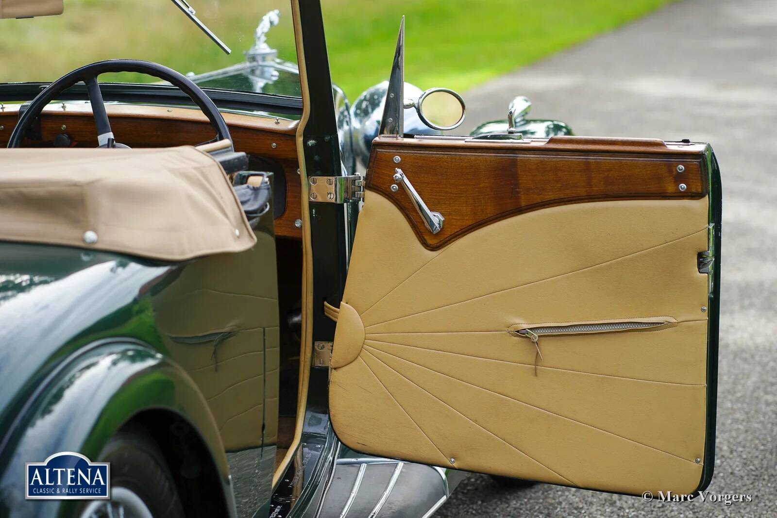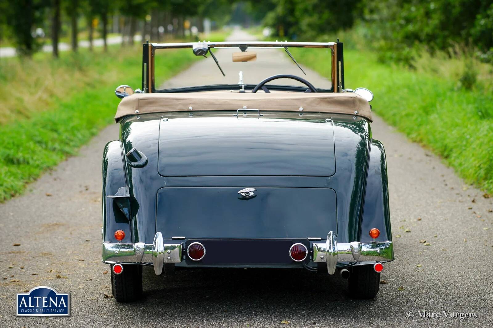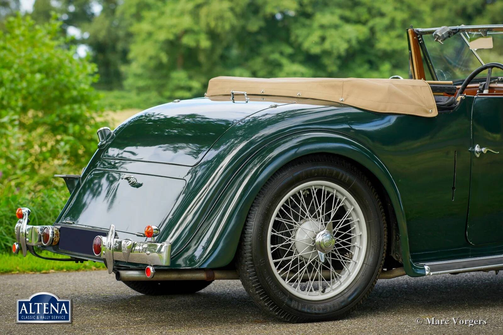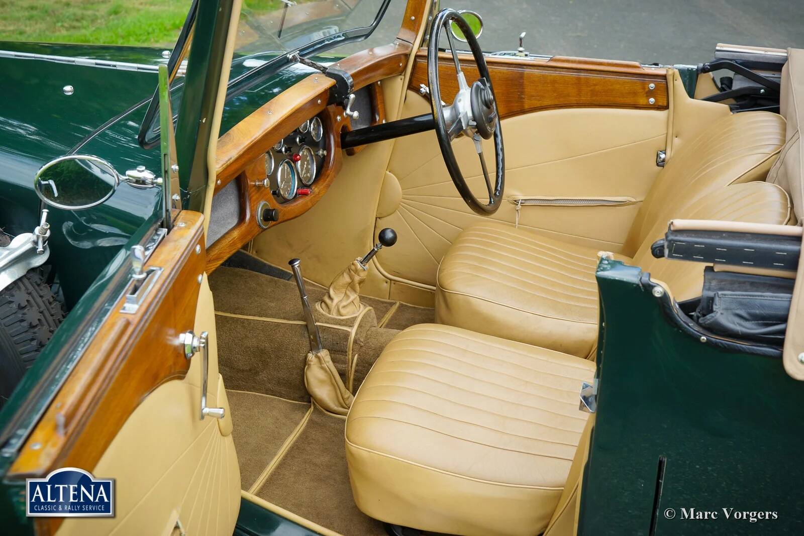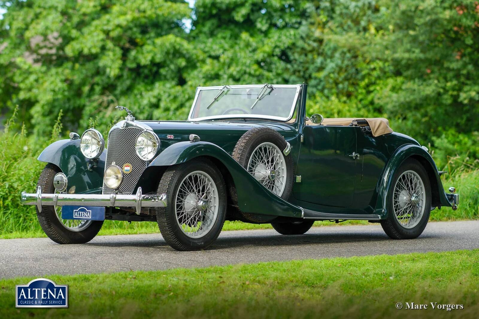 AC (Acédès) 16/66 Drophead Coupe, jaar 1935. Chassisnummer L34X, motornummer UBS.29X. Originele Britse registratie: DPC918. Kleur donker British Racing Green gecombineerd met een beige lederen interieur en lichtbruin tapijt afgezet met beige randen. De auto is voorzien van een zwarte vinyl kap en een lichtbruine mohair tonneau cover.