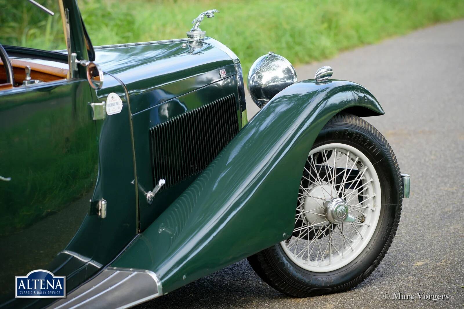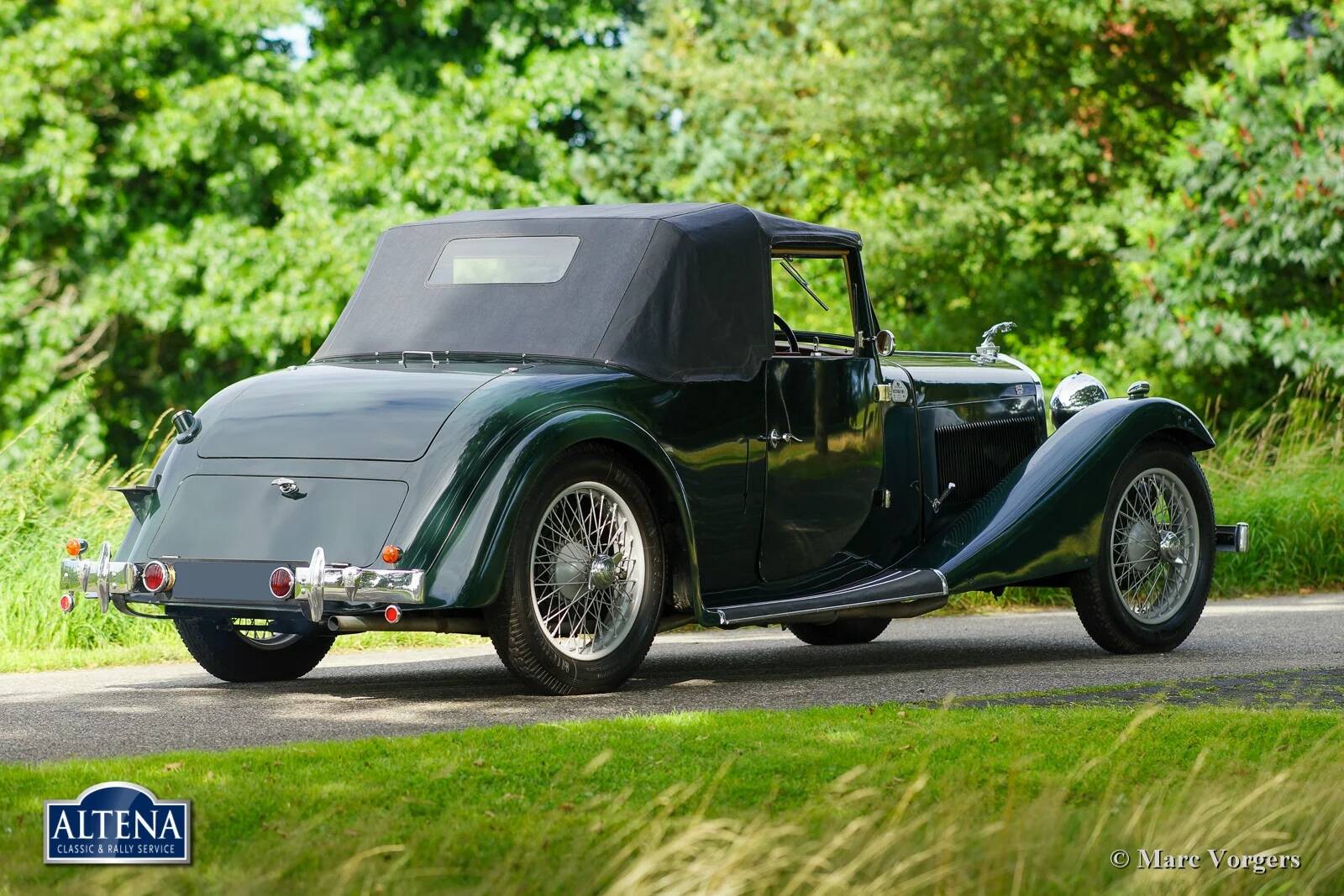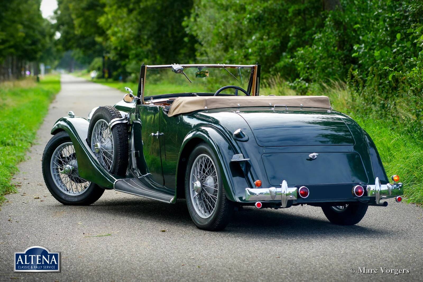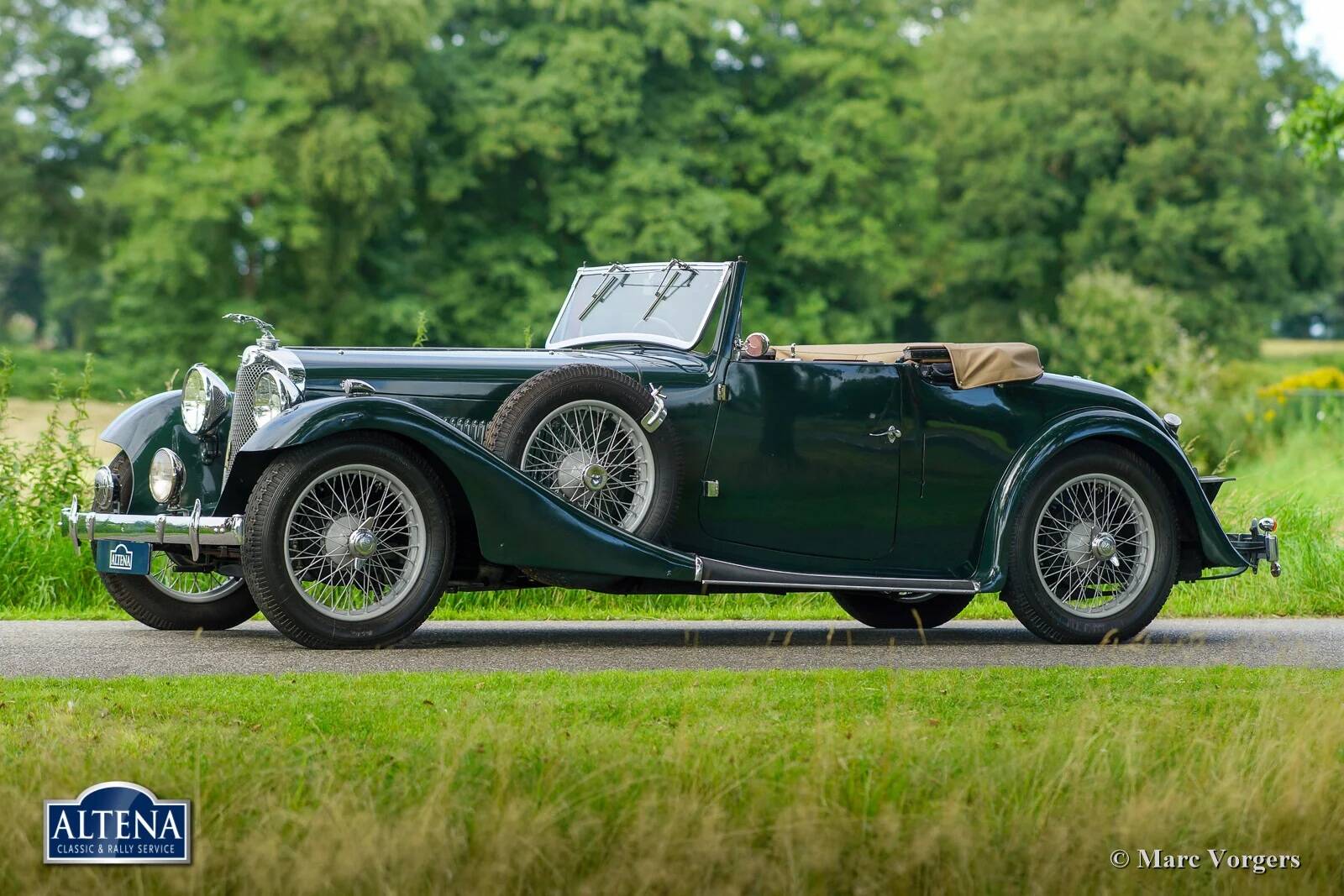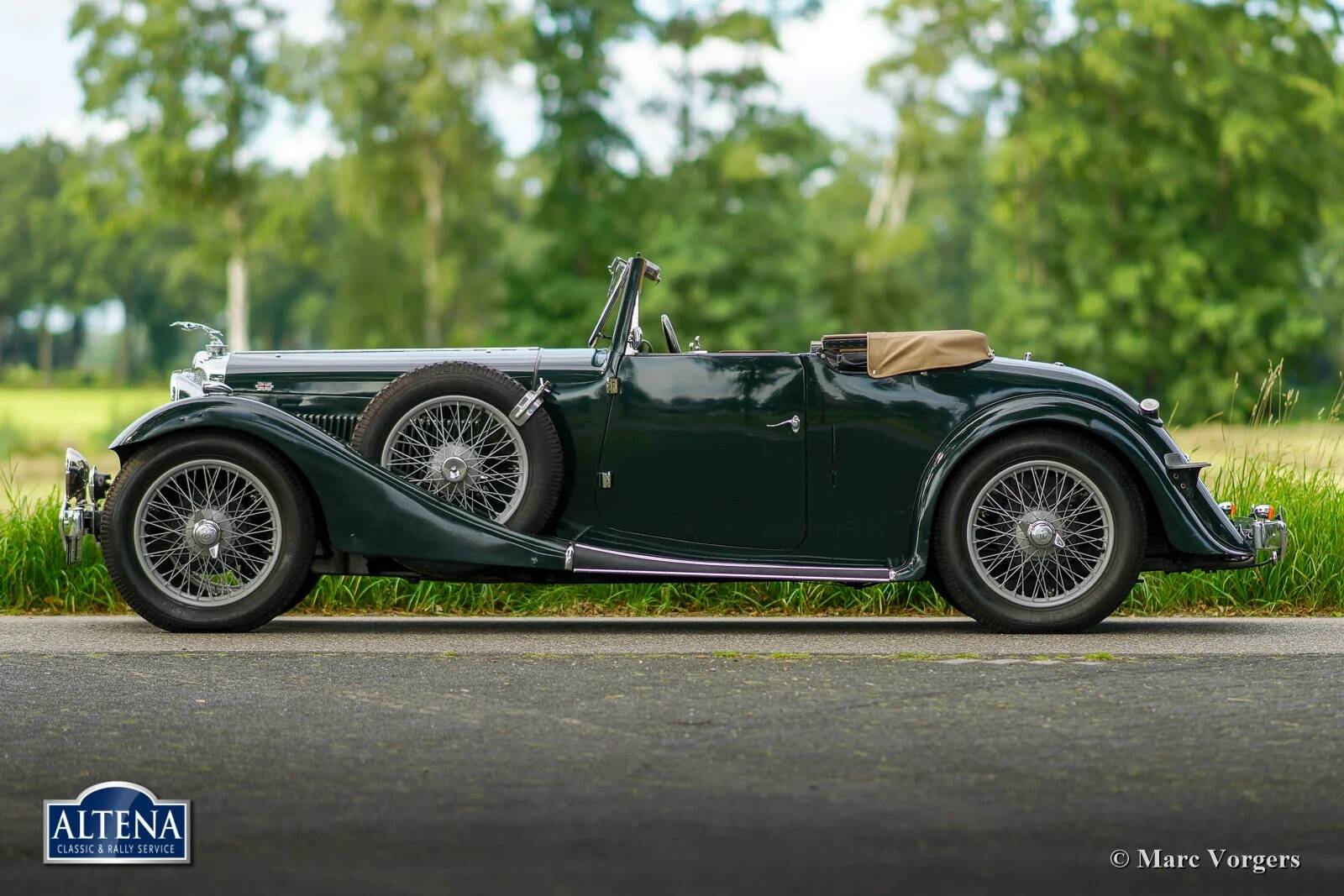 AC (Acédès) 16/66 Drophead Coupe, jaar 1935. Chassisnummer L34X, motornummer UBS.29X. Originele Britse registratie: DPC918. Kleur donker British Racing Green gecombineerd met een beige lederen interieur en lichtbruin tapijt afgezet met beige randen. De auto is voorzien van een zwarte vinyl kap en een lichtbruine mohair tonneau cover.