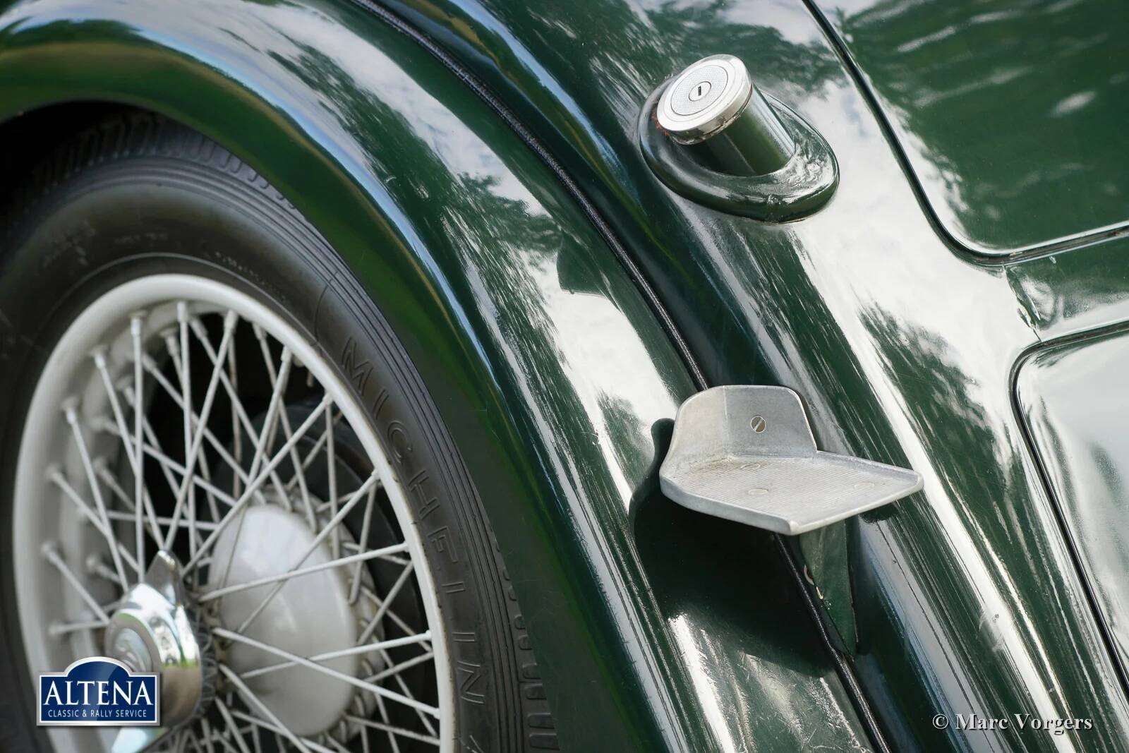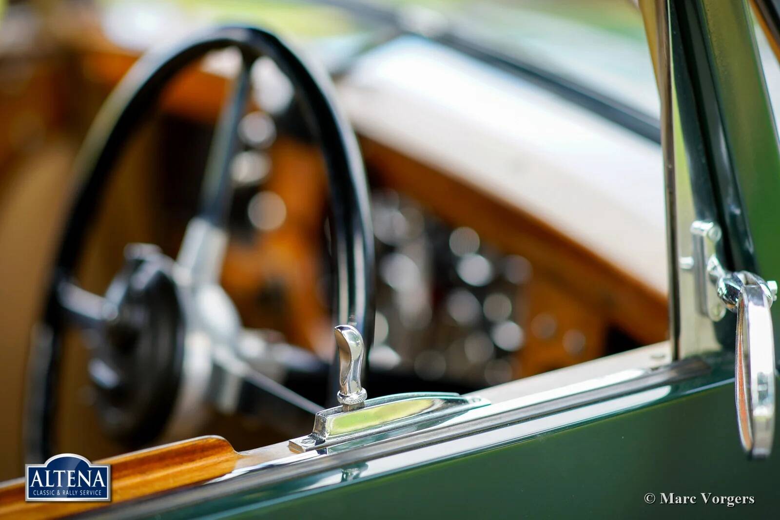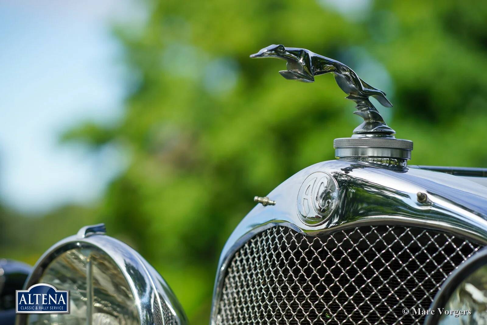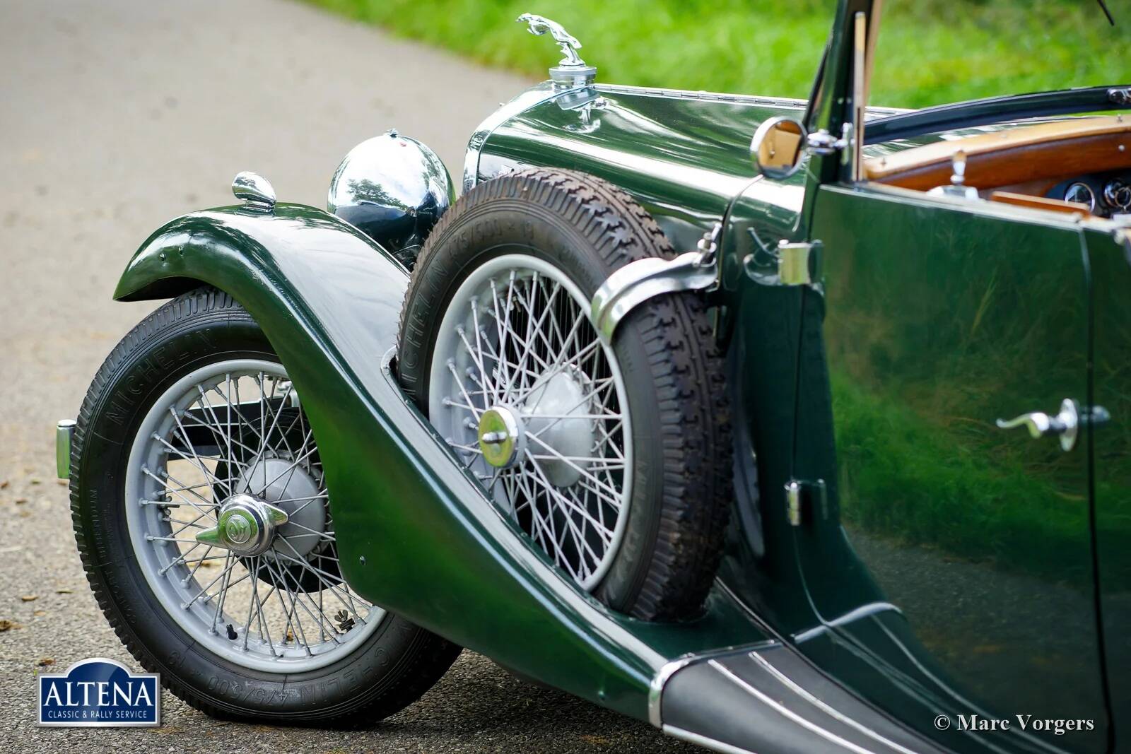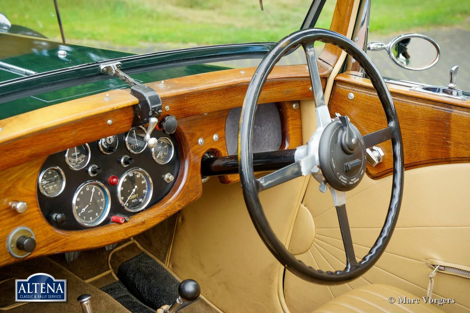 AC (Acédès) 16/66 Drophead Coupe, jaar 1935. Chassisnummer L34X, motornummer UBS.29X. Originele Britse registratie: DPC918. Kleur donker British Racing Green gecombineerd met een beige lederen interieur en lichtbruin tapijt afgezet met beige randen. De auto is voorzien van een zwarte vinyl kap en een lichtbruine mohair tonneau cover.