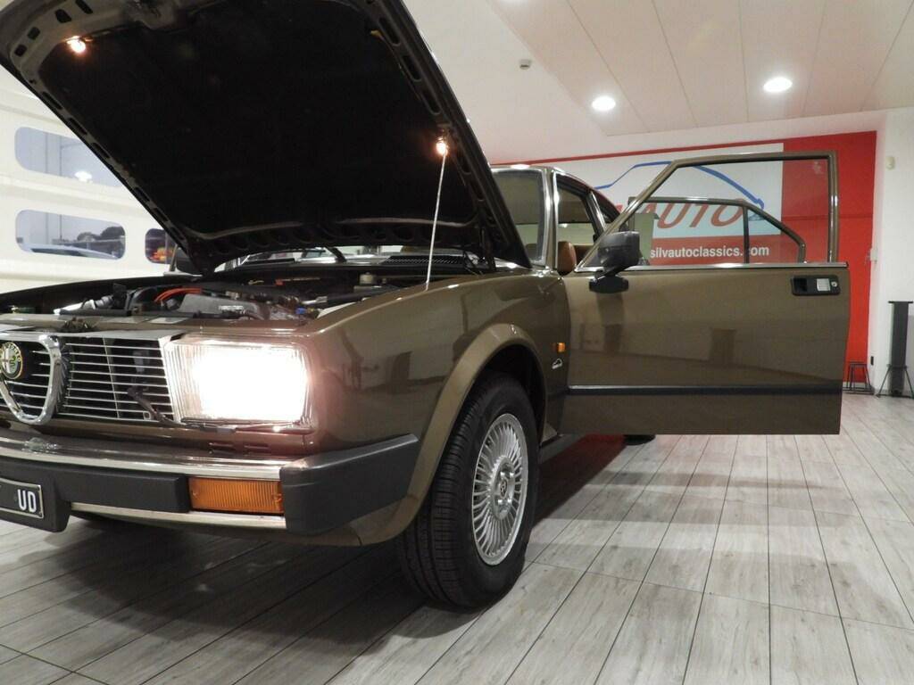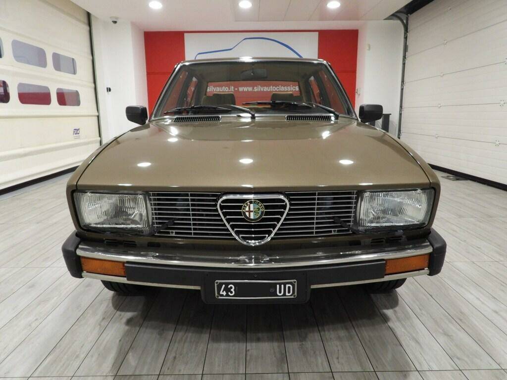 Sedili con poggiatesta anteriori regolabili e posteriori e pannelli in tessuto ciniglia nocciola e Tex Alfa sky cinghiale, Cinture di sicurezza con arrotolare anche su sedili posteriori, Moquette al pavimento in lana nocciola, Volante a tre razze con corona in legno coordinato con pomello del cambio, Aria condizionata, Vetri elettrici anteriori, Doppio specchio esterno Alfa Romeo Vitaloni, Autoradio Blaupunkt Stockholm R26 AM/FM a cassetta stereo 7 con antenna radio incorporata nel parabrezza e casse Alfa Romeo ai pannelli anteriori, Bracciolo posteriore, Lavatergifari, Paraurti e tubo di scarico in acciaio inox, Cerchi in lega Alfa Romeo Campagnolo Millerighe con pneumatici 185/70 R14 Pirelli Cinturato P4, Tappo serbatoio Alfa Romeo con chiavi originali Alfa Romeo