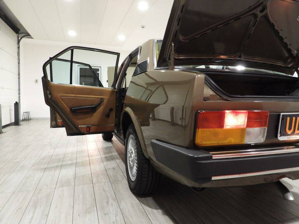 Seats with adjustable front and rear headrests and panels in hazelnut chenille fabric and Alfa Sky Tex wild boar fabric, seat belts with retractable belts also on the rear seats, hazelnut wool carpeting, three-spoke steering wheel with matching wooden rim and gear knob, air conditioning, electric front windows, Alfa Romeo Vitaloni double exterior mirrors, Blaupunkt Stockholm R26 AM/FM stereo cassette radio with radio antenna built into the windshield and Alfa Romeo speakers in the front panels, rear armrest, headlight washers, stainless steel bumpers and exhaust pipe, aluminum wheels Alfa Romeo Campagnolo Millerighe alloy with 185/70 R14 Pirelli Cinturato P4 tires, Alfa Romeo fuel cap with original Alfa Romeo keys
