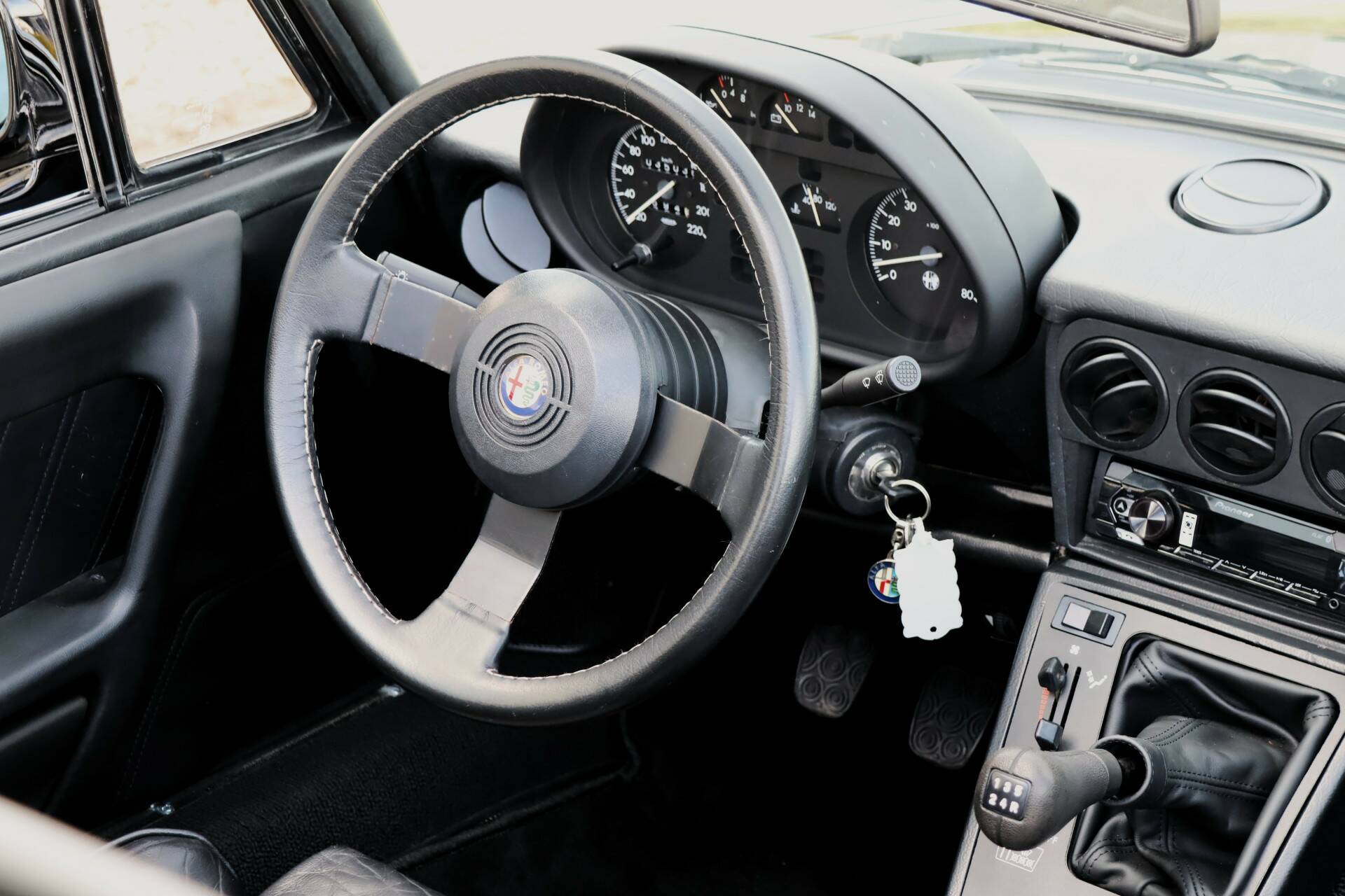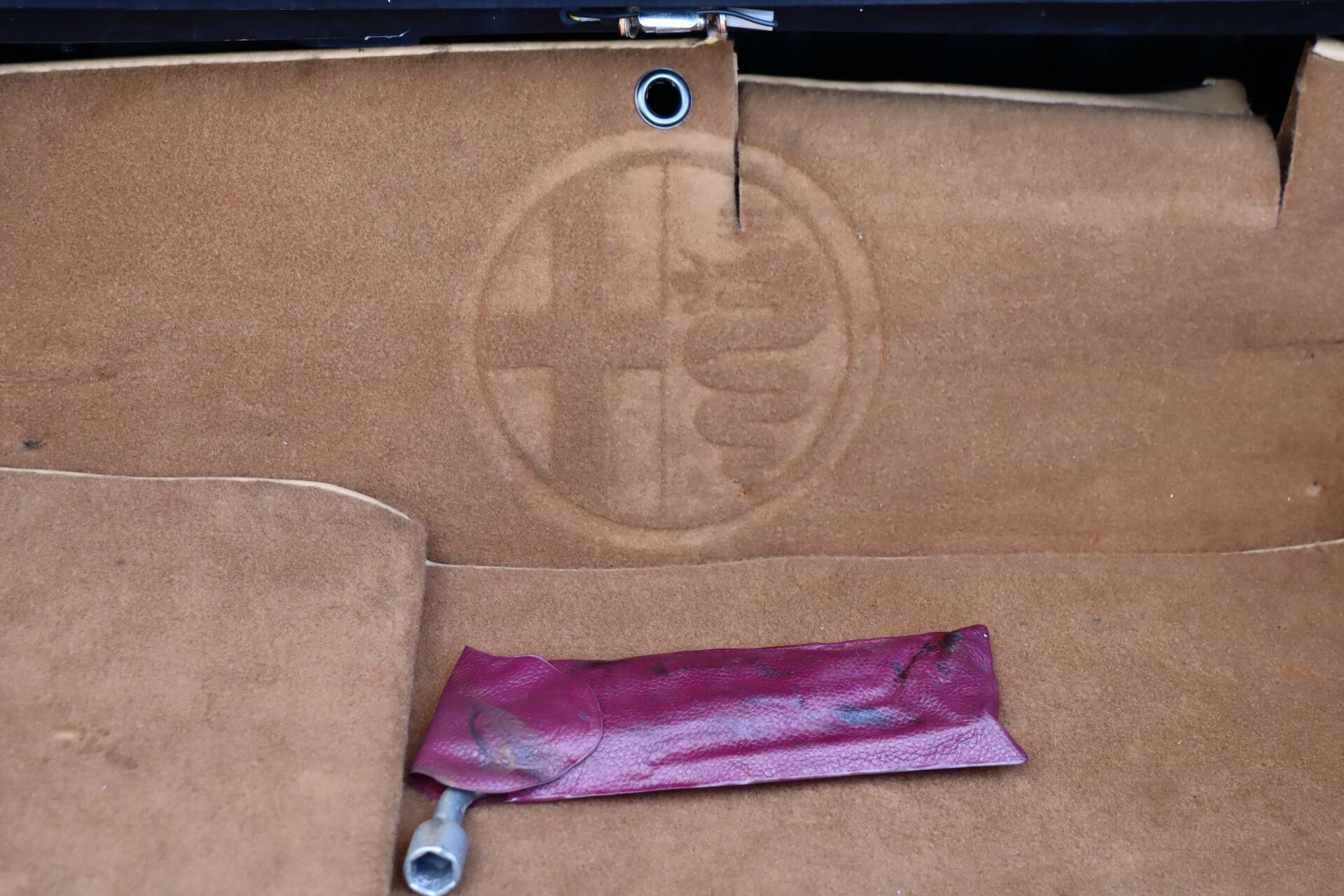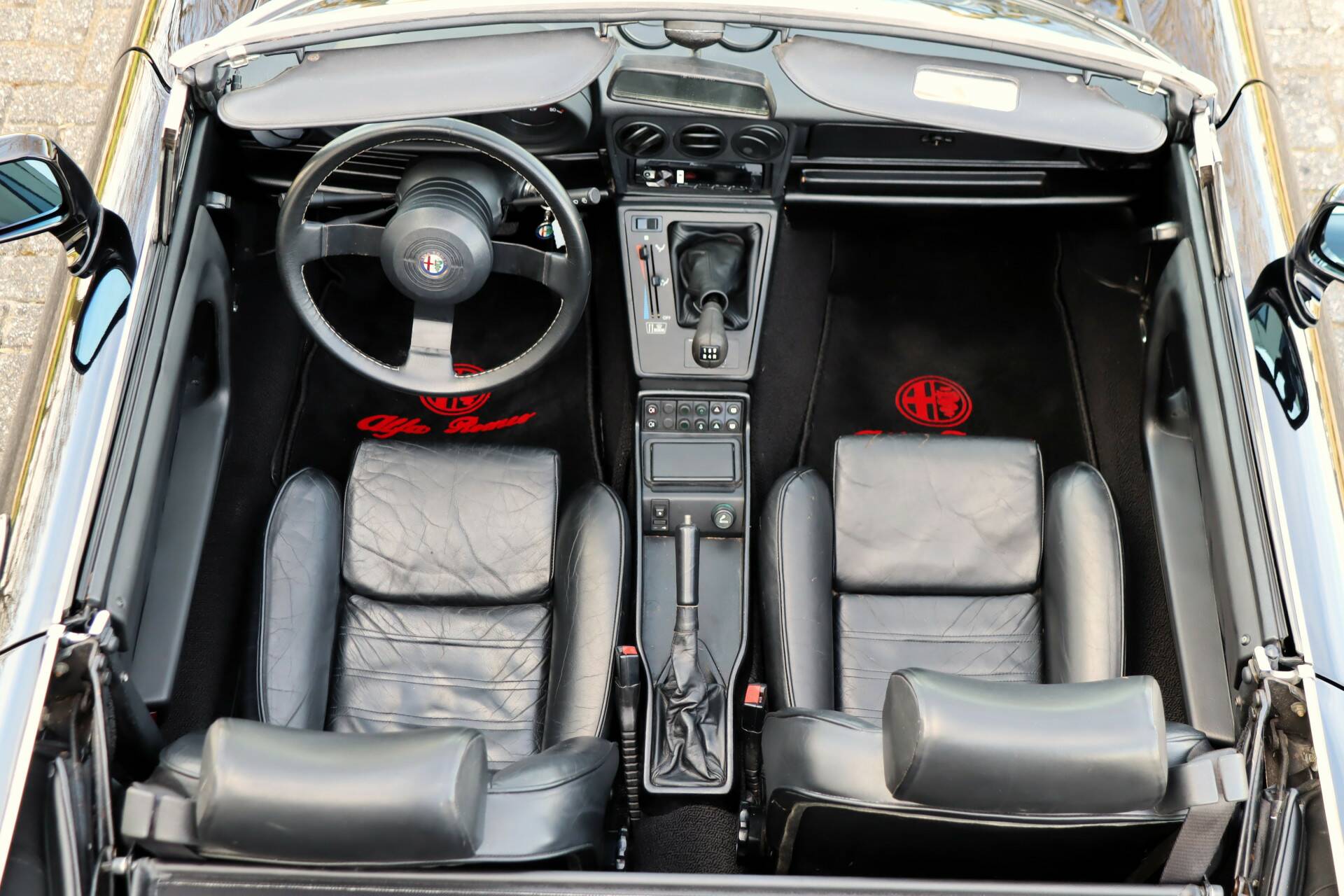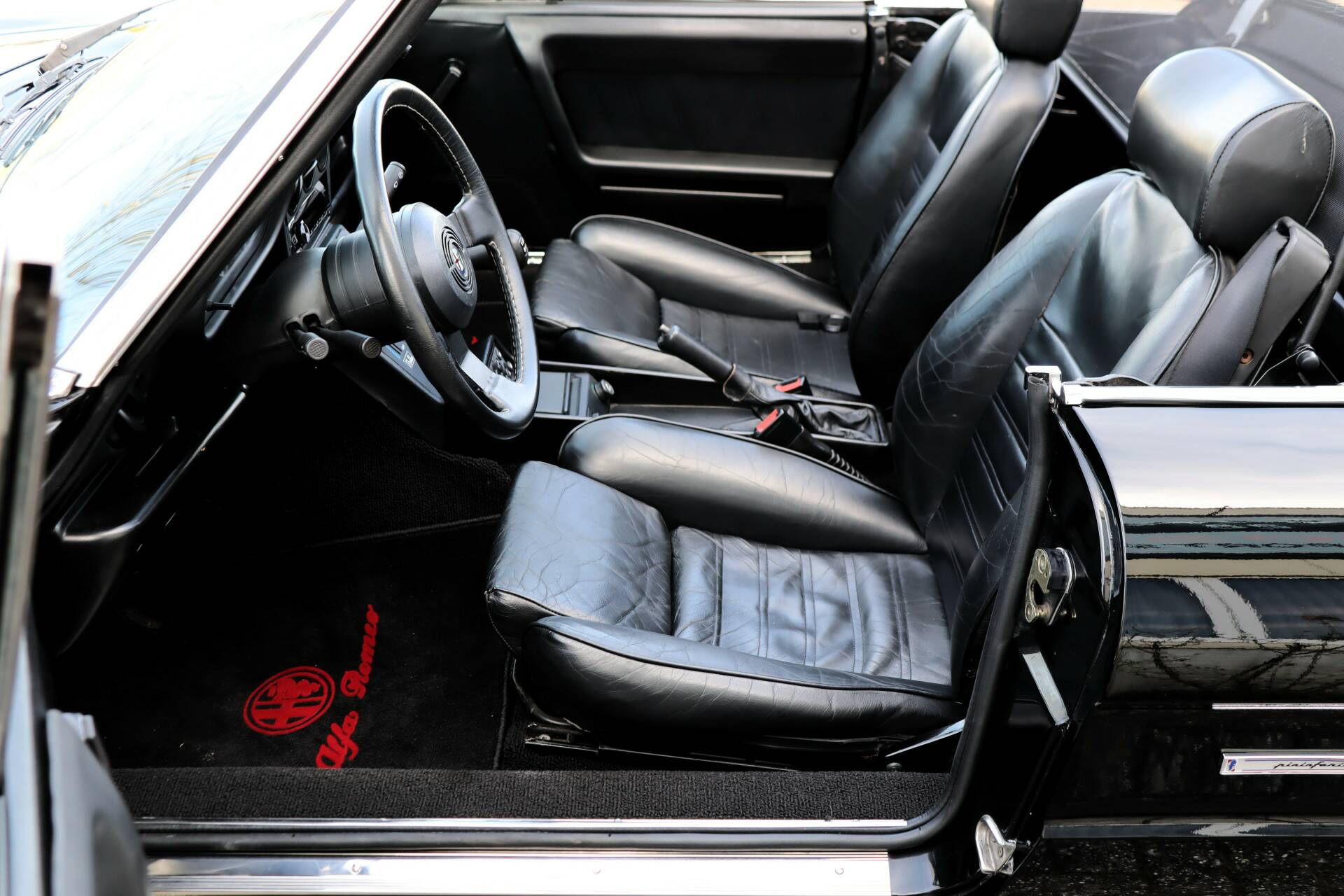 Het fraaie lederen interieur is volledig in zwart uitgevoerd en verkeert in zeer goede staat zonder beschadigingen. Ook het dashboard is nog fris. De stoelen zitten heerlijk en op de vloer liggen keurige Alfa Romeo matten. Bijzonder is de nette staat van de knoppen en tellers. Ook het stuurwiel en de pookknop verkeren nog in bijzonder gave conditie. Verder is het interieur voorzien van onder meer een nieuwe Pioneer radio met bluetooth, elektrisch bedienbare spiegels en elektrisch bedienbare ramen. Tevens is een windscherm aanwezig. Ook de kofferruimte is netjes en deze is voorzien van beige bekleding. In het onderste compartiment is het reservewiel geplaatst. Er is nog een kleiner compartiment aanwezig dat plaats biedt aan bijvoorbeeld gereedschap.