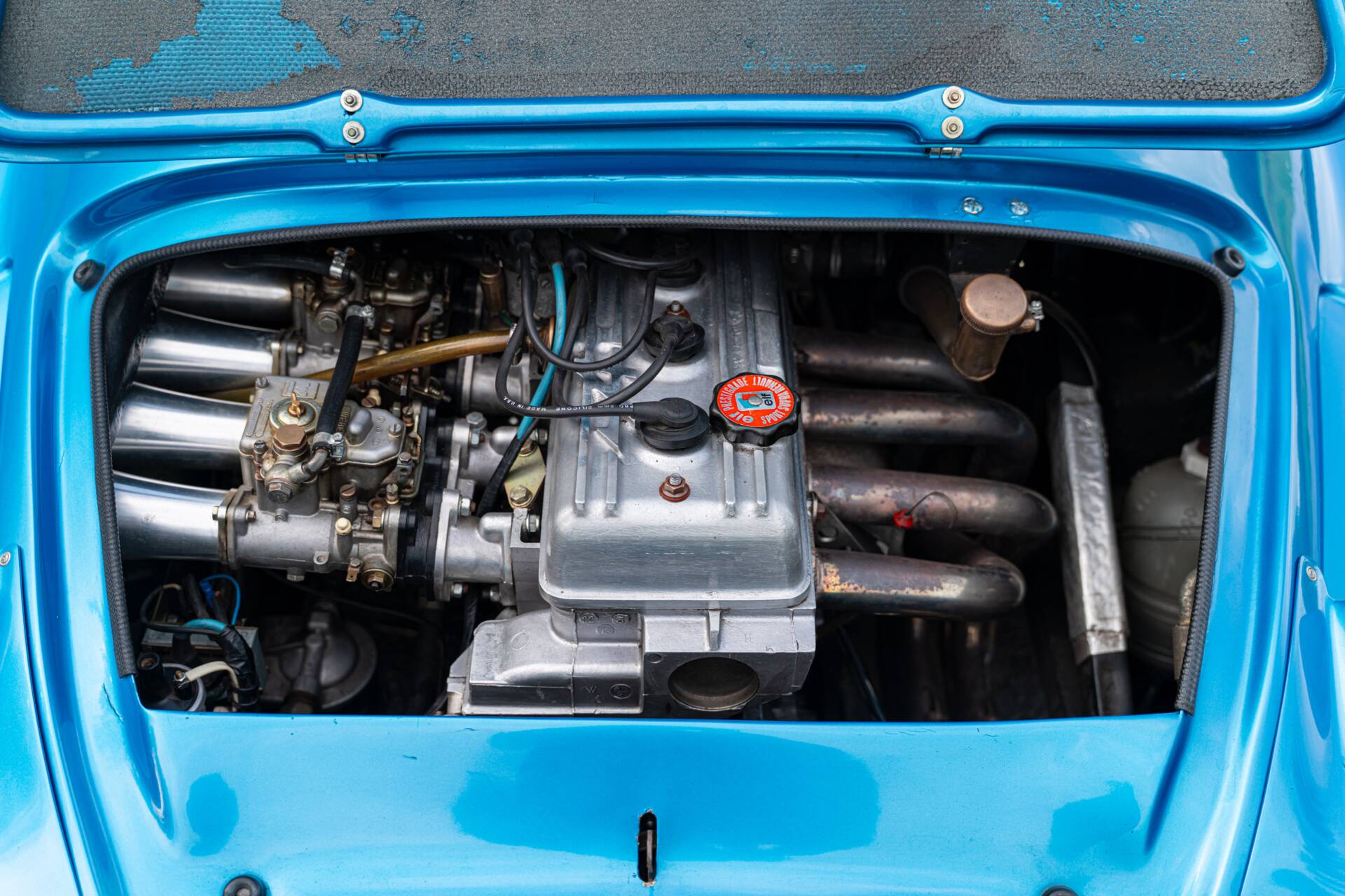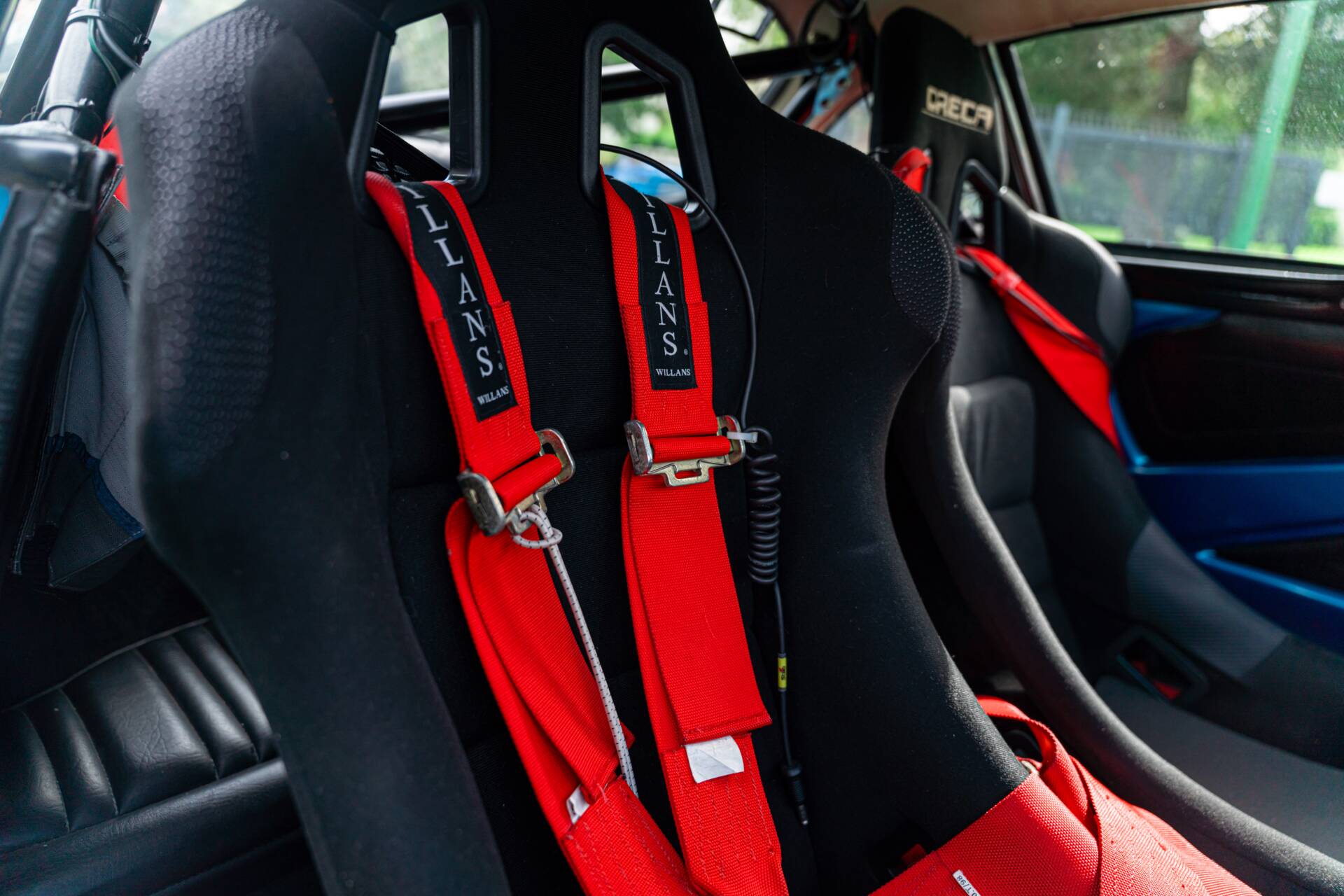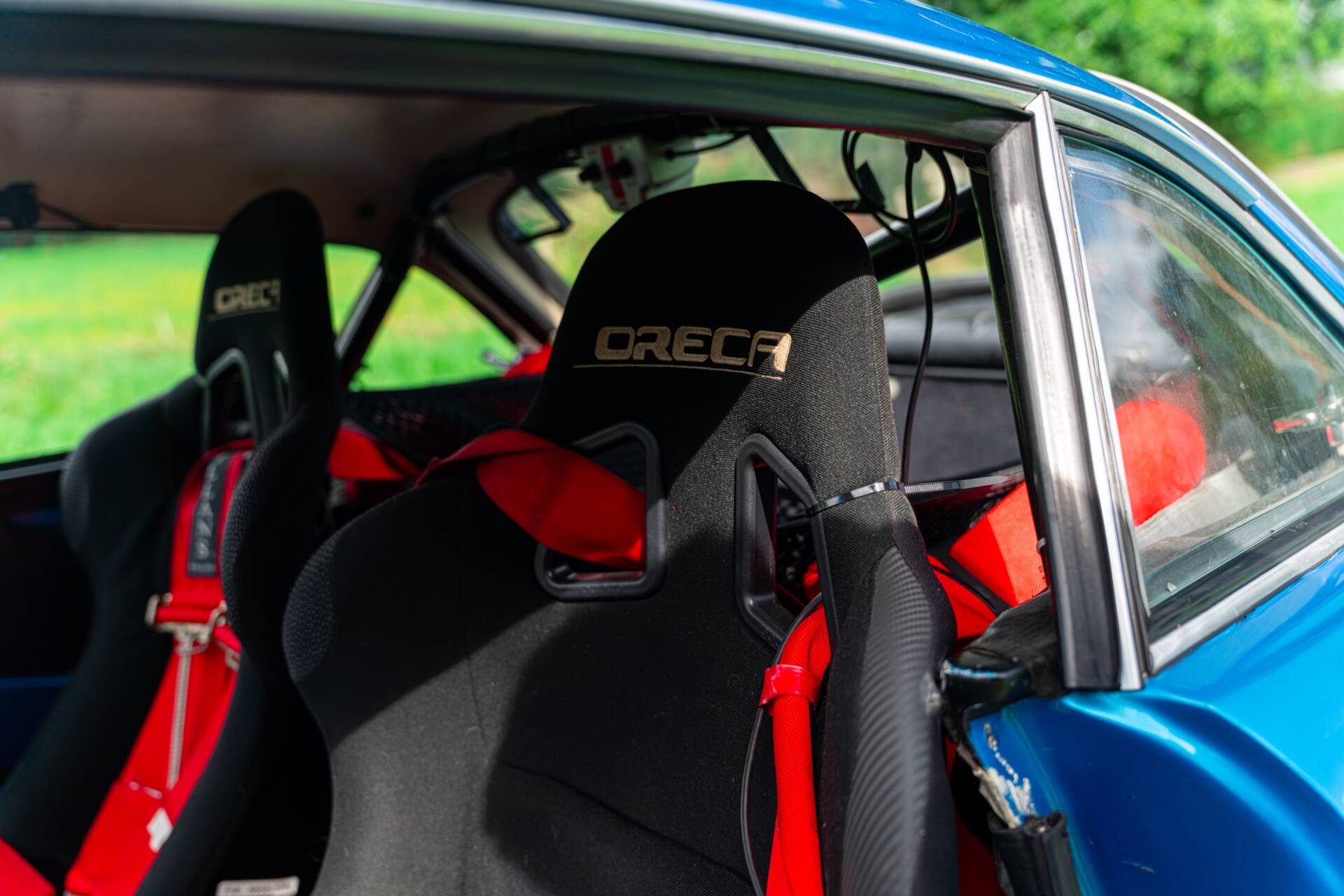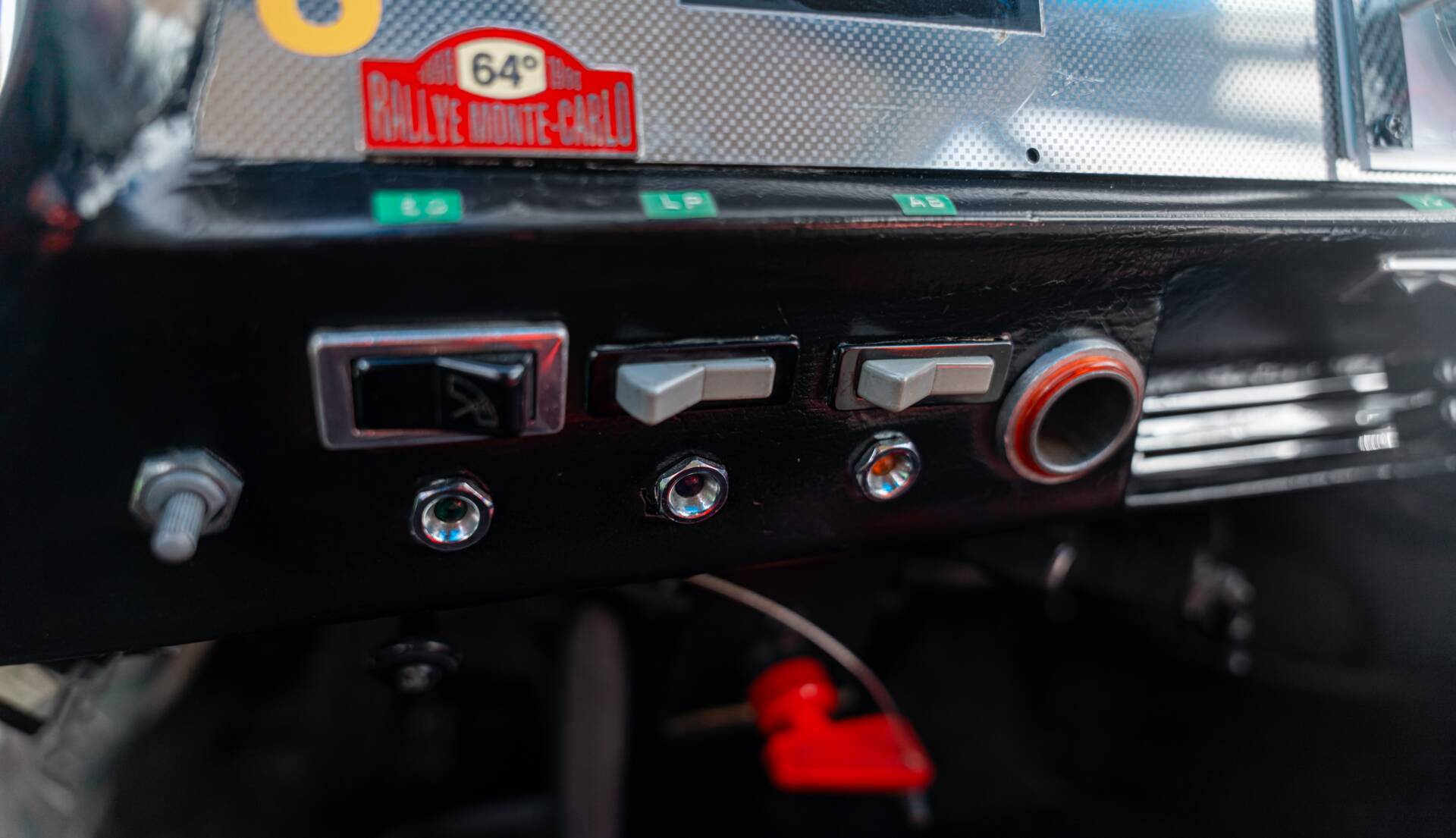 Aujourd’hui, la carrosserie et la peinture sont saines et en très bon état, tout comme l’habitacle qui dispose de tous les éléments nécessaires à la participation à des courses historiques : extincteur, système intercom, chronomètres, baquets avec harnais, arceau, etc.