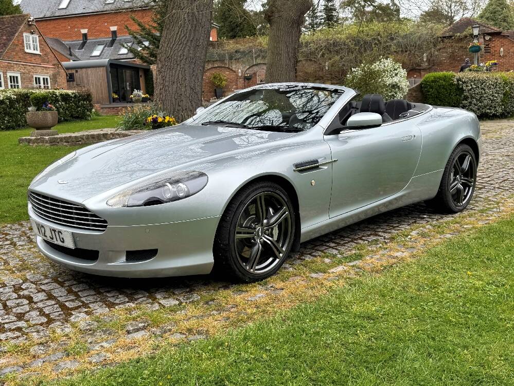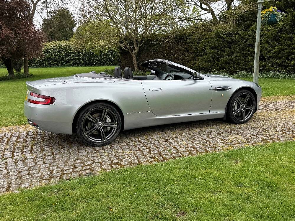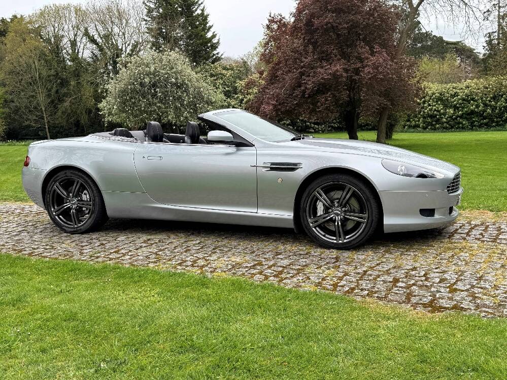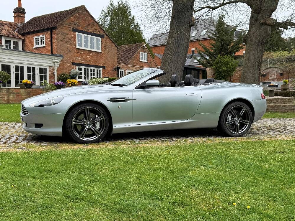2009 Aston Martin DB9 Volante finished in Titainium Silver with Obsidian black hide interior with contrasting white stitching and a fully retractable black mohair soft top. This superb low mileage example comes with a fully stamped up service book with 17 service stamps from Aston Martin main dealers and the final stamp from a well respected Aston Martin specialist. The car is in unmarked condition both inside and out and the specification includes a Piano black centre console complete with Glass key, Charcoal headlining, electric heated seats with lumbar support, Satelite navigation and cruise control. The DB9 provides an effortless driving experience and it is rare to find a 17 year old example with such low mileage in this exceptional condition.