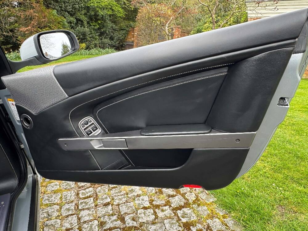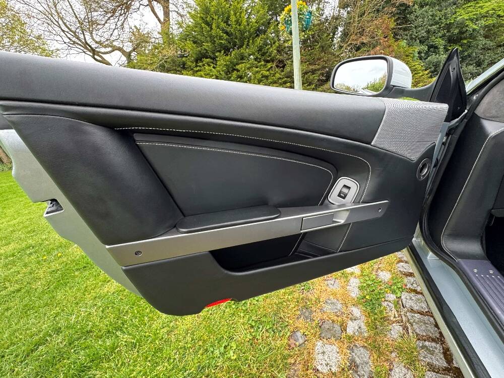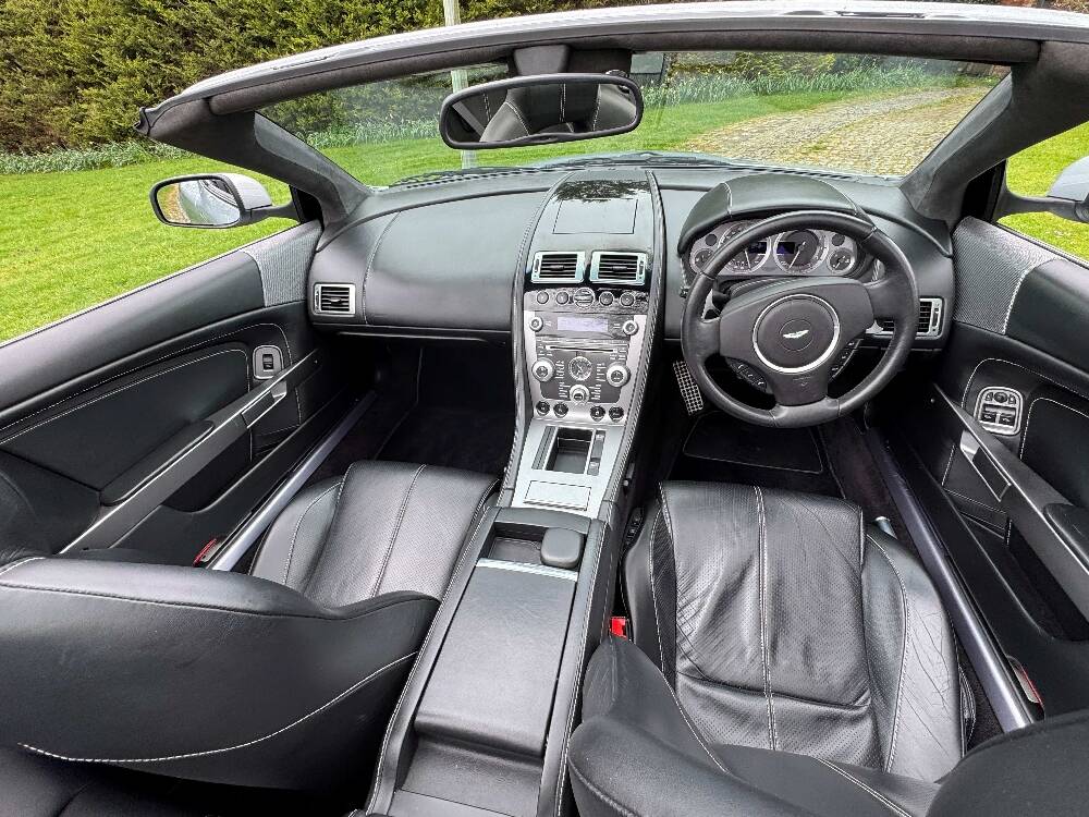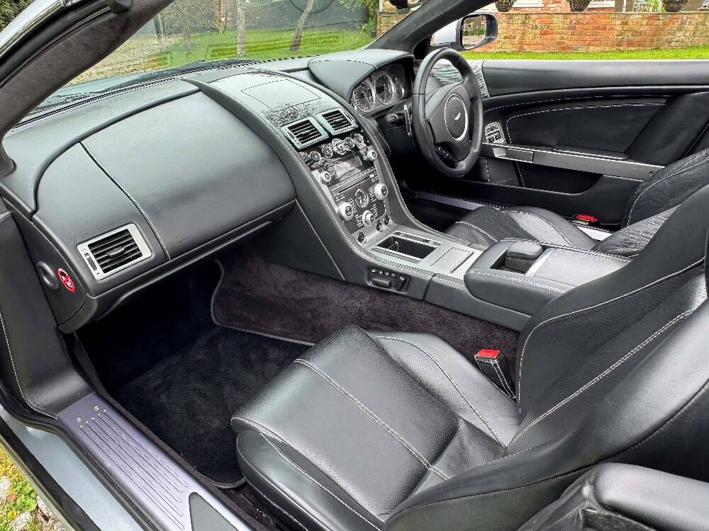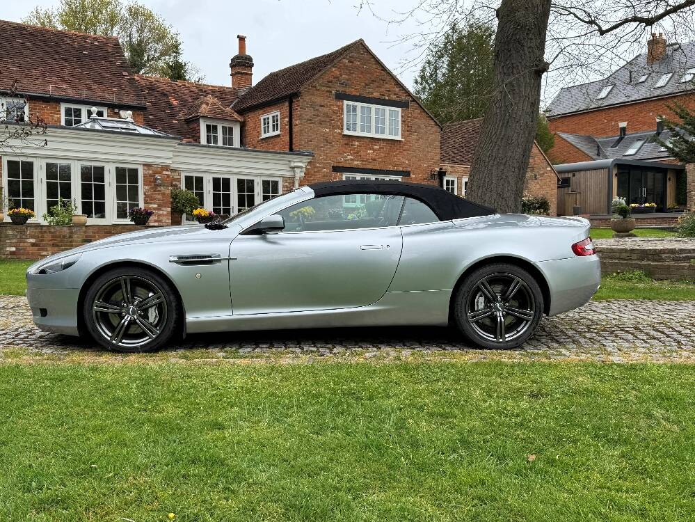 2009 Aston Martin DB9 Volante finished in Titainium Silver with Obsidian black hide interior with contrasting white stitching and a fully retractable black mohair soft top. This superb low mileage example comes with a fully stamped up service book with 17 service stamps from Aston Martin main dealers and the final stamp from a well respected Aston Martin specialist. The car is in unmarked condition both inside and out and the specification includes a Piano black centre console complete with Glass key, Charcoal headlining, electric heated seats with lumbar support, Satelite navigation and cruise control. The DB9 provides an effortless driving experience and it is rare to find a 17 year old example with such low mileage in this exceptional condition.