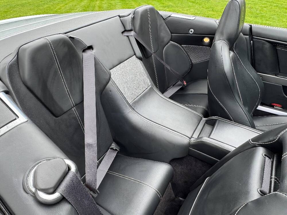 2009 Aston Martin DB9 Volante finished in Titainium Silver with Obsidian black hide interior with contrasting white stitching and a fully retractable black mohair soft top.