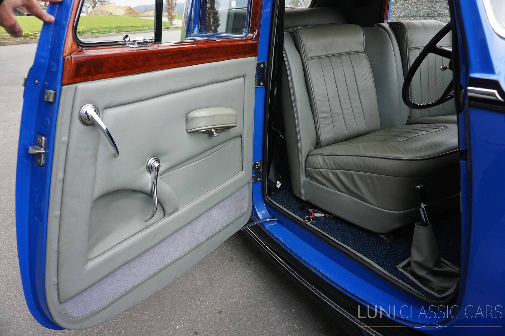 Der Innenraum ist grau gehalten und harmoniert durch seine Zurückhaltung perfekt mit den vielen Holzapplikationen. Gerade bei Bentley ist Holz nicht Dekoration, sondern Teil des Gesamteindrucks: Oberfläche, Haptik und Atmosphäre sind hier genauso wichtig wie Technik. Und technisch überzeugt dieses Exemplar ebenfalls: Der Motor wurde revidiert und läuft hervorragend, ebenso das Schaltgetriebe. Genau so, wie man es sich von einer älteren britischen Reiselimousine wünscht.