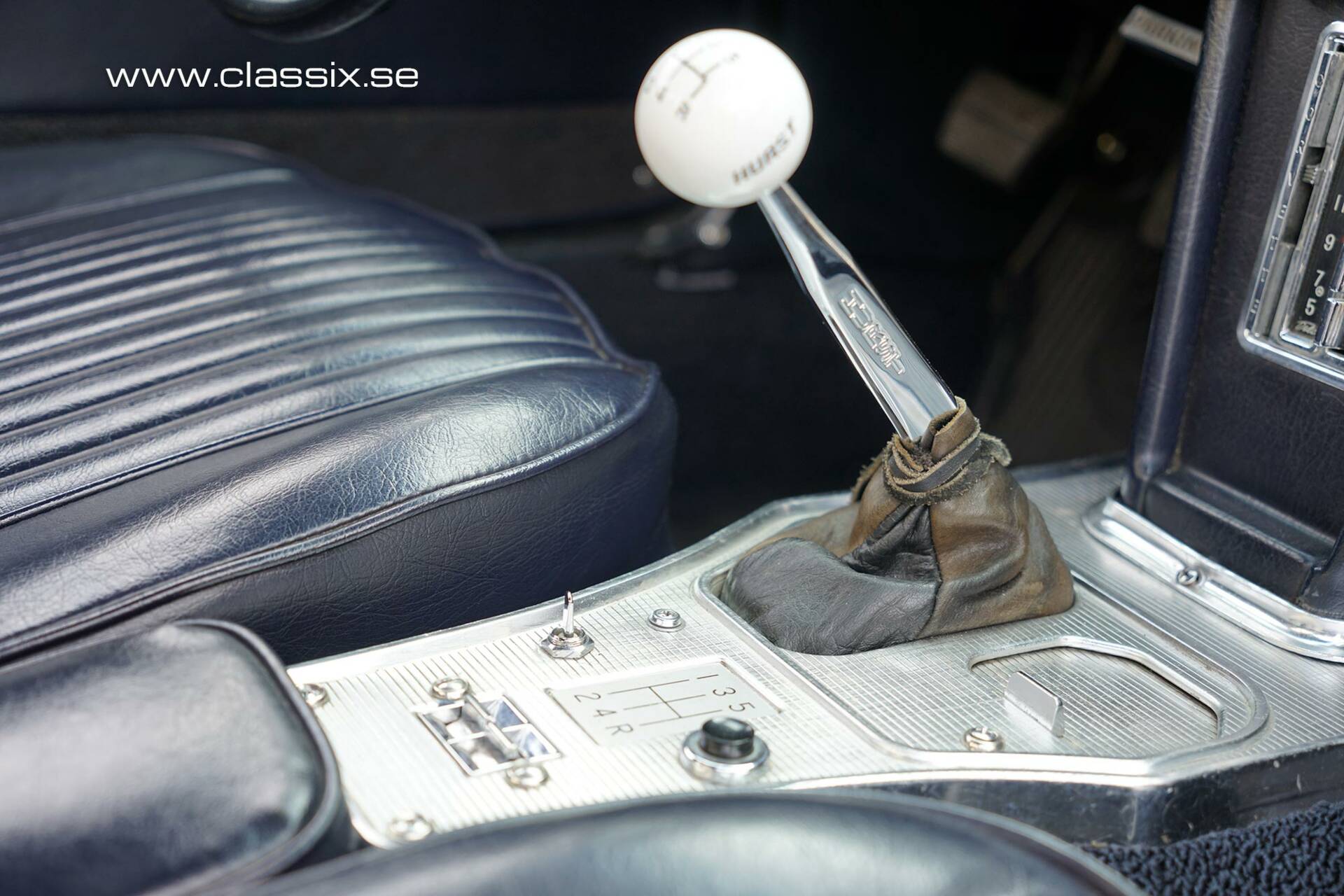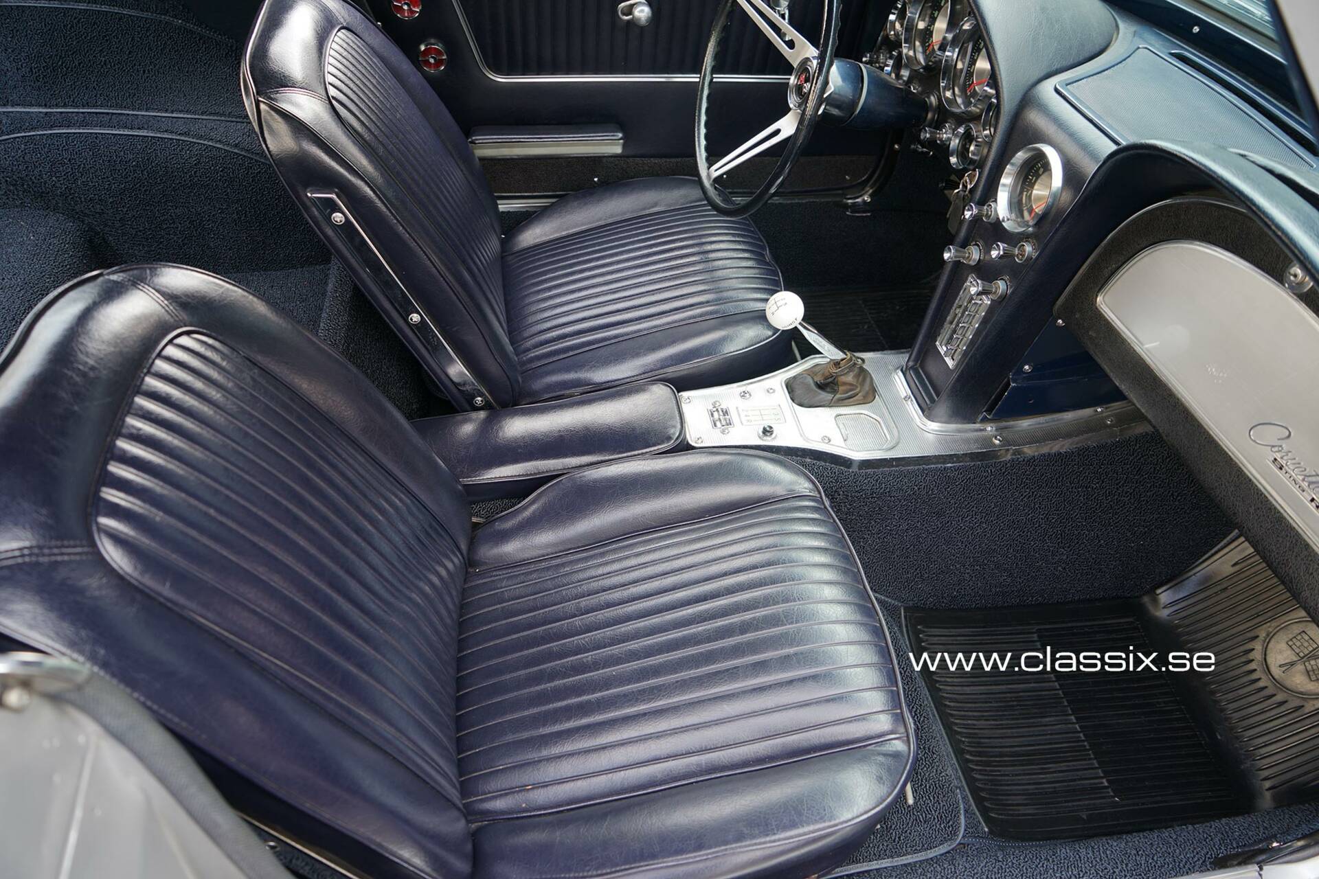 Interior: The seats are in dark blue American leather (vinyl). There is a typical loop style carpet in blue. Behind the seats, you have a large space to put your bags when you take the Corvette for those long Grand Touring trips. Seating position is comfortable and there is space also for tall drivers. Plenty of cool little chromed switches and gauges on the dashboard to give you that sixties airplane feeling.