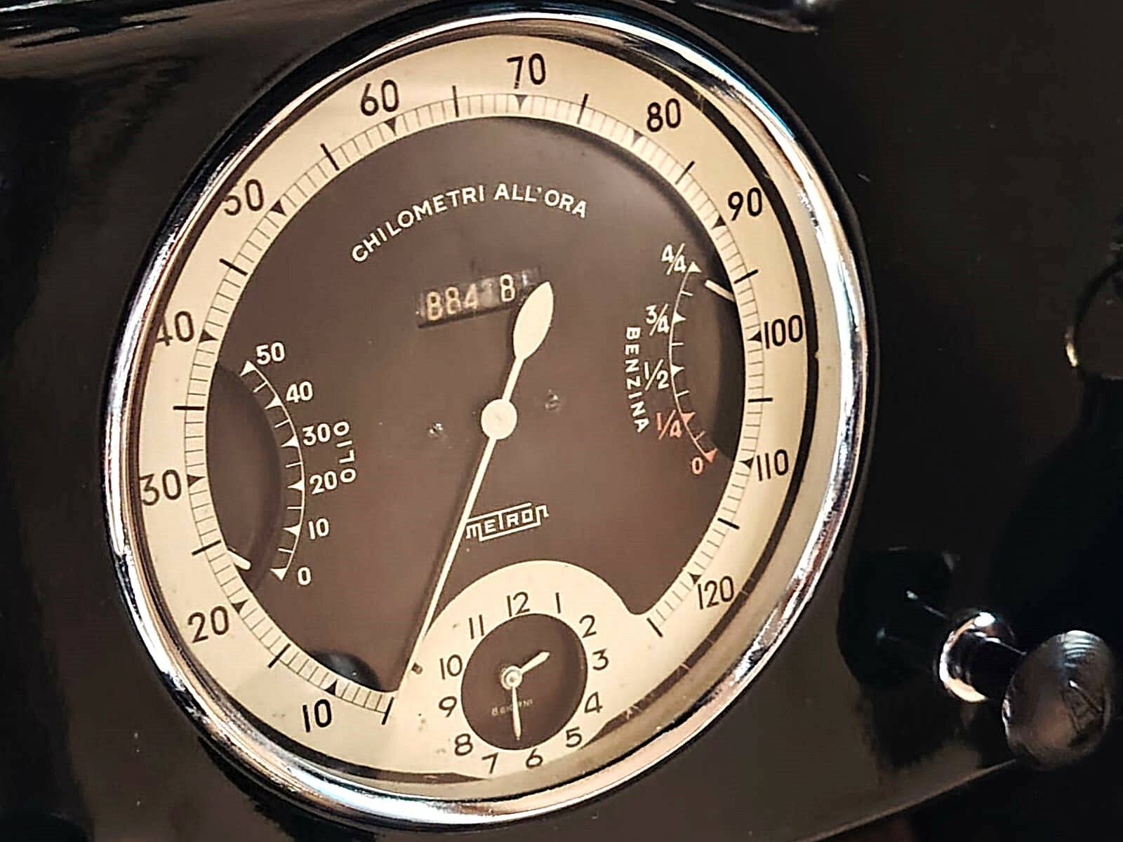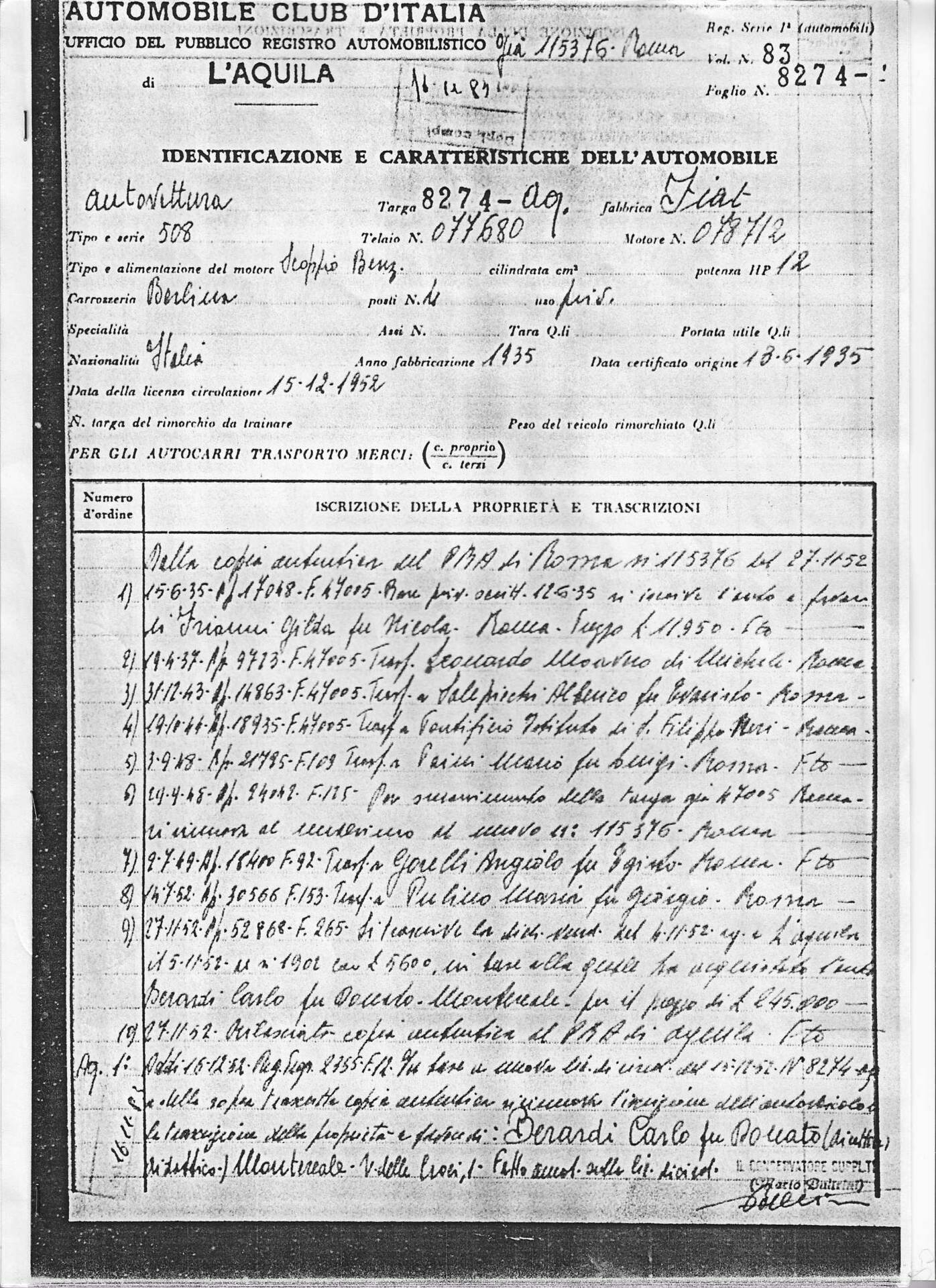Originally registered in Rome in 1935, the car was re-registered in L’Aquila in 1952 following a provincial change and still retains its period-correct license plates.