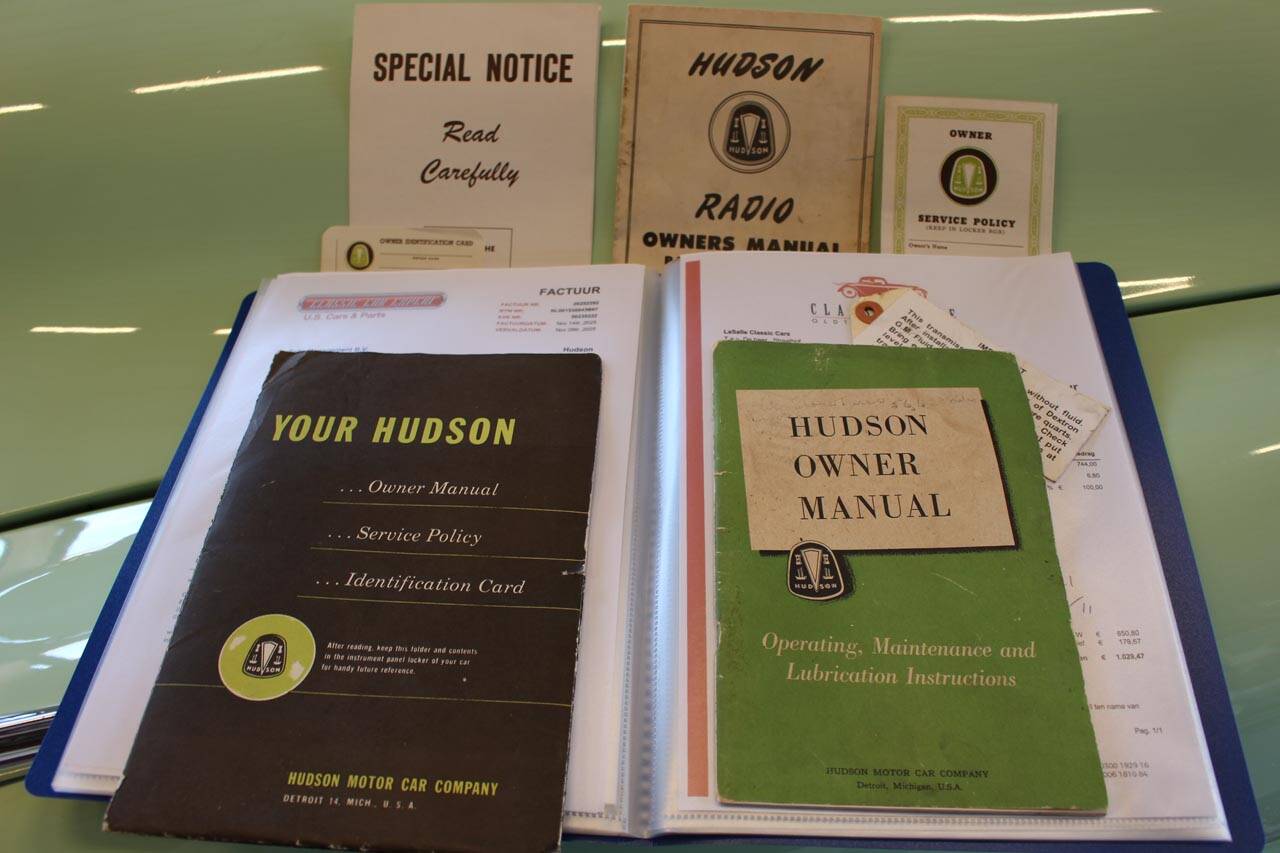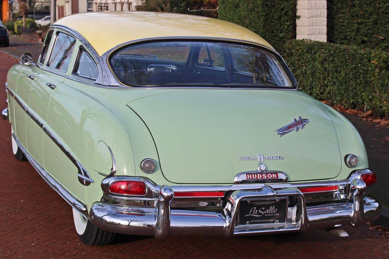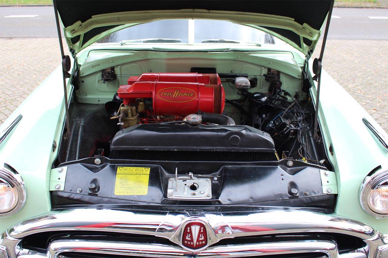 Deze ‘Fabulous’ Hudson Hornet voorzien van de optionele Twin H-Power L6 verkeert in uitstekende, gerestaureerde staat en komt oorspronkelijk uit Californië. Op een originele en roestvrije basis is deze Hornet in Nederland met veel aandacht gerestaureerd. Hierbij is het lakwerk herspoten in het originele kleurenschema (RV-153) van ‘Surf Green’ met een ‘Honey Cream’ dak. Het chromewerk is vernieuwd (zeer kostbaar) en het interieur is opnieuw bekleed. Ook in technisch opzicht is het nodige gebeurd, zo is de motor geheel gereviseerd. De originele Hydra-Matic automaat is recent door een specialist gereviseerd. Andere mechanische delen als remmen, uitlaat, radiateur, carburateurs, etc. zijn niet overgeslagen. Alles perfect werkend inclusief het klokje en de originele buizenradio. Bovendien zijn kleine aanpassingen uitgevoerd om het gebruiksgemak te vergroten zoals een Optima accu, elektrische benzinepomp, elektrische ruitenwisser motor, moderne luchtfilters en oliefilter. Verder is de Hornet onlangs voorzien van 5 nieuwe correcte banden. Alle originele documentatie is nog bij de auto aanwezig. Met deze Hornet op stap, rij je niet alleen zelf met een glimlach maar ook je medeweggebruikers! Nederlands kenteken.