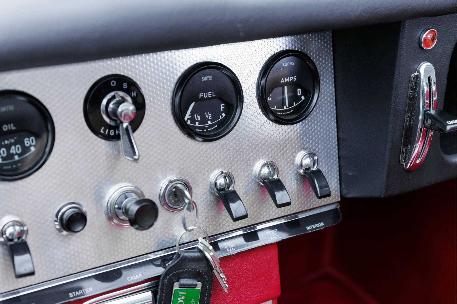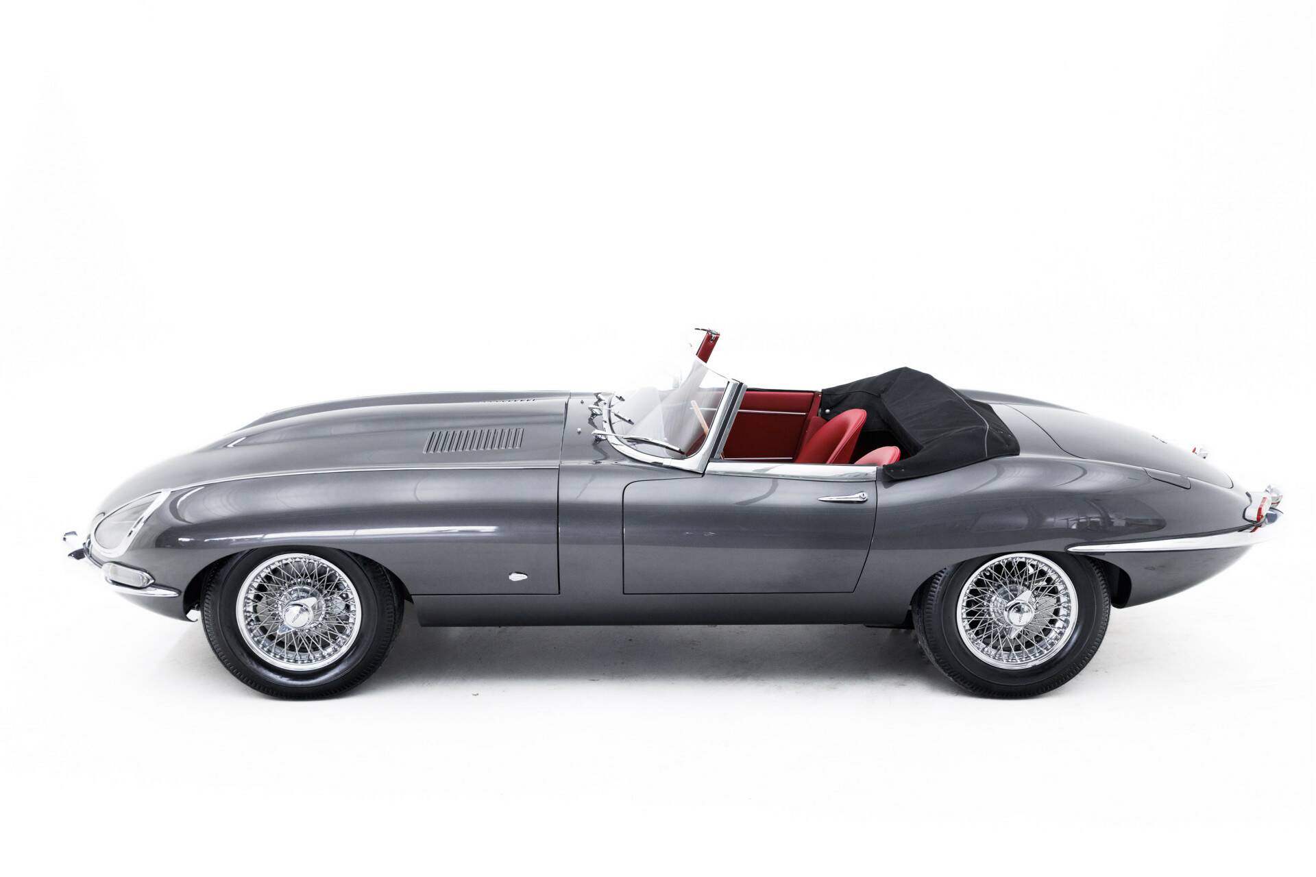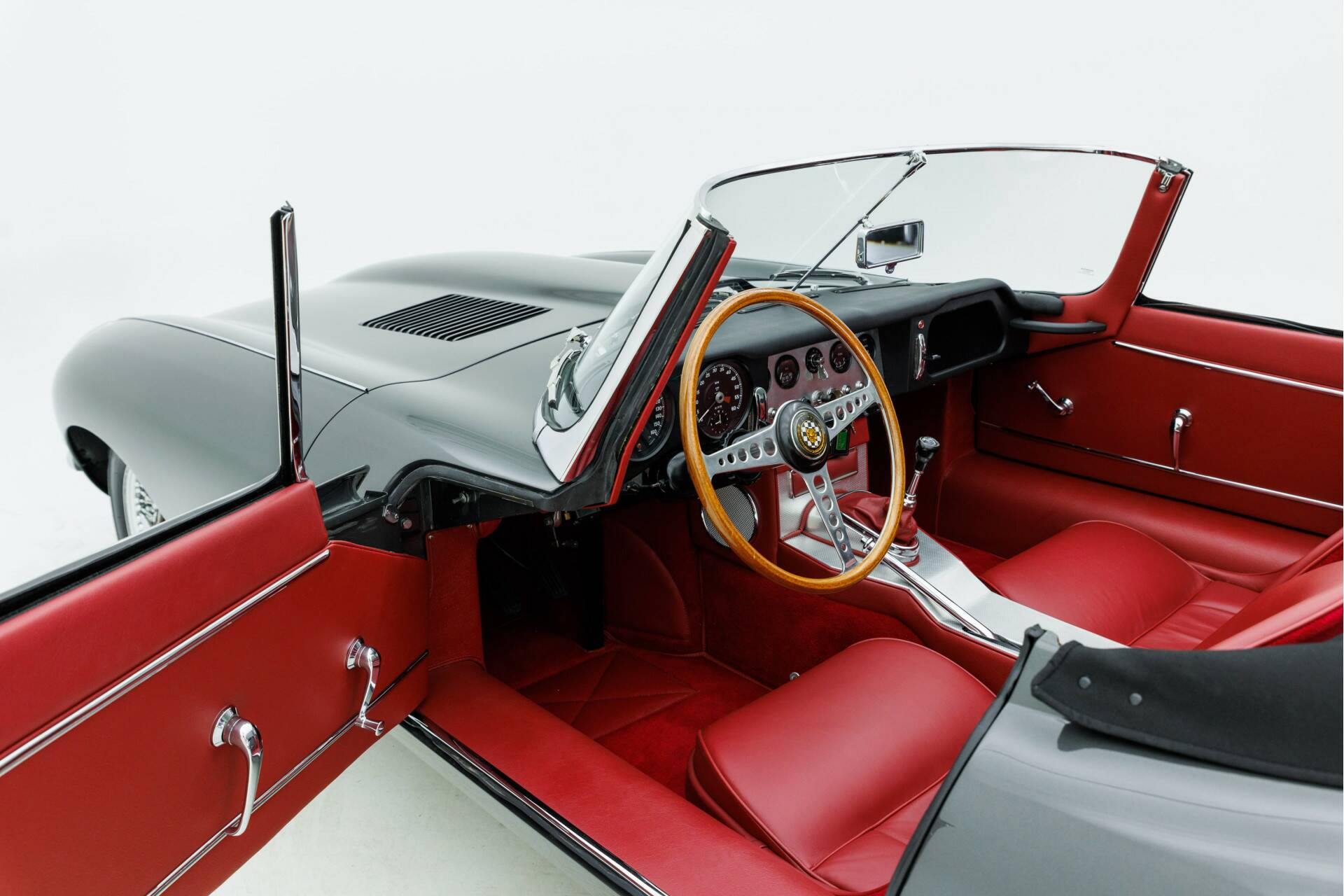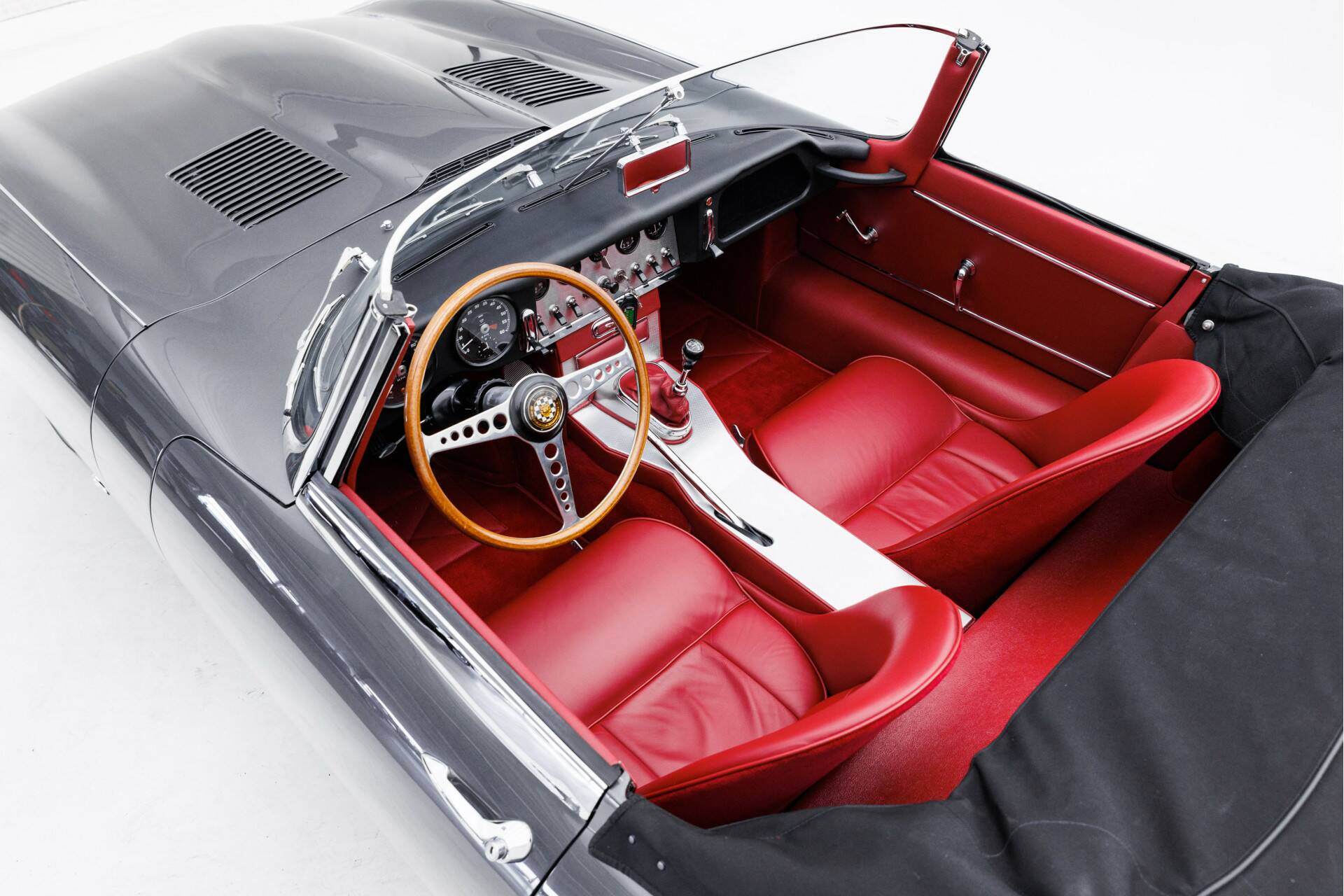 De E-type is uitgevoerd in de correcte en originele kleuren Gunmetal Grey met eenrood lederen interieur en een zwarte kap.