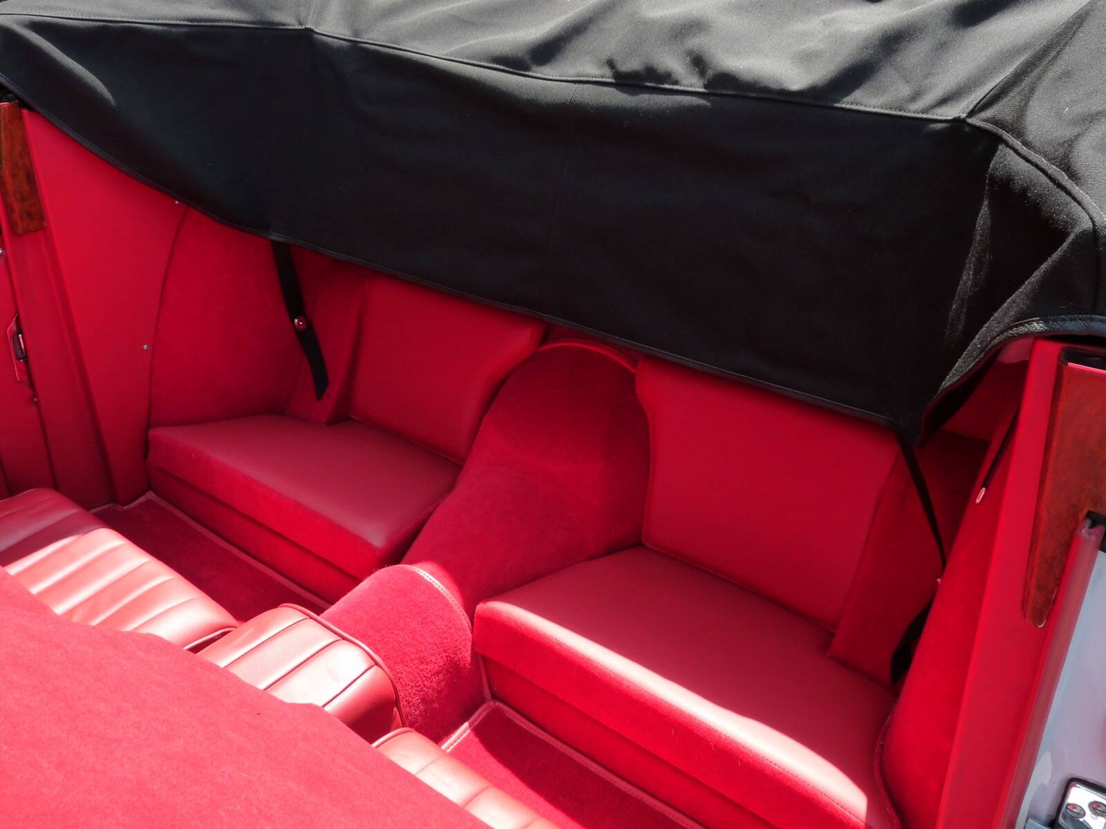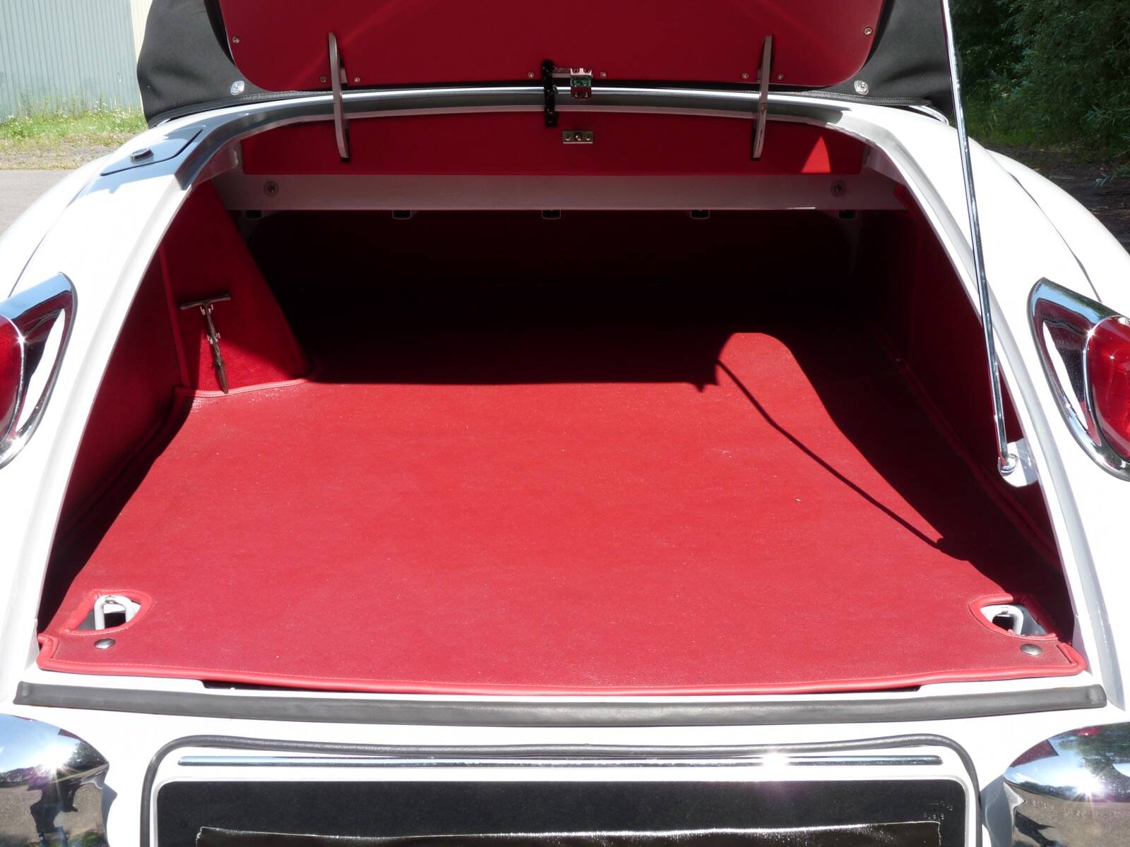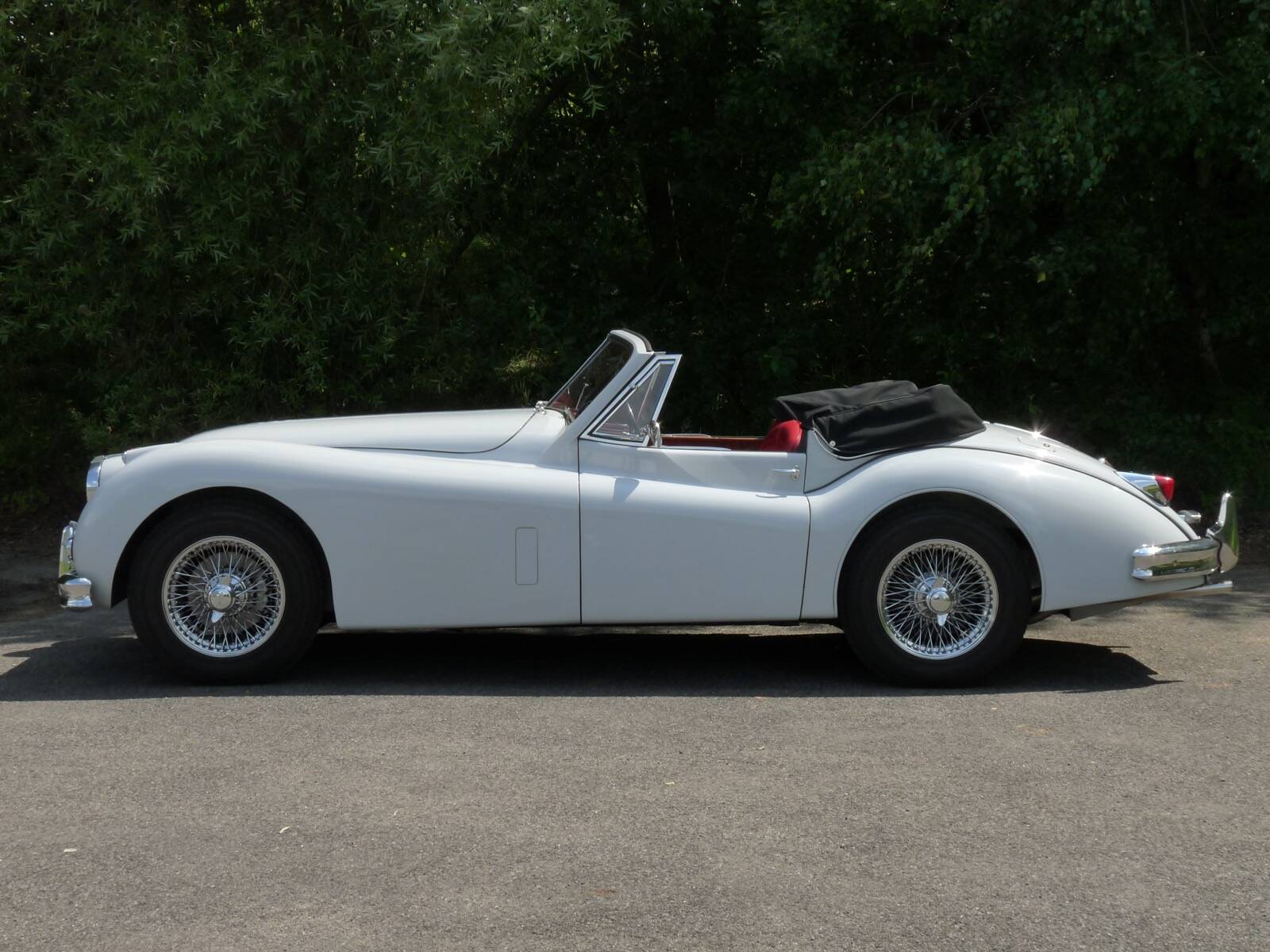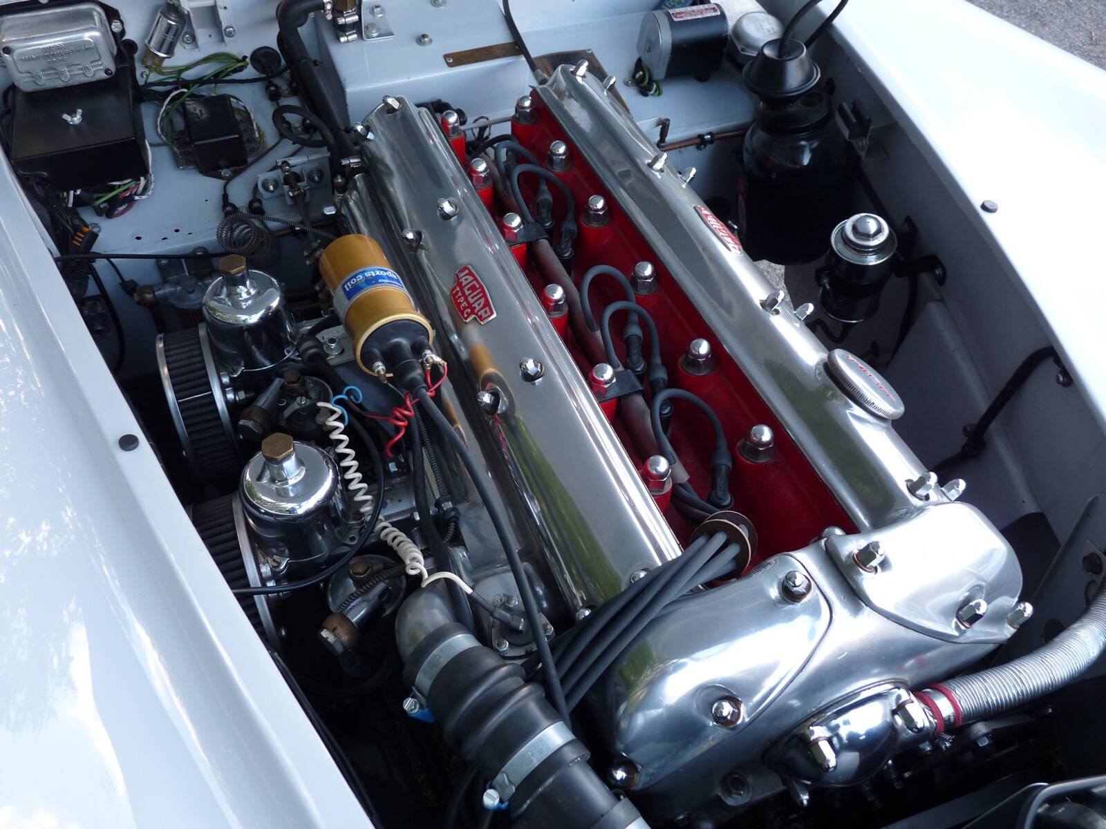 Cette Jaguar XK 140 vient de bénéficier de nombreuses améliorations : boite 5 vitesses, ceintures de sécurité ventrales, volant 4 branches avec rivets, pommeau de levier de vitesses bois, sur-tapis, autoradio vintage, haut parleurs avec grille et antenne électrique.