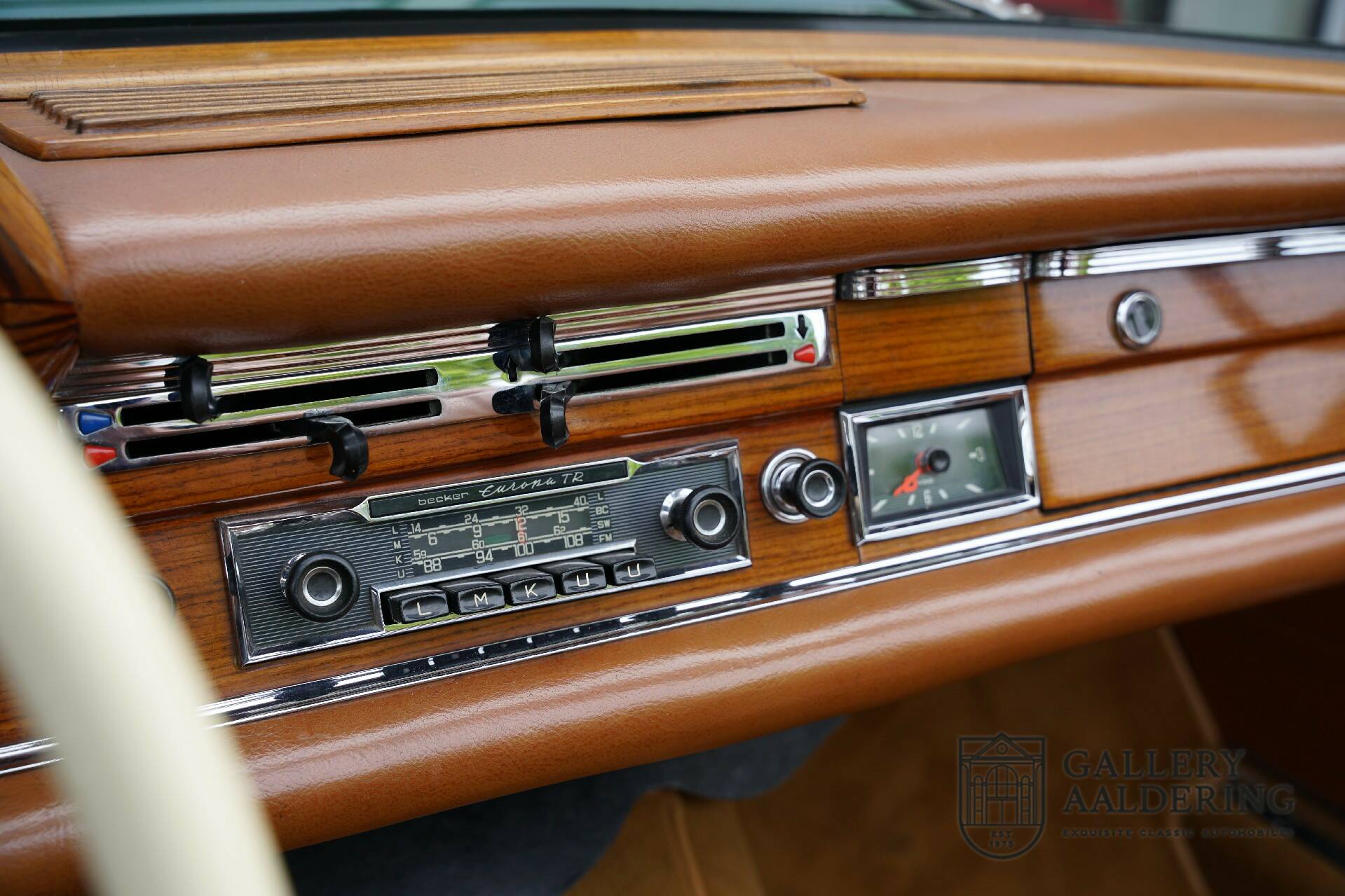 Het interieur is volledig origineel. Het hout bij de voorruit is nog steeds in zeer goede staat verkerend en ziet er keurig verzorgd uit. De stoelen zitten precies zoals andere stoelen in Mercedes-Benz auto’s uit deze periode en uit het hogere segment. De tapijten verkeren in goede staat en sluiten overal mooi aan. De instrumenten en bedieningselementen functioneren allen zoals het hoort en zien er fraai uit. Ook aan het interieur kan opgemerkt worden dat de vorige eigenaren zeer goed voor de auto hebben gezorgd.