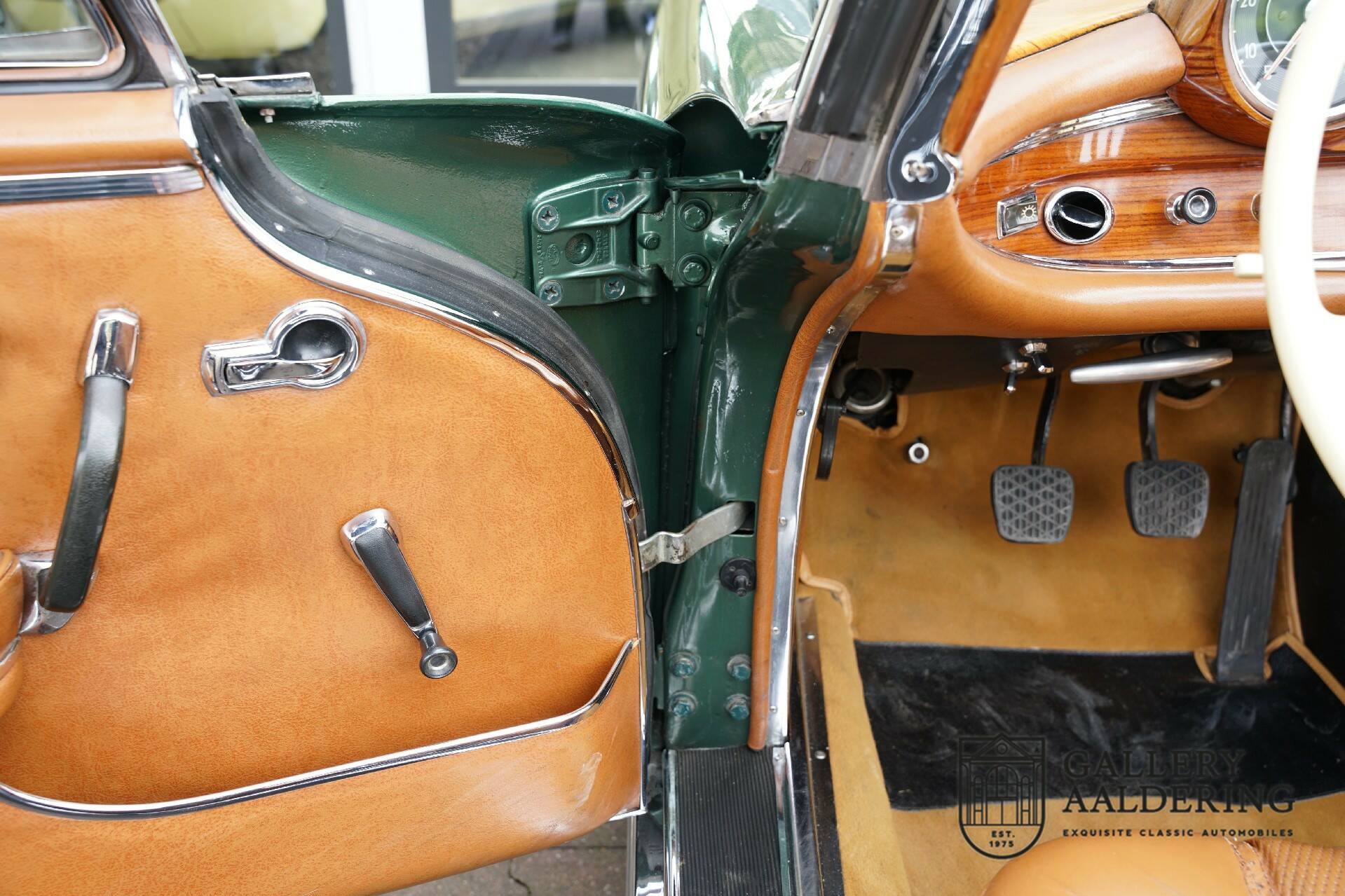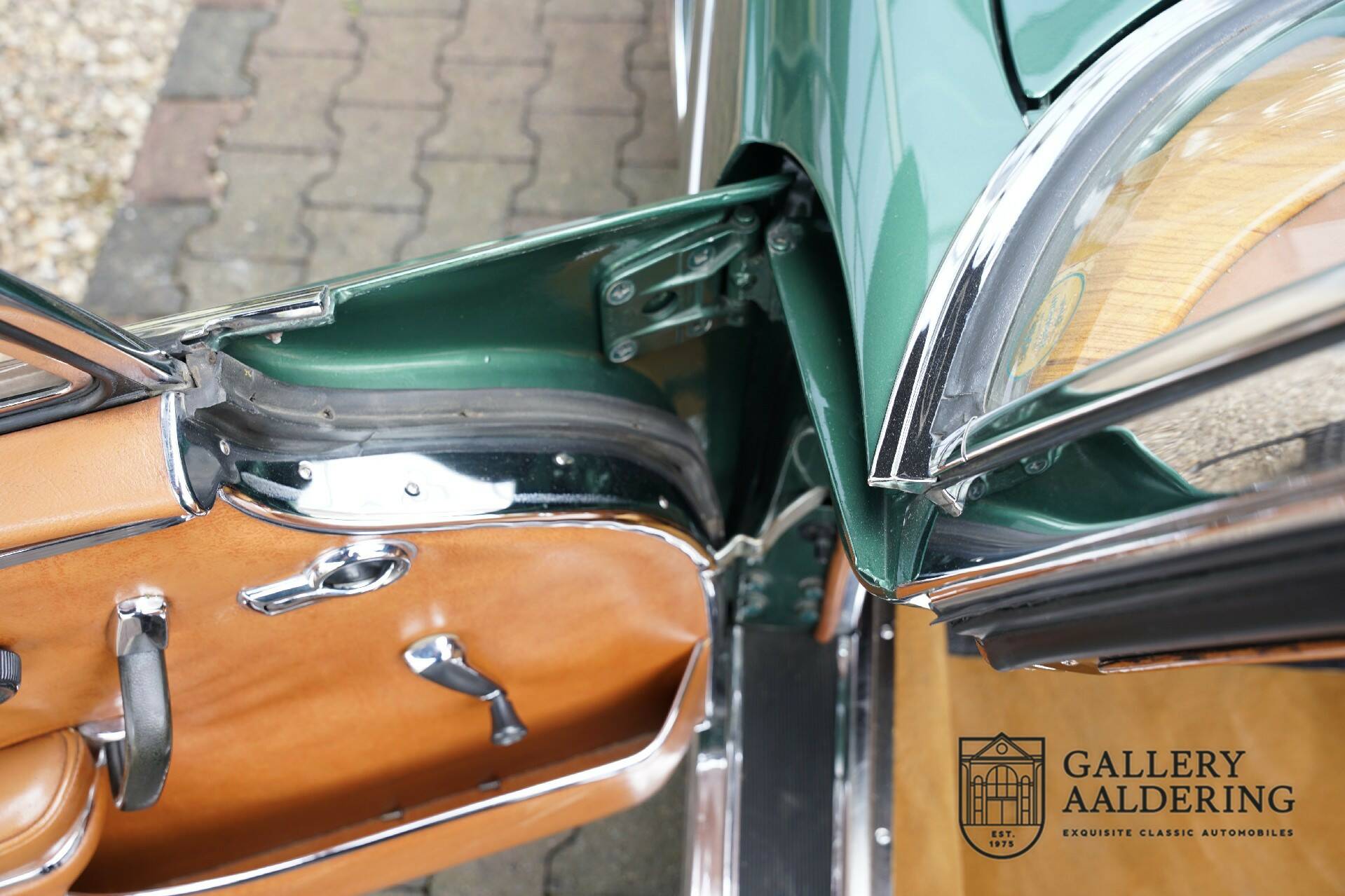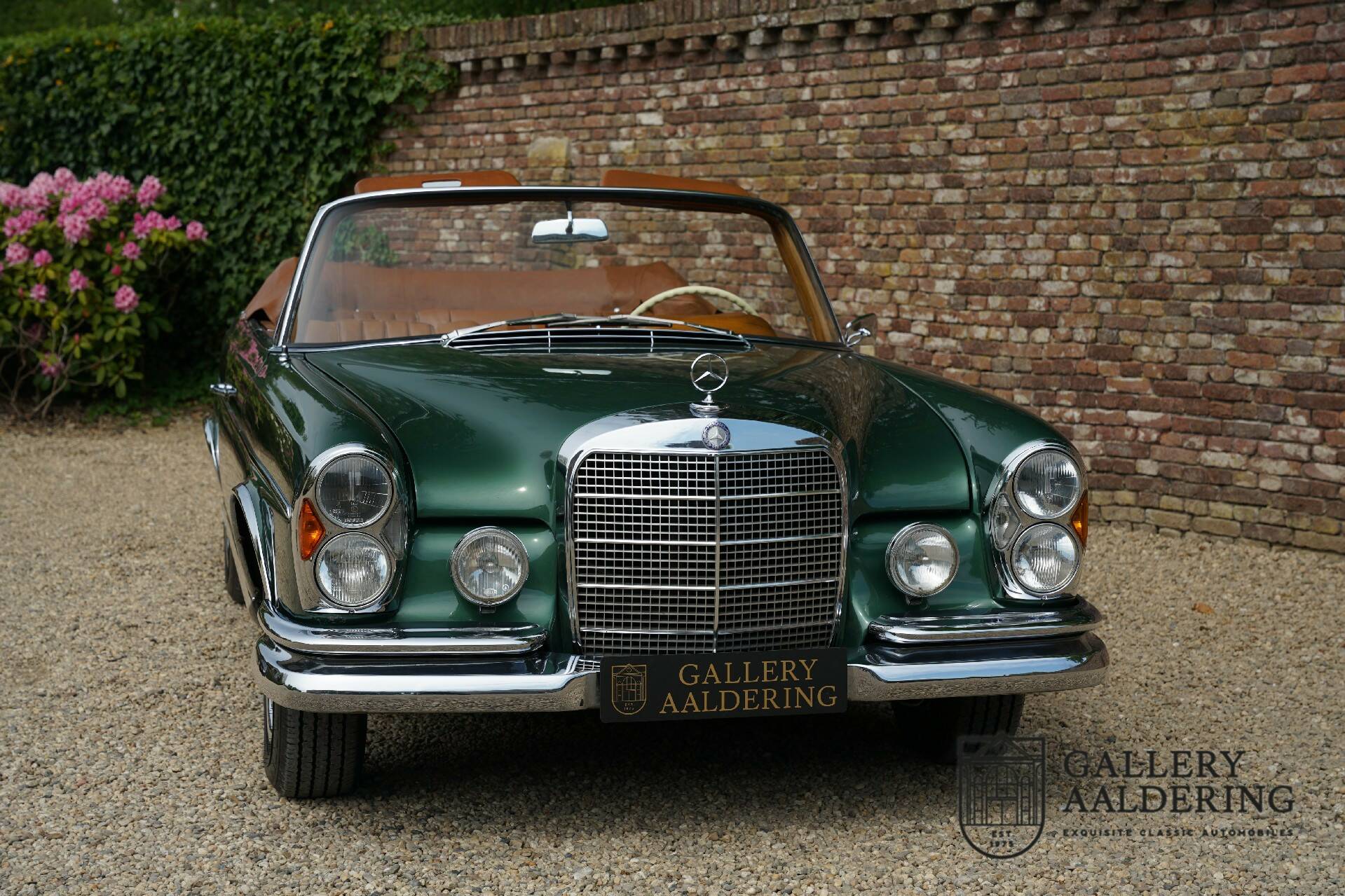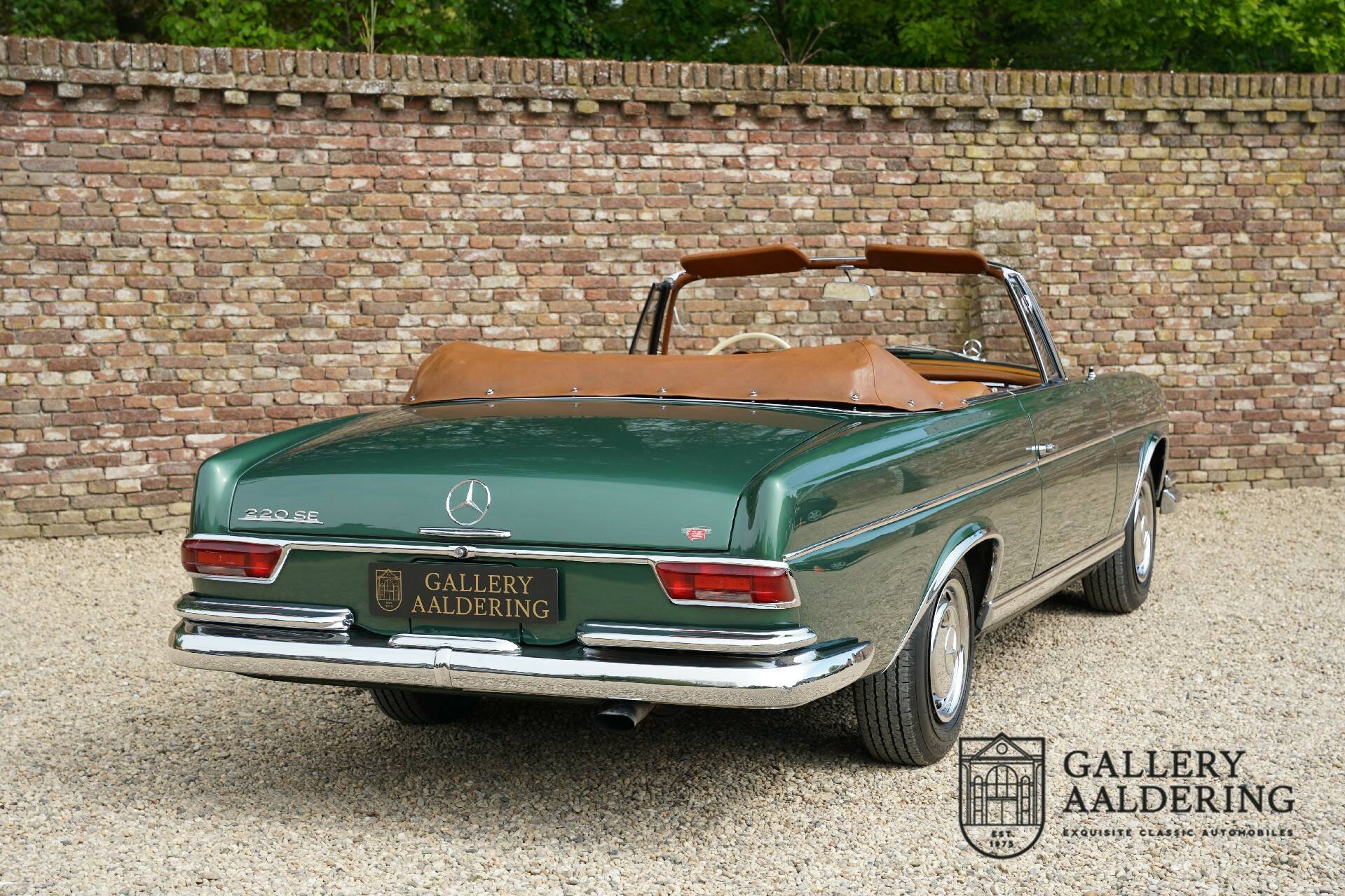 Het betreft hier een prachtige origineel Duits geleverde Mercedes-Benz W111 220SE Cabriolet (Type W111.203) met de zeldzame handgeschakelde transmissie met vier versnellingen en daarnaast matching numbers. De auto heeft nog maar 108.422 kilometer gereden en verkeert nog steeds in zeer originele en goede staat. Deze Mercedes is uitgevoerd in de tijdloos fraaie combinatie bestaande uit “green and tan” in dit geval Dunkelgrün met een prachtig met bruin leer bekleed interieur én zwarte cabrioletkap. Het simpele feit dat de auto in prachtige originele conditie verkeert én de beschikking over een handgeschakelde transmissie heeft maakt dit een gewild exemplaar.