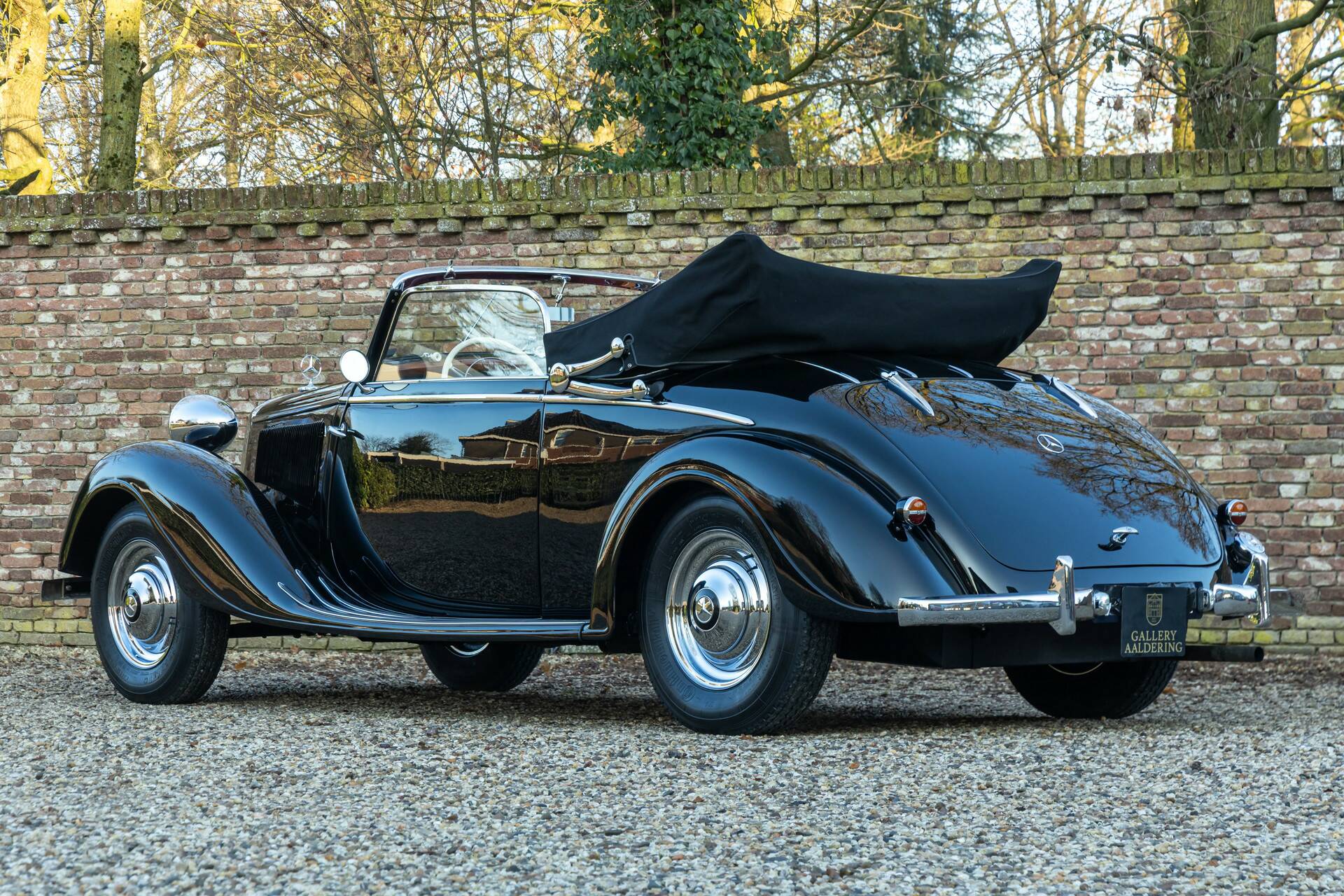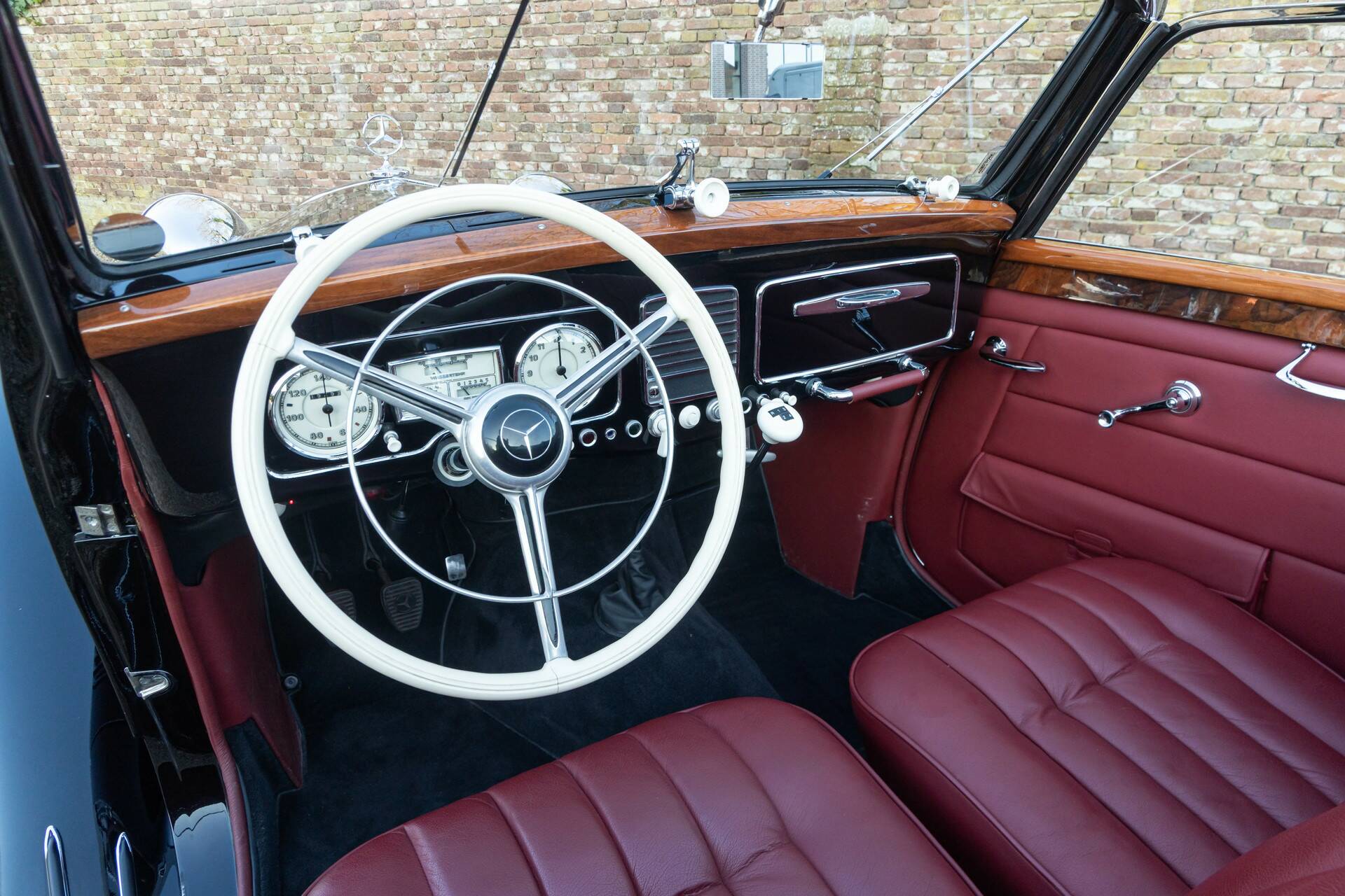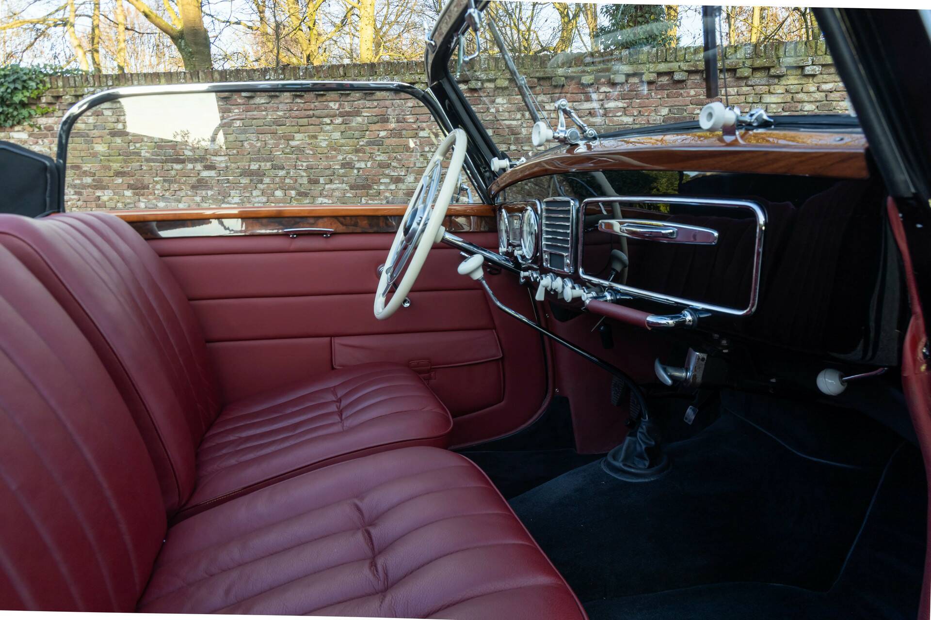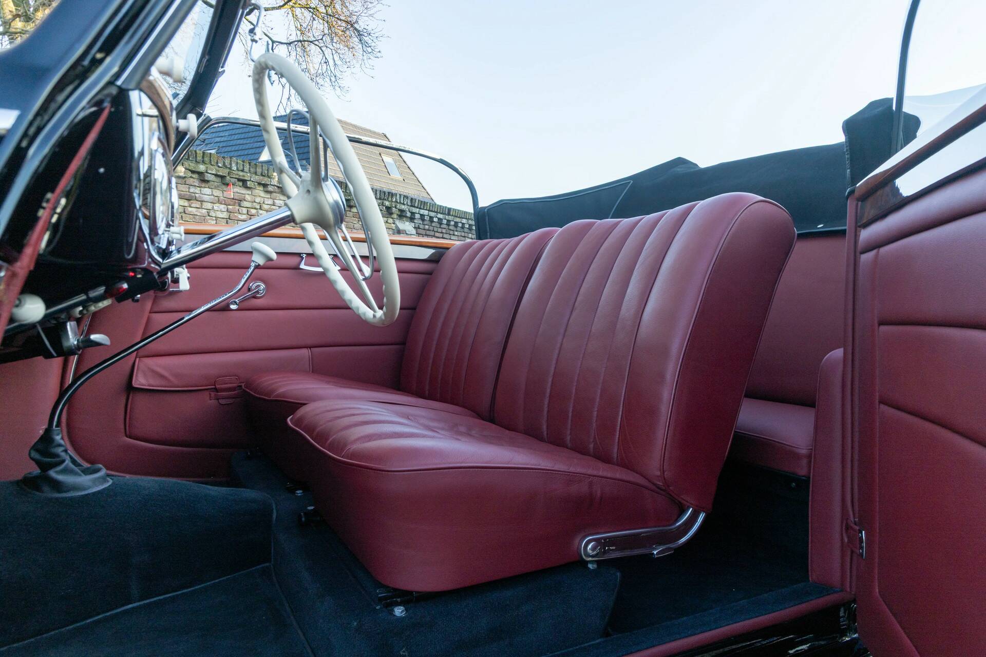 Deze 230A Cabriolet is uitgevoerd in een diepzwarte lak die de lijnen van het koetswerk prachtig accentueert en waarbij het lijkt alsof de auto zo uit een vooroorlogse film komt rijden. In combinatie met het fraaie rode leren interieur ontstaat een zeer stijlvolle vertoning. Wat deze cabriolet extra bijzonder maakt, is zijn onderscheidende carrosserie: geen alledaagse verschijning, maar een variant met een eigen karakter en uitstraling, waardoor hij zich duidelijk onderscheidt van de meer gangbare open modellen uit die periode.