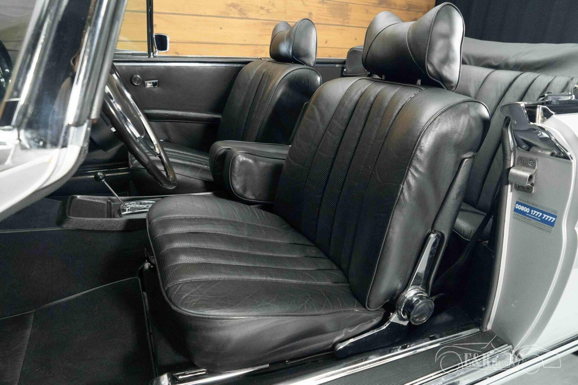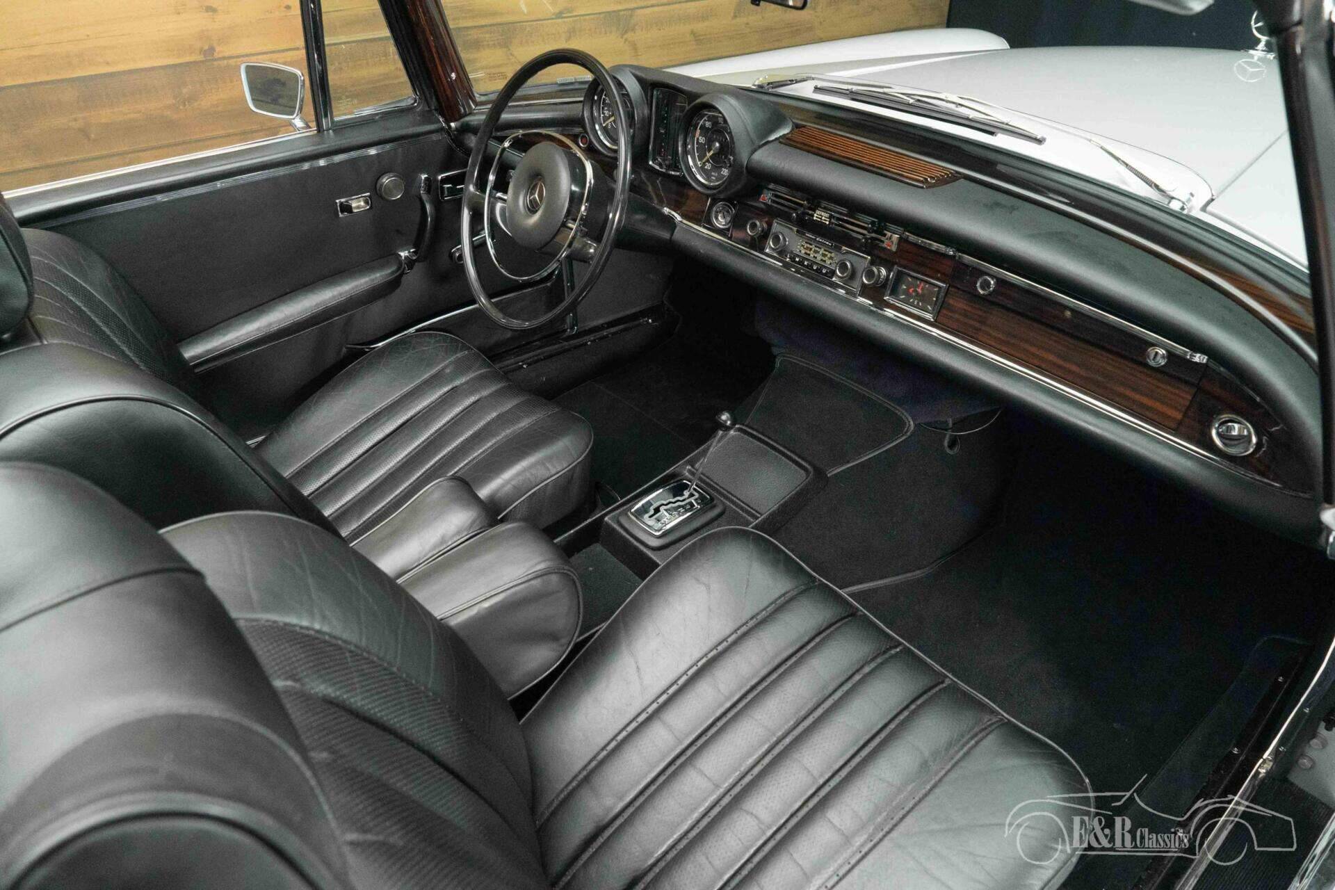 The exterior features a stylish silver-gray metallic paintwork, which contrasts beautifully with the black mohair soft top. This perfectly showcases the classic lines of the W111 convertible, thanks in part to original details such as the steel wheels with hubcaps and the Hella front fog lamps. The interior is finished in black leather, which, together with the paintwork, creates a timeless and luxurious look. The dashboard exudes pure sixties class, complete with an original Becker Europa radio. Everything about this 280 SE Cabriolet exudes quality, comfort, and exclusivity.