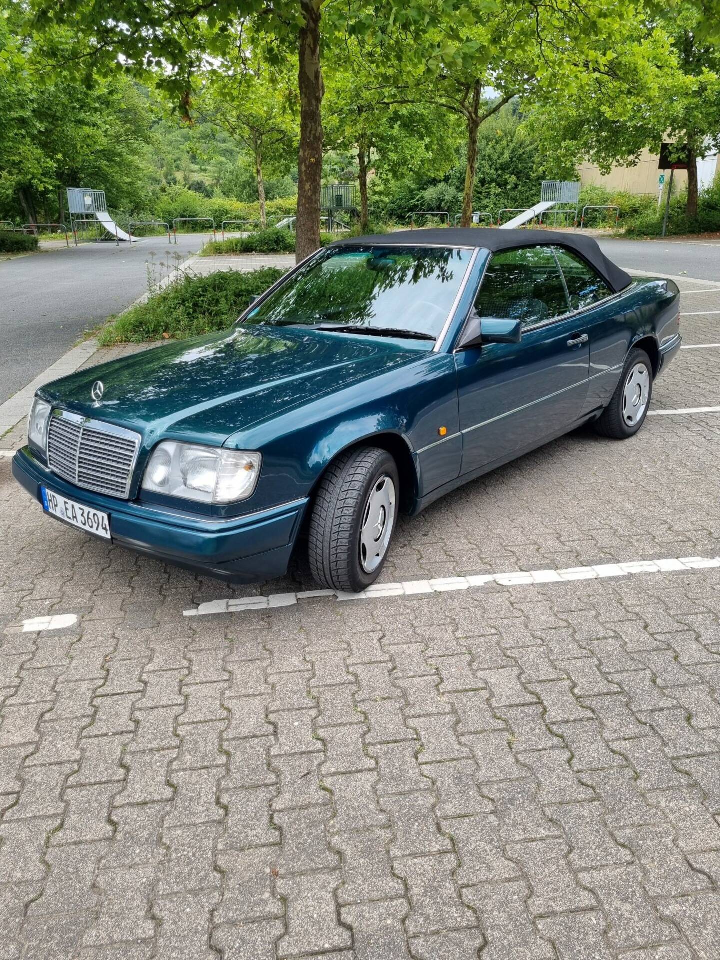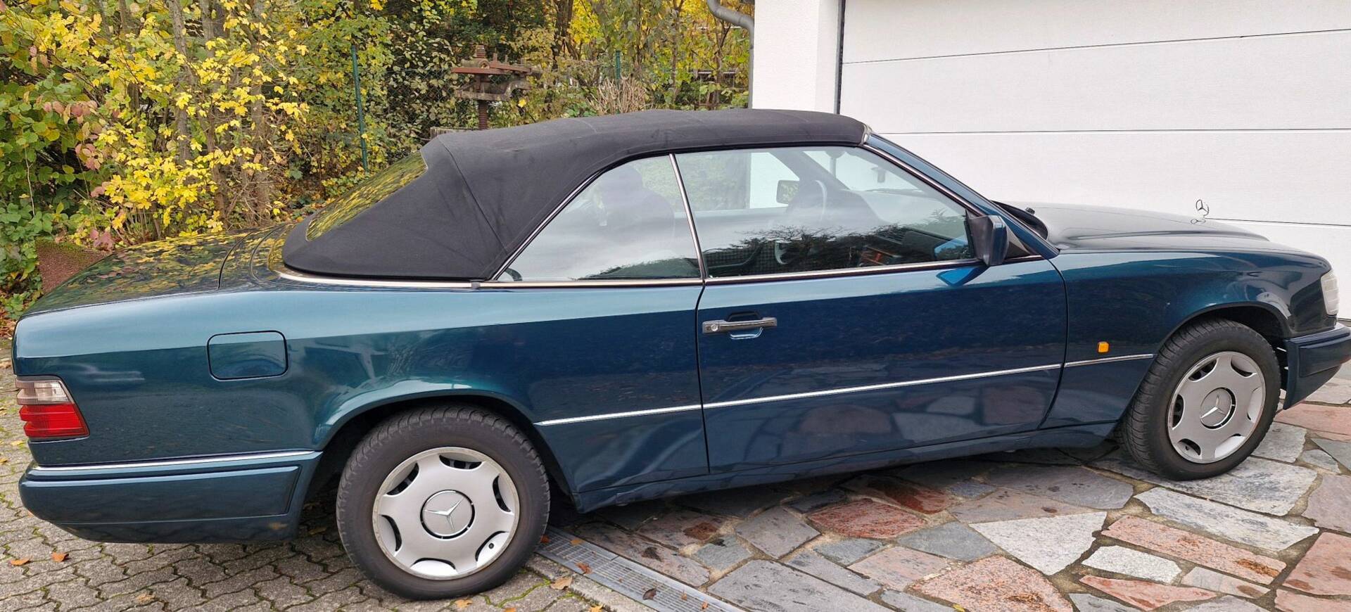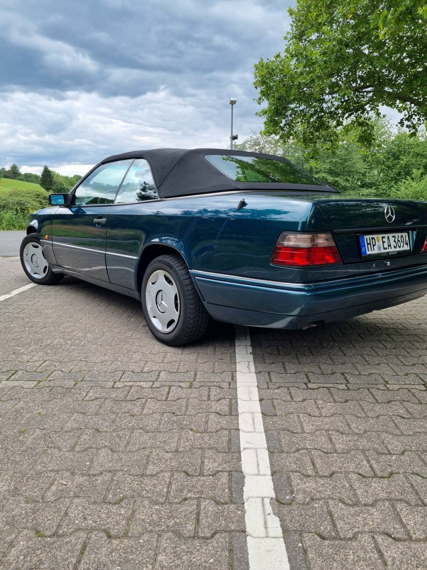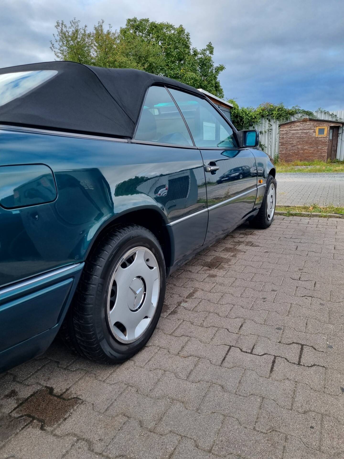 Schönes E 200 Oldtimer Cabrio mit H- Kennzeichen. Dunkelgrünmetallic (turmalin)mit schönem Stoff Karo kombiniert. Gepflegt und gewartet, Garagenfahrzeug.Das Fahrzeug ist gut ausgestattet mit Automatik, Klimaanlage, elektr. Fensterhebern, Tempomat, Sitzheizung, Radiovorrüst. mit elektr. Antenne, ZV mit Funk und 2 Schlüsseln, dunkles Wurzelholz, Ganzjahresreifen, Metalliclack usw.