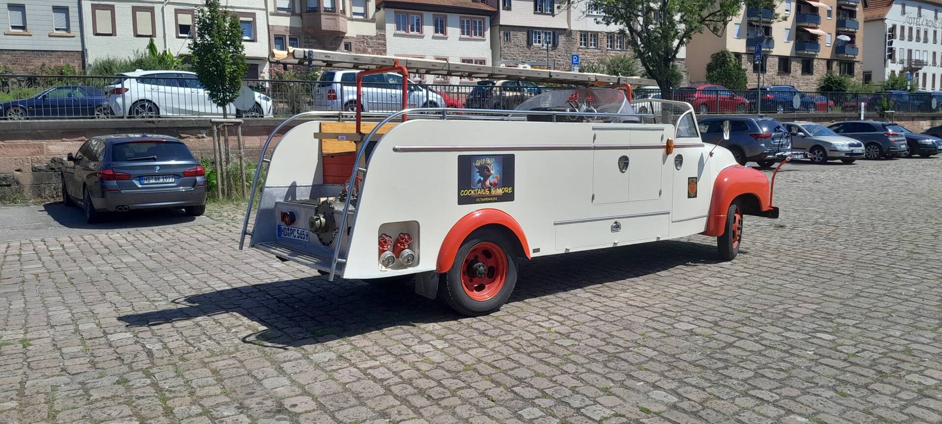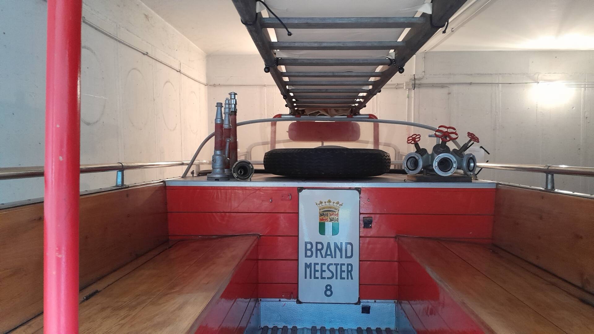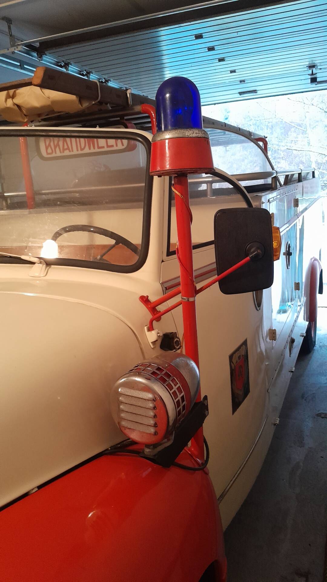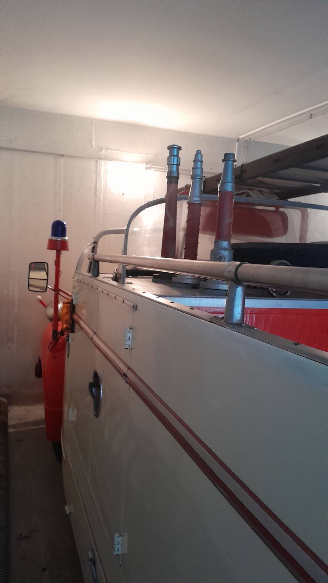 · Blaulicht und zwei unterschiedliche Sirenen sowie original Feuerwehrschläuche, Leiter und Spritzen sind an Bord.