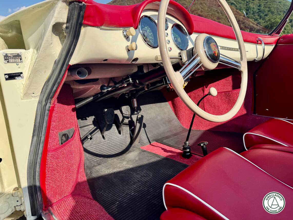 The Porsche 356 Speedster was originally created for the American market as a more minimal and lightweight version, featuring a lower windshield and a more essential configuration, quickly becoming a benchmark among sports cars of its era. This particular model is equipped with the correct 1500 engine, type 546/2, a 1488 cc unit delivering approximately 55 HP, offering a perfect balance between performance and authentic vintage driving pleasure.