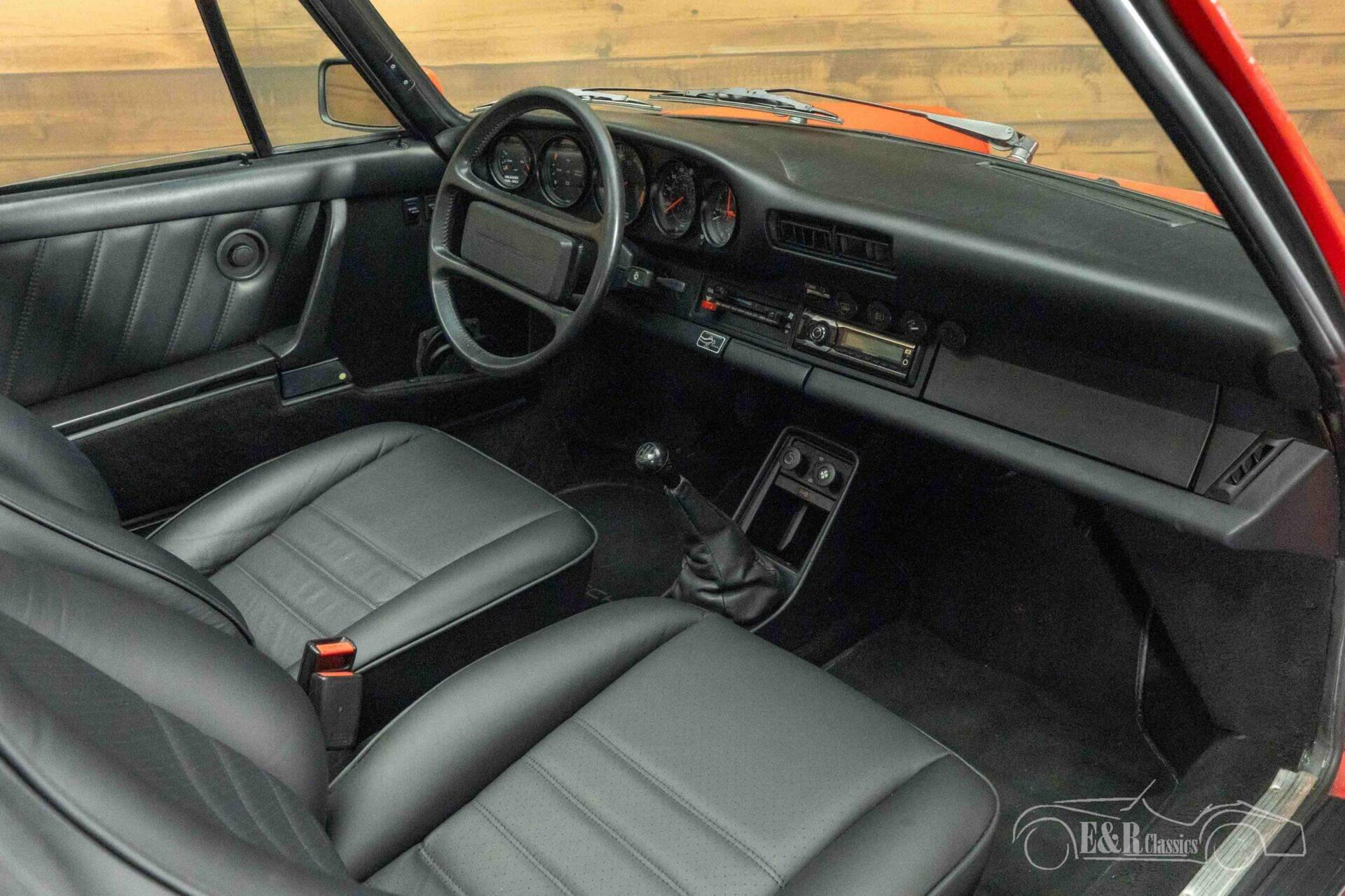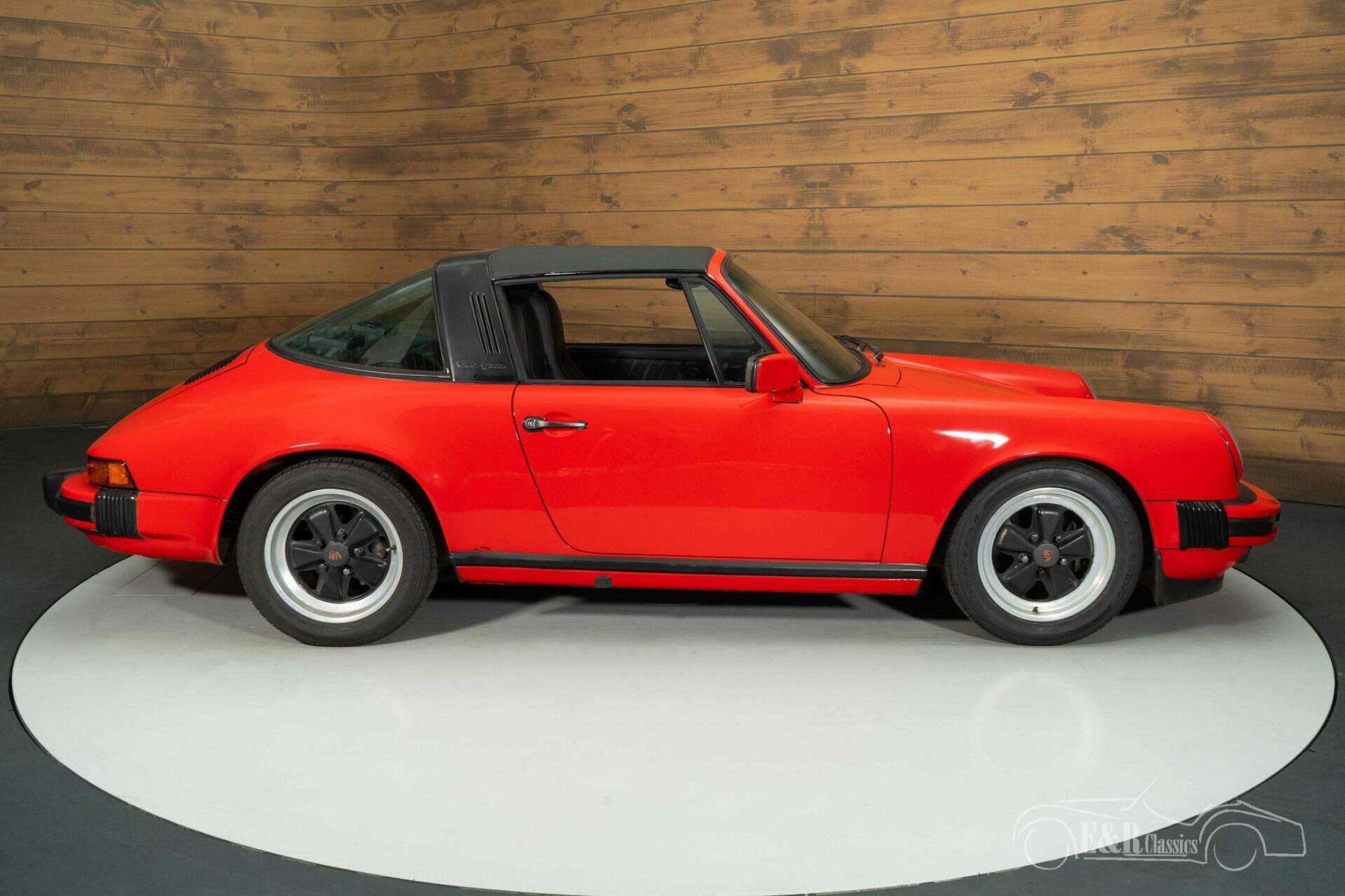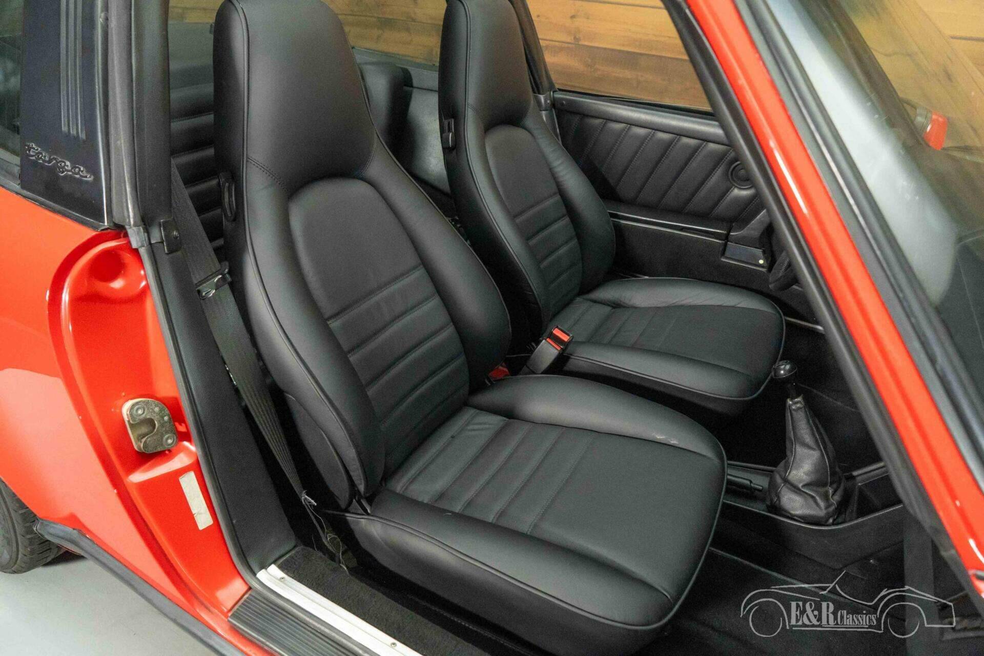 The exterior is characterized by striking red paintwork that contrasts beautifully with the black accents and the classic black Fuchs wheels. The wide hips and recognizable lines of the 911 are perfectly showcased in this version. The removable Targa roof allows you to switch from a coupe to an open-top driving experience in an instant. The interior is finished in stylish black and is in neat condition, featuring comfortable electrically adjustable seats and a clear dashboard fully focused on the driver. The combination of the red exterior and the black interior gives this Porsche a timeless and sporty appearance.