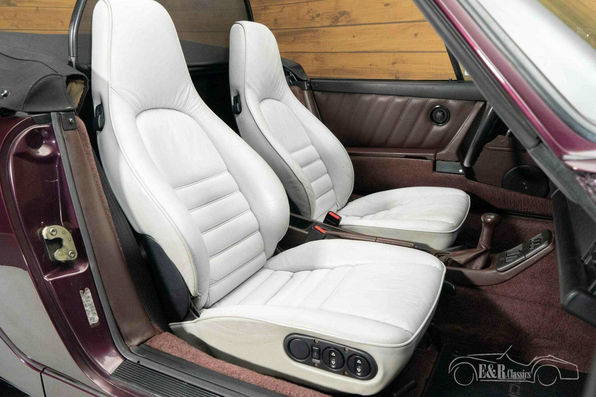 The exterior is particularly stylish thanks to the rare Porsche Amethyst Metallic paintwork, which combines perfectly with the black mohair soft top. The classic Cup wheels emphasize the sporty character and seamlessly complement the timeless lines of the 964. The interior is upholstered in gray leather with purple carpet, a striking and tasteful combination that beautifully complements the body color. This Porsche is also equipped with air conditioning, electrically adjustable and heated seats, and a modern Continental DAB radio, combining comfort and originality. A convertible that impresses both visually and technically, and is ready to be enjoyed.