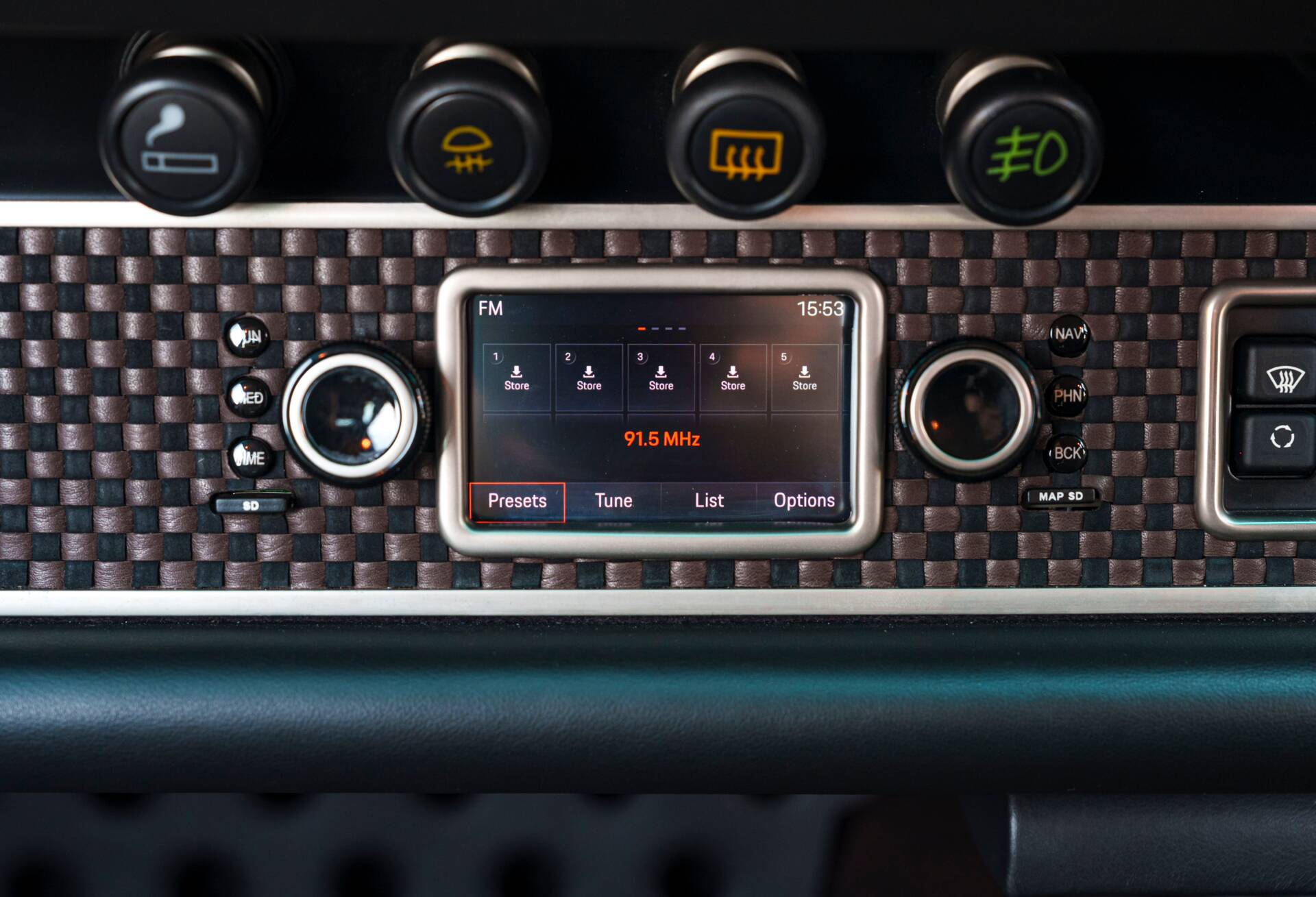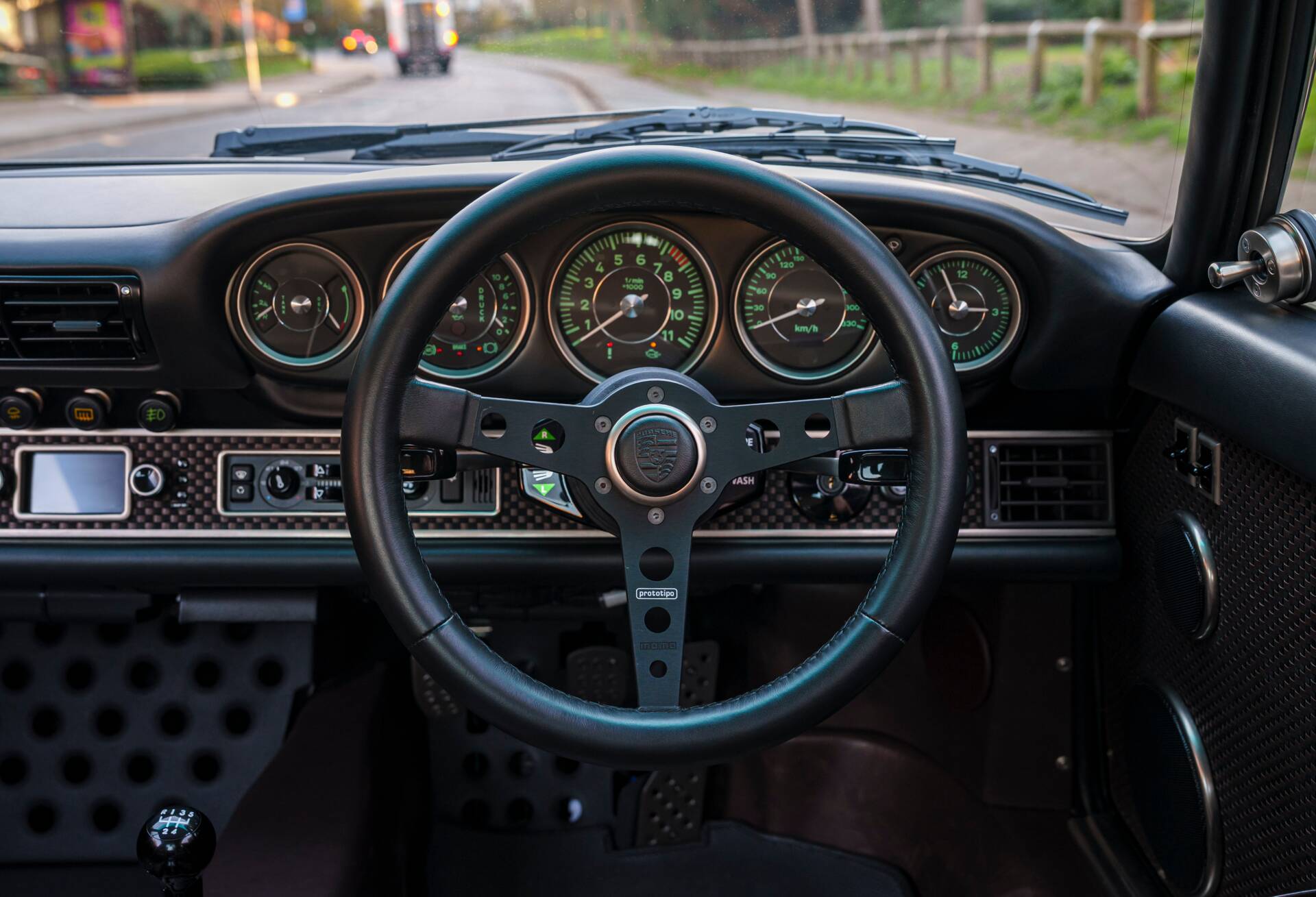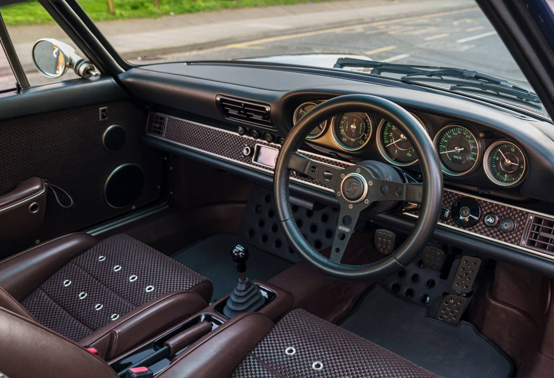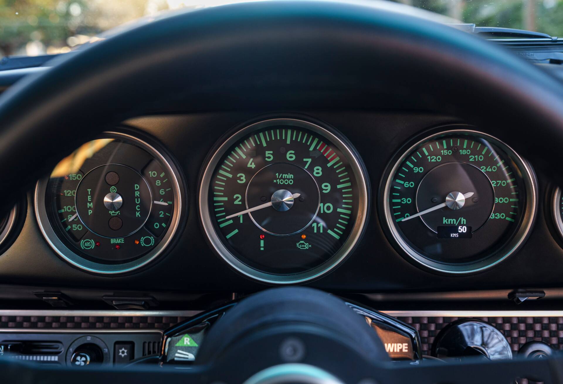 Instrumentation follows early 911 heritage, featuring green-marked gauges with nickel trim, complementing full Touring trim with nickel bumperettes, raised nickel decklid lettering, RSR wheel centres with black backgrounds, and early 911 accent mesh finished in black.