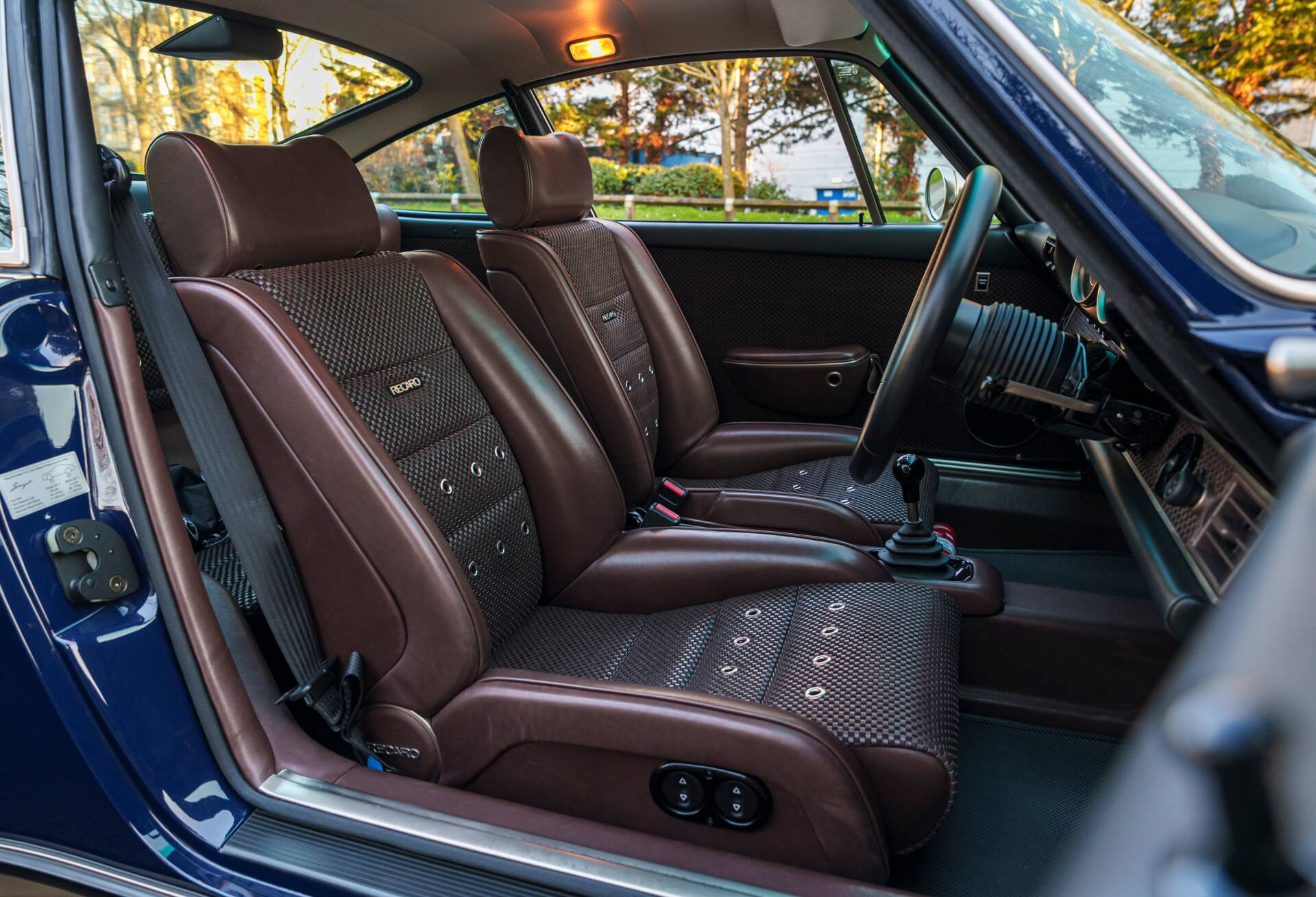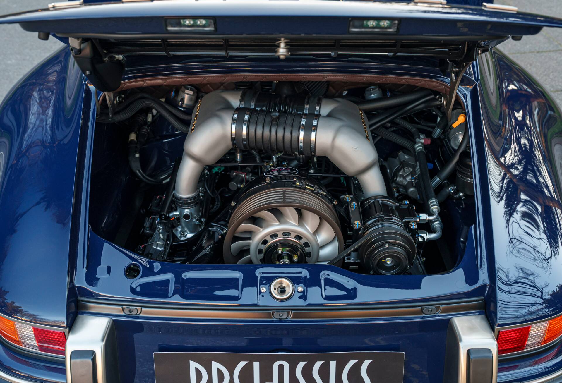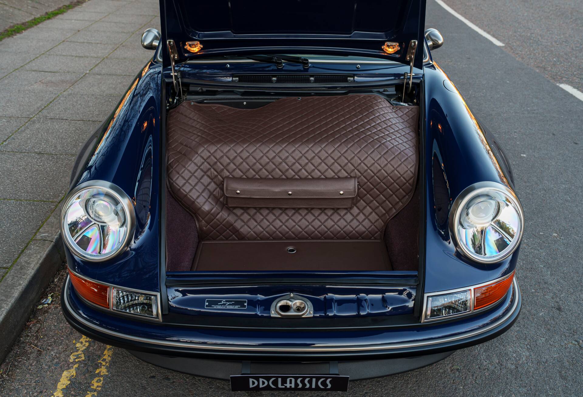 Finished in Paint-to-Sample Oxford Blue, the car presents superbly, accentuating the timeless 964 silhouette enhanced by Singer’s celebrated craftsmanship and precision detail. Beneath its flawless finish lies a restored carbon-fibre body, offering strength, lightness, and a perfect canvas for Singer’s artistry.