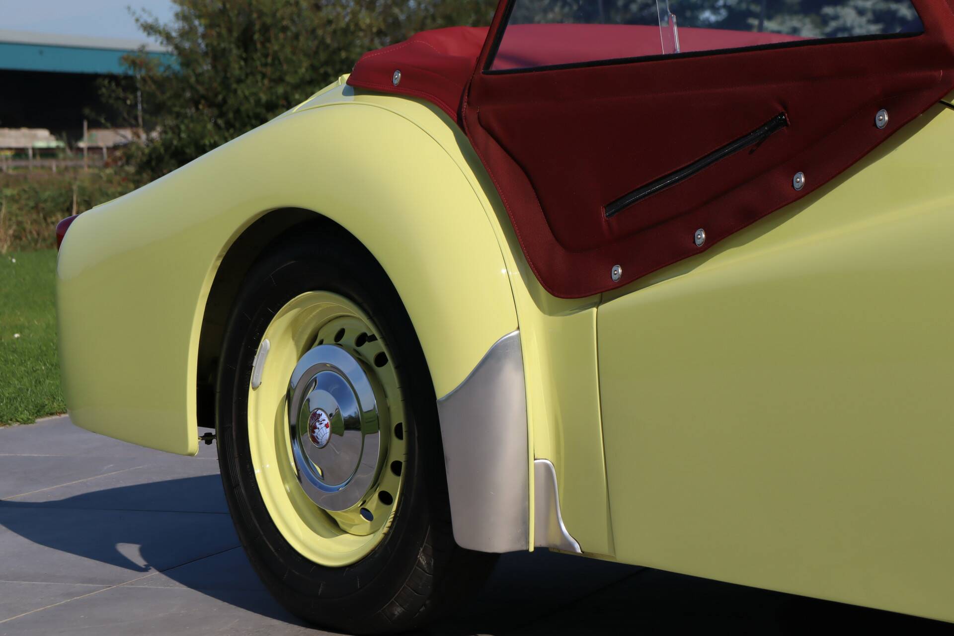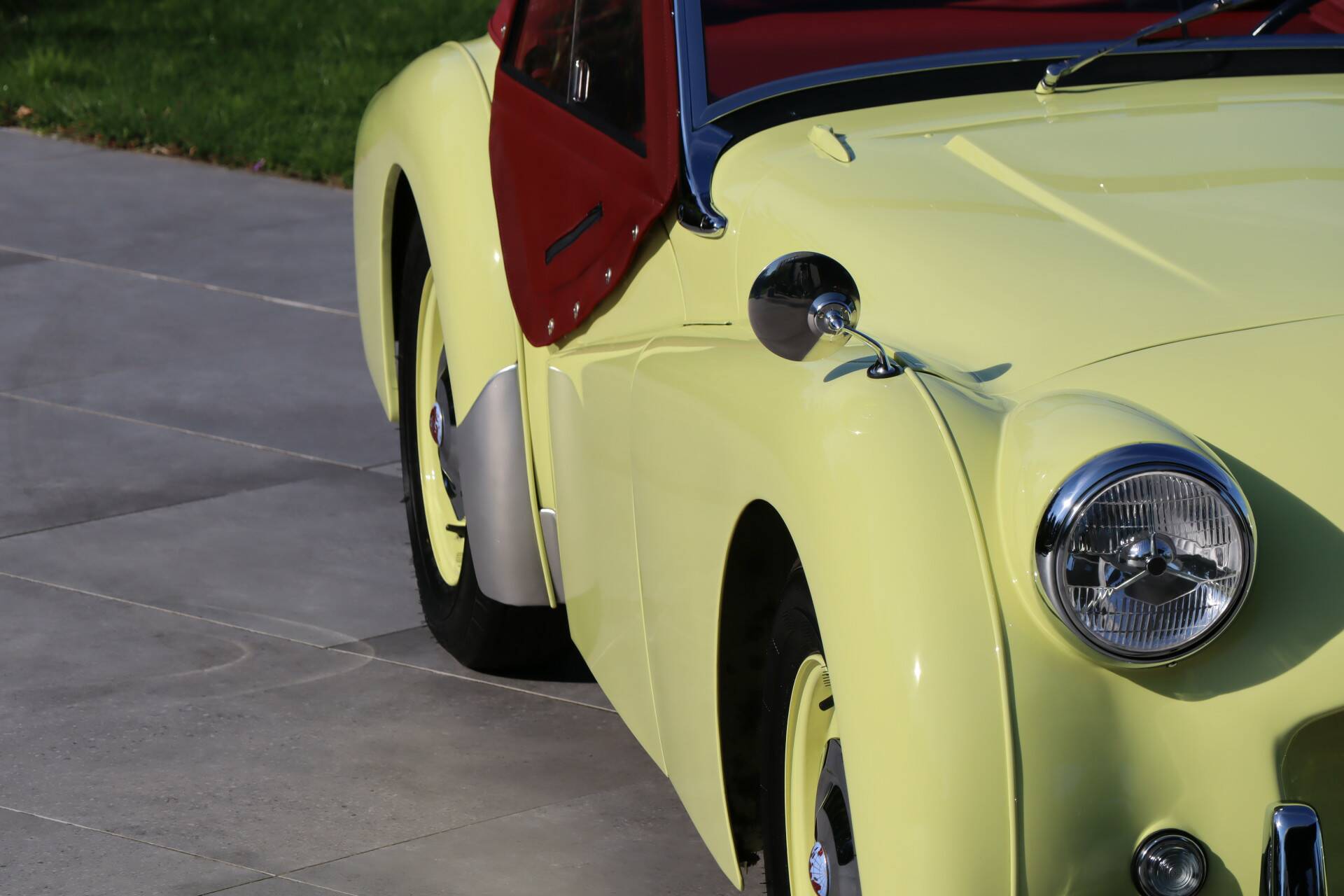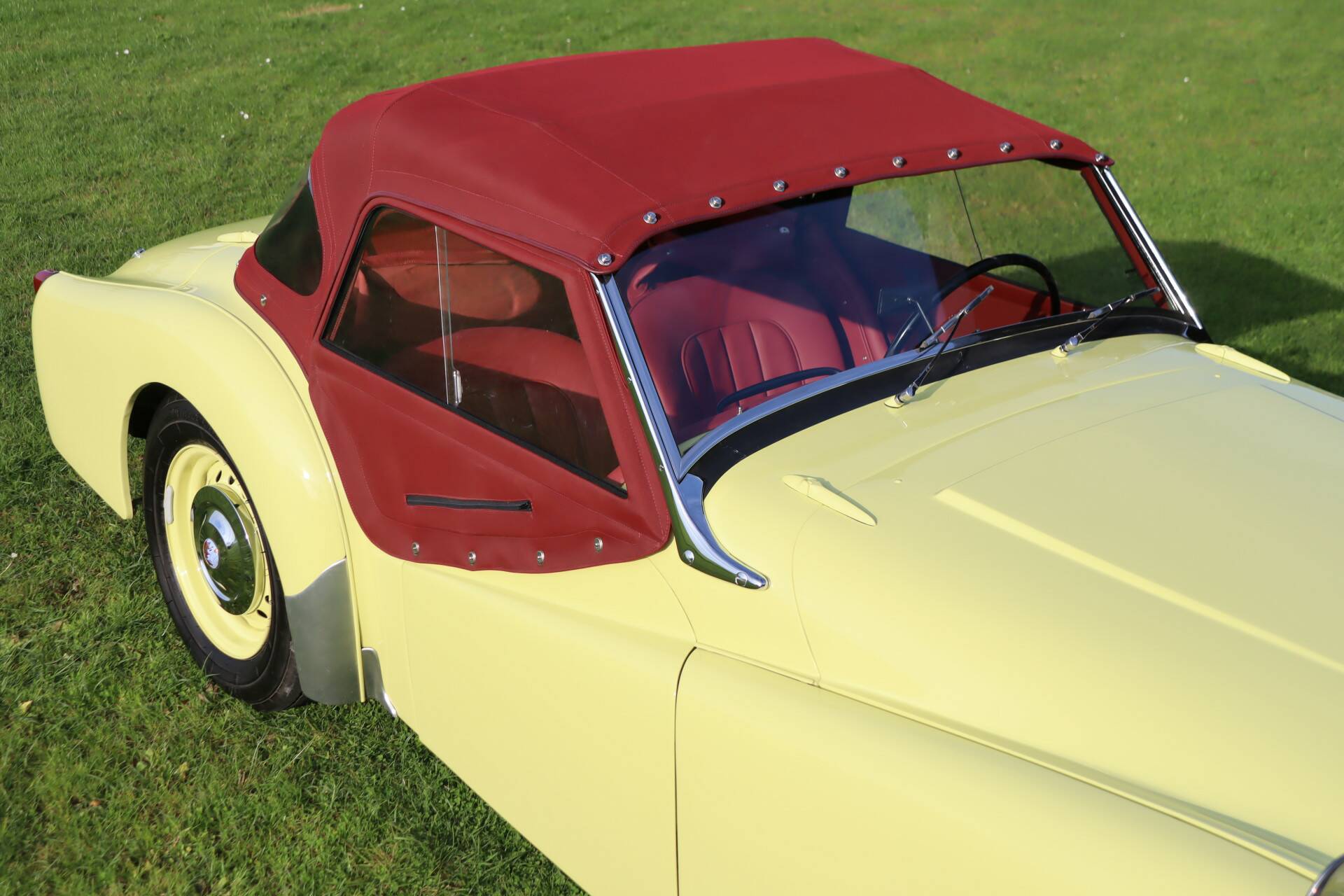 What a sight: the classic look of the TR2 is beautifully accentuated by the “Prime Rose Yellow” colour and contrasts nicely with the burgundy interior. This is an early production “Long-Door” model, recognisable by its long side doors without sills at the bottom. The authentic small grille is also known as the “bomb crater” grille. This is the original model of the Triumph TR series. Naturally, the car is in top condition visually. For safety reasons, a tow hook has been added to the bonnet. The headlights are of the P700 type. The soft top is new and therefore in excellent condition. The wheels are also in very good condition, featuring the distinctive Triumph logo. Many chrome parts on the bodywork, such as on the bonnet and side screens, were originally painted in the colour of the car in the first series of the TR2. Because this was an extra step at the time, it cost more, so these chrome parts were no longer painted in the colour on later models. The car's panel lines are neat.