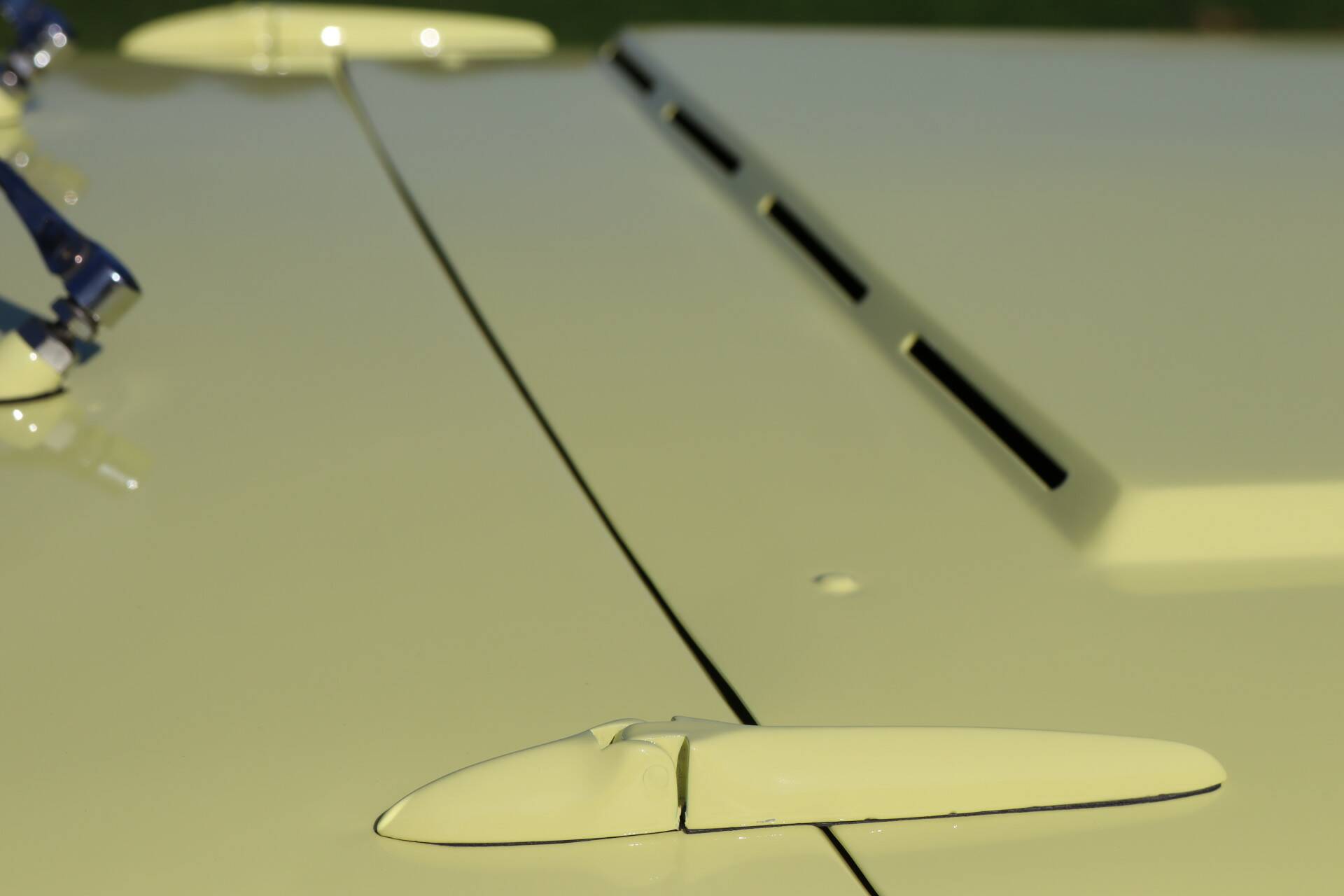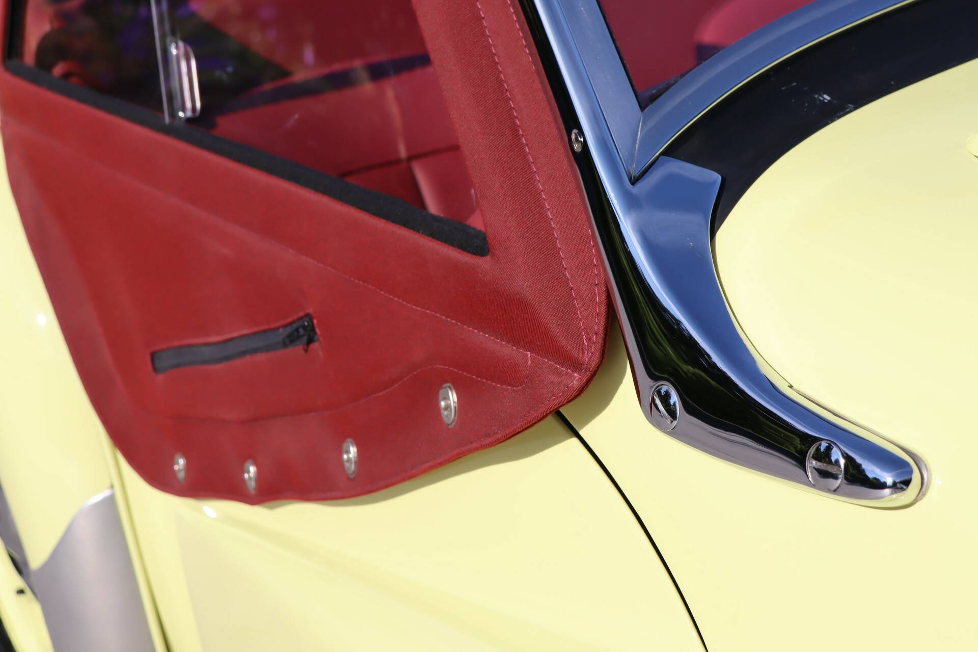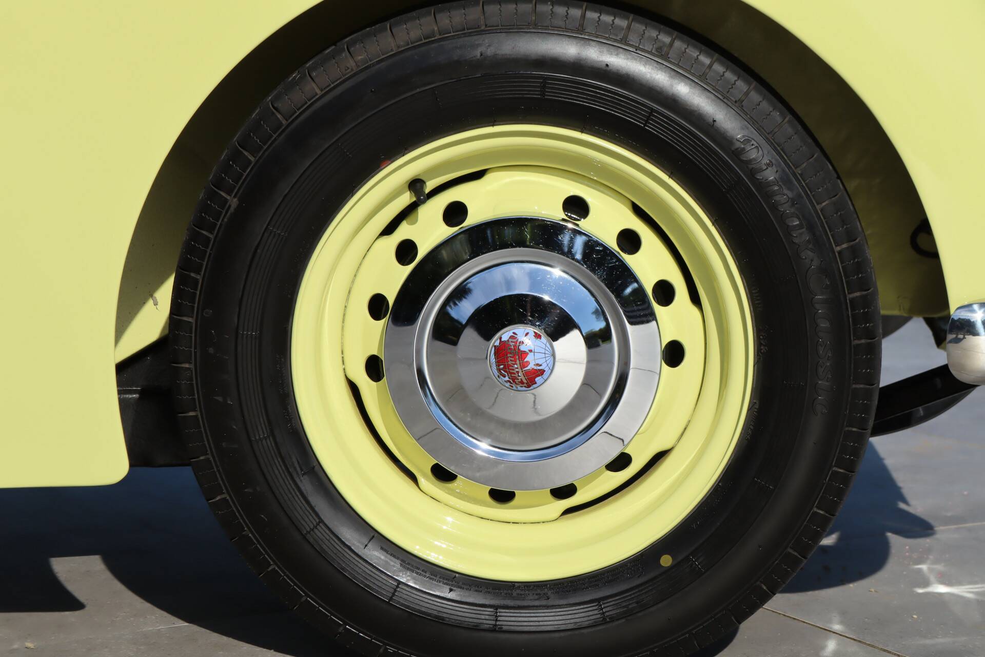 What a sight: the classic look of the TR2 is beautifully accentuated by the “Prime Rose Yellow” colour and contrasts nicely with the burgundy interior. This is an early production “Long-Door” model, recognisable by its long side doors without sills at the bottom. The authentic small grille is also known as the “bomb crater” grille. This is the original model of the Triumph TR series. Naturally, the car is in top condition visually. For safety reasons, a tow hook has been added to the bonnet. The headlights are of the P700 type. The soft top is new and therefore in excellent condition. The wheels are also in very good condition, featuring the distinctive Triumph logo. Many chrome parts on the bodywork, such as on the bonnet and side screens, were originally painted in the colour of the car in the first series of the TR2. Because this was an extra step at the time, it cost more, so these chrome parts were no longer painted in the colour on later models. The car's panel lines are neat.