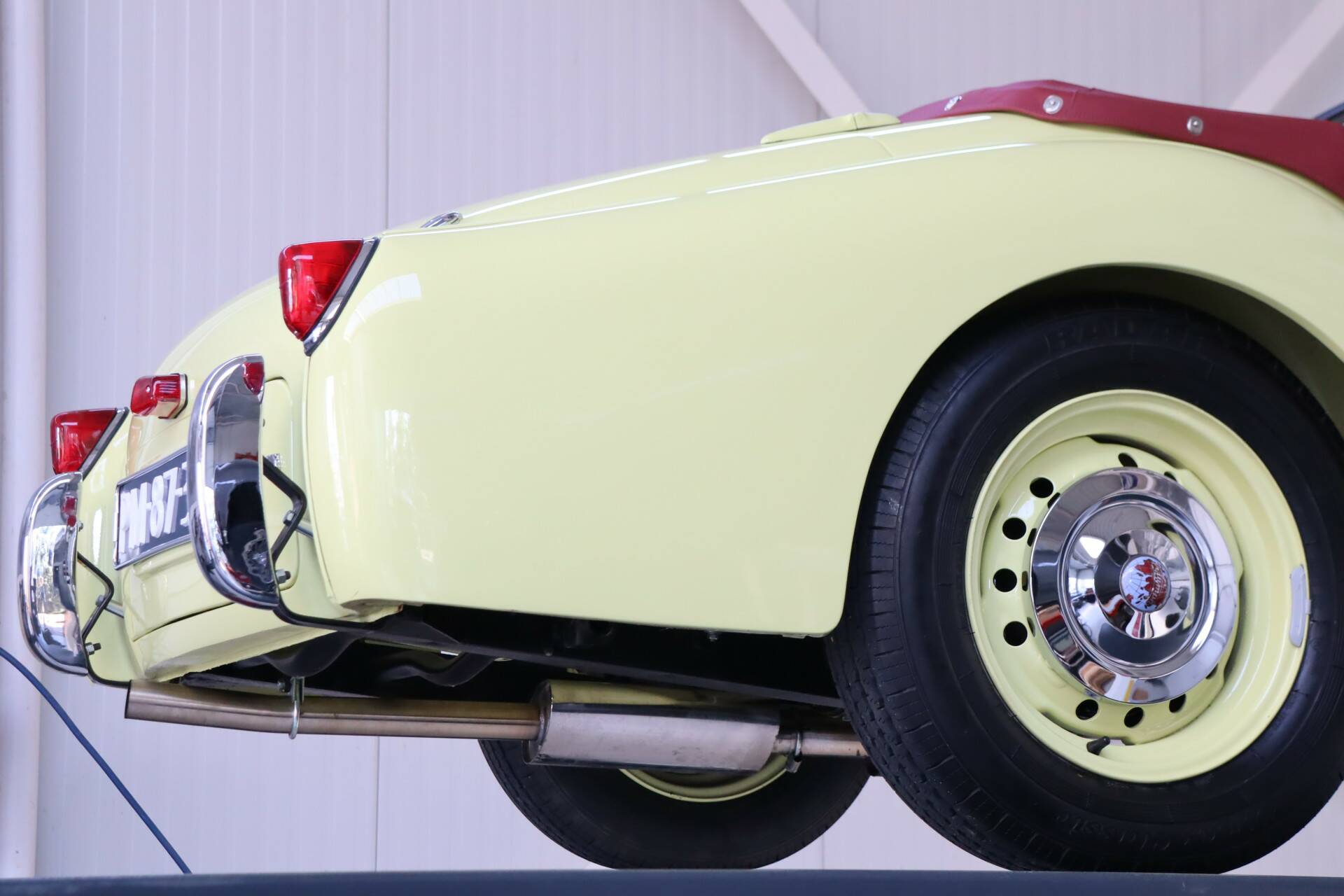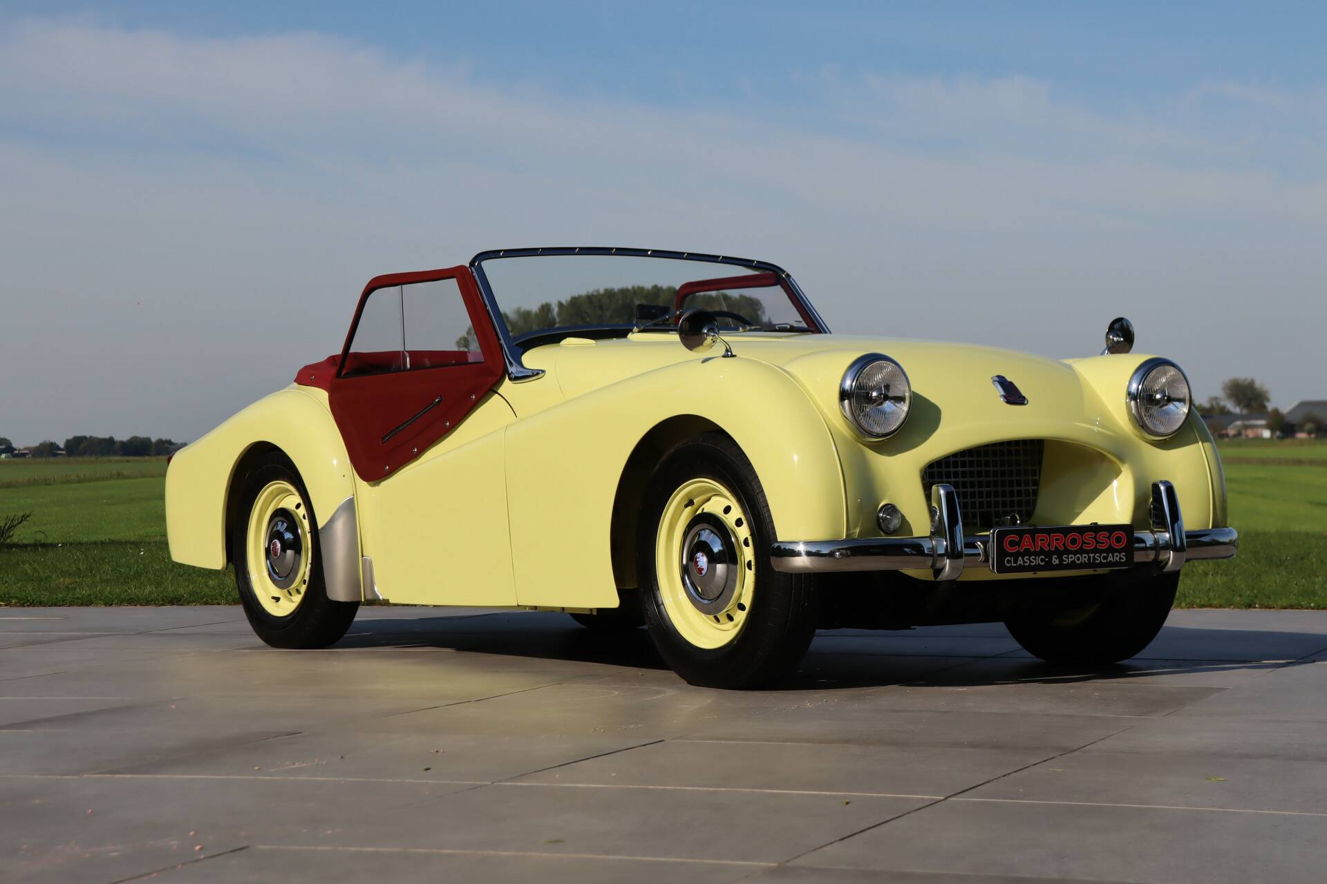 Wat een plaatje: de klassieke uitstraling van de TR2 komt prachtig tot zijn recht in de kleur 'Prime Rose Yellow' en wordt fraai gecontrasteerd met het bordeauxrode interieur. Het betreft hier een vroeg geproduceerd 'Long-Door' model, die te herkennen is aan de lange zijdeuren zonder dorpel aan de onderzijde. De authentieke kleine grille staat ook wel bekend als de 'bomkrater' grille. Het oermodel van de Triumph TR-serie dus. Vanzelfsprekend verkeert de auto optisch in topstaat. In verband met de veiligheid is aan de motorkap een vanghaak toegevoegd. De koplampen zijn van het type P700. De softtop is nieuw, en dus in uitstekende staat. Ook de wielen verkeren in zeer goed staat, met daarin het kenmerkende Triumph logo. Origineel zijn veel chroomdelen op de carrosserie, zoals op de motorkap en zijschermen, bij de eerste serie van de TR2 meegespoten in de kleur van de auto. Omdat dit destijds een extra handeling was kostte dit meer en daarom werden bij latere modellen deze chroomdelen niet meer in de kleur gespoten. De pasnaden van de auto zijn netjes.