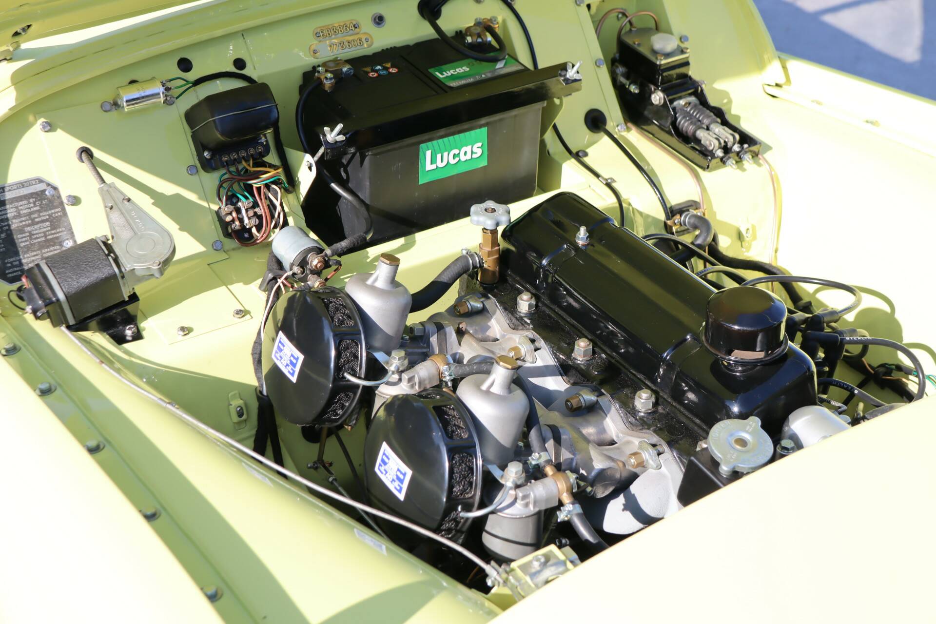 The car still has its original engine, which has been overhauled. The car has also been professionally restored, with attention to originality. The drum brakes have been retained, as has the Lockheed rear axle. This rear axle is fitted with Revington axle shafts, as the original Triumph axle shafts often break. The original steering system and bonnet locking system have also been retained. A mass switch has been fitted, hidden behind the dashboard. In addition, the Triumph is equipped with anti-theft and anti-self-ignition devices, an aluminium radiator (painted black), original A-type overdrive, a narrow modern V-belt, electric ignition and the authentic “high-torque” starter motor. The original DC dynamo has been converted to an AC dynamo.