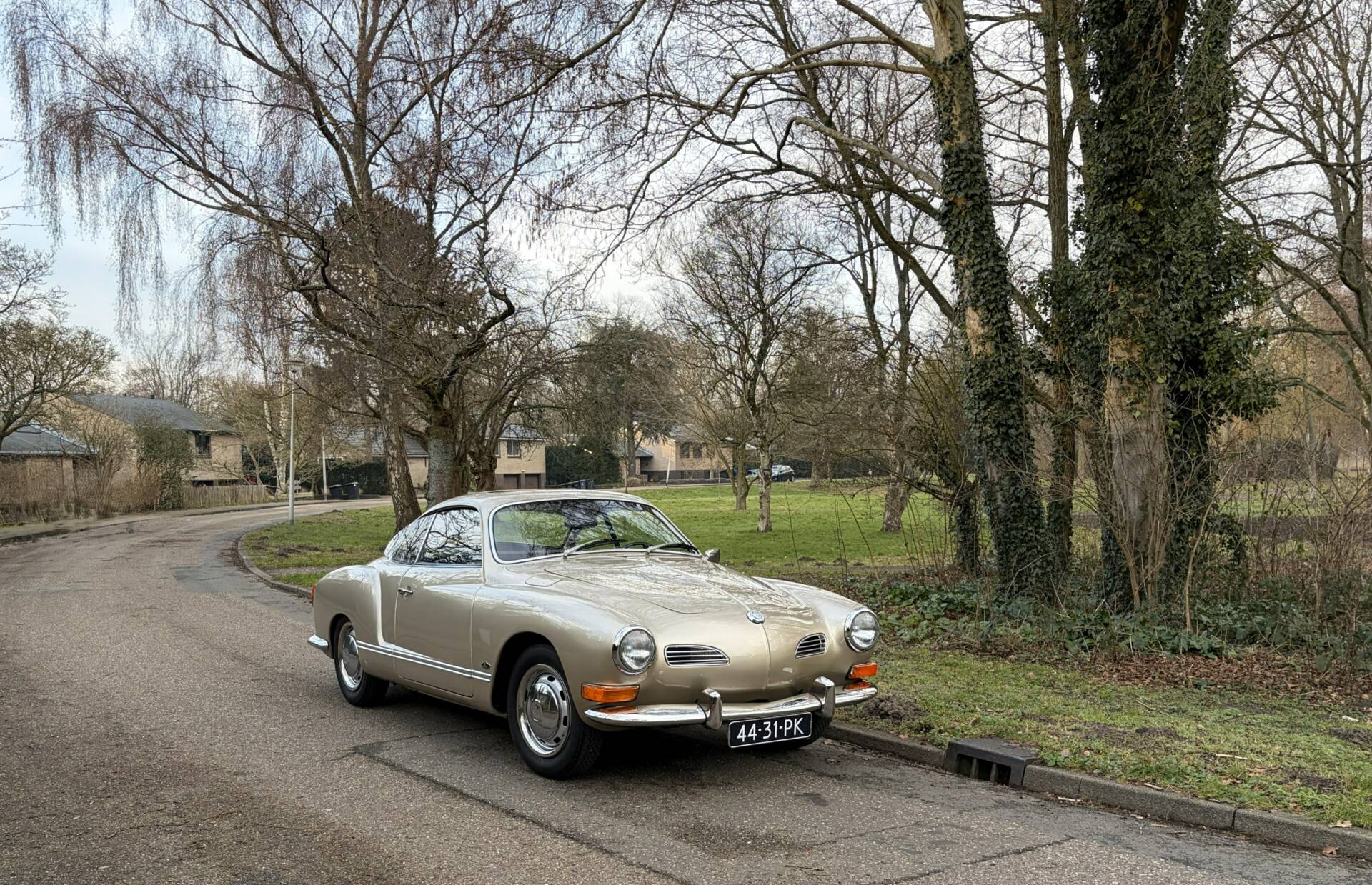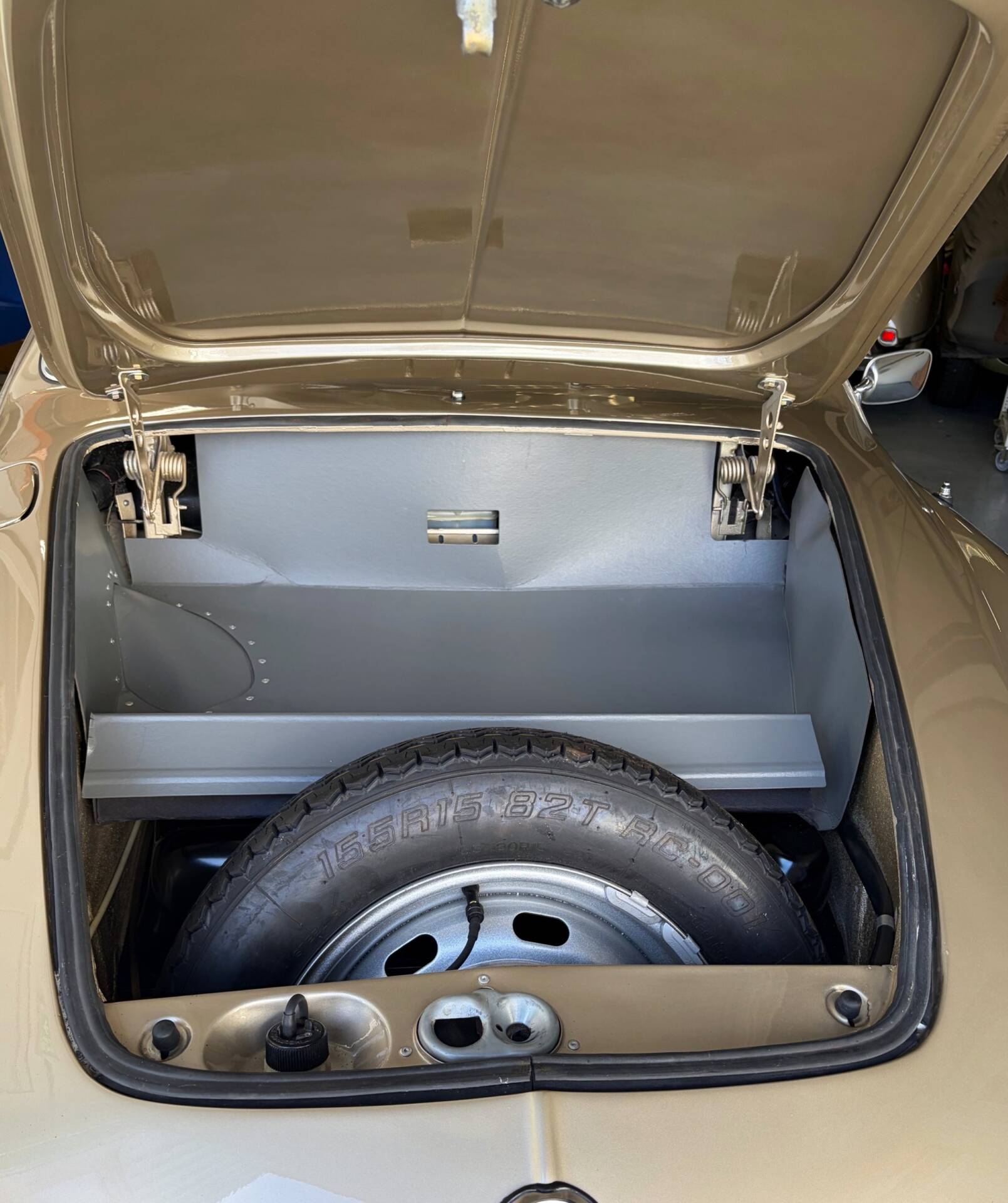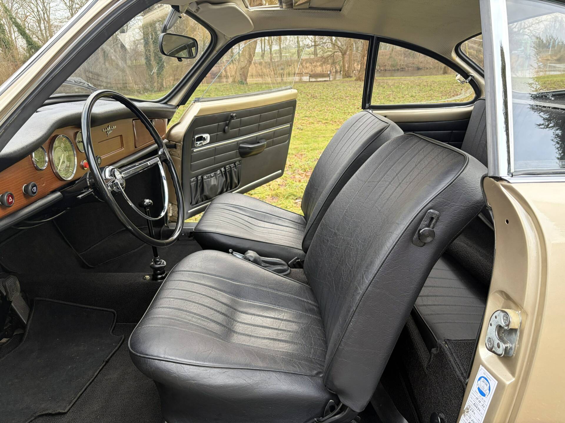 The body has been repainted in the original Karmann Ghia colour “Gold L97”, which looks stunning on the car. It is a rare colour because metallic paint was an expensive option at the time. Only three metallic colours were available back then! The paintwork is excellent. The paint looks beautiful with only a few signs of wear. The chassis has been completely overhauled and treated with anti-rust. A sunroof was fitted in the past, which adds to the driving pleasure. The chrome bumpers are new and the rims have also been repainted and fitted with the correct hubcaps. Naturally, new tyres have been fitted, including the spare wheel.