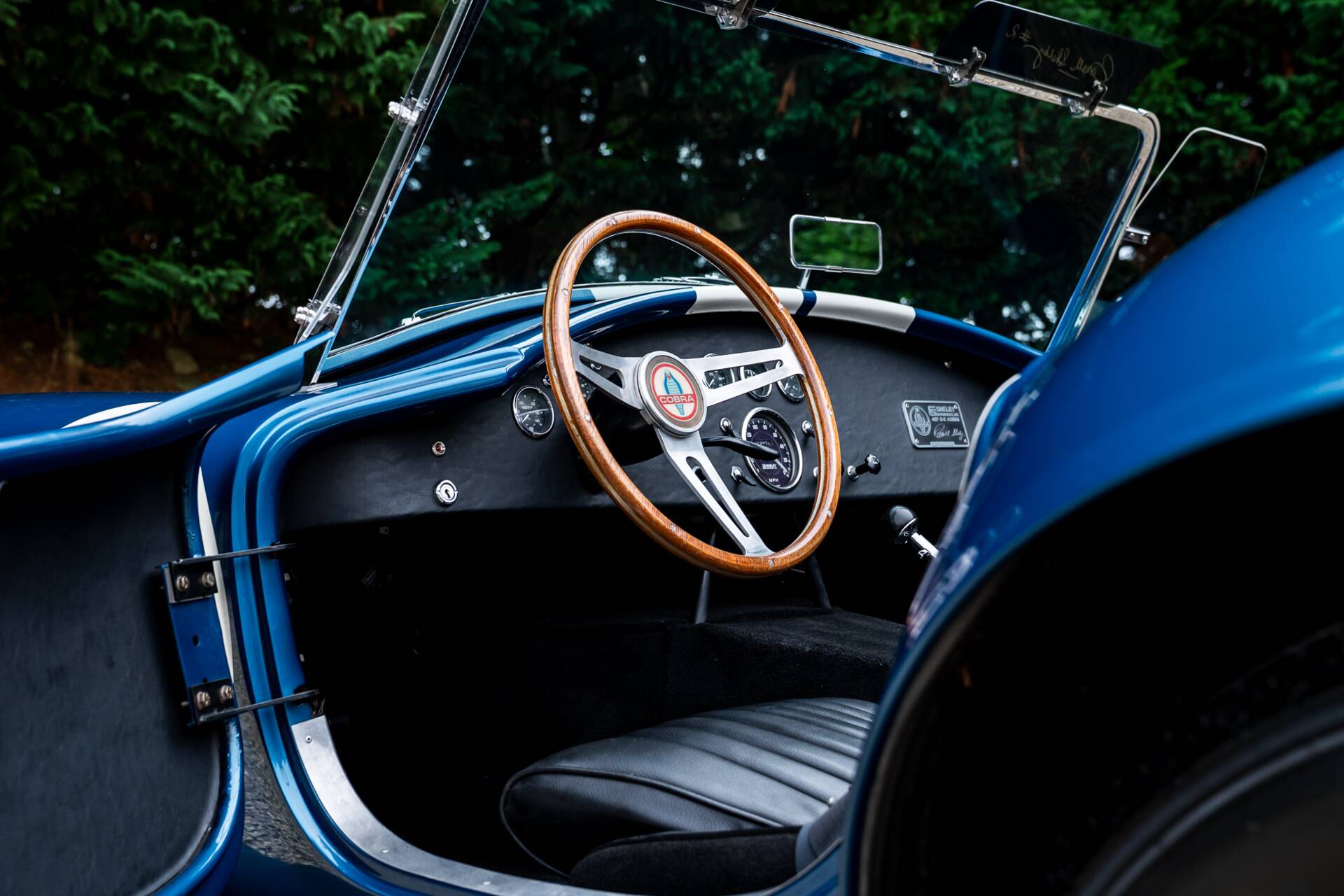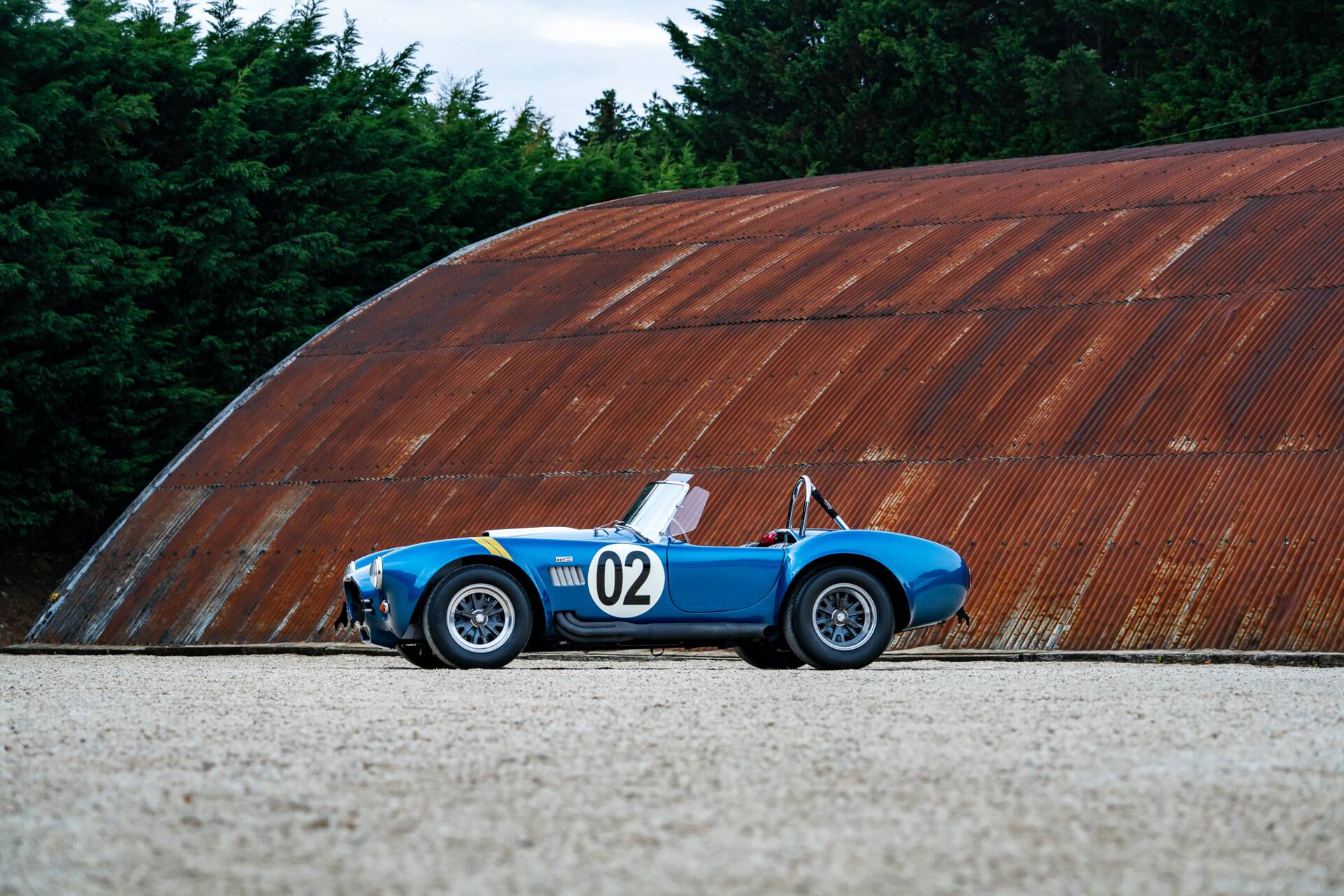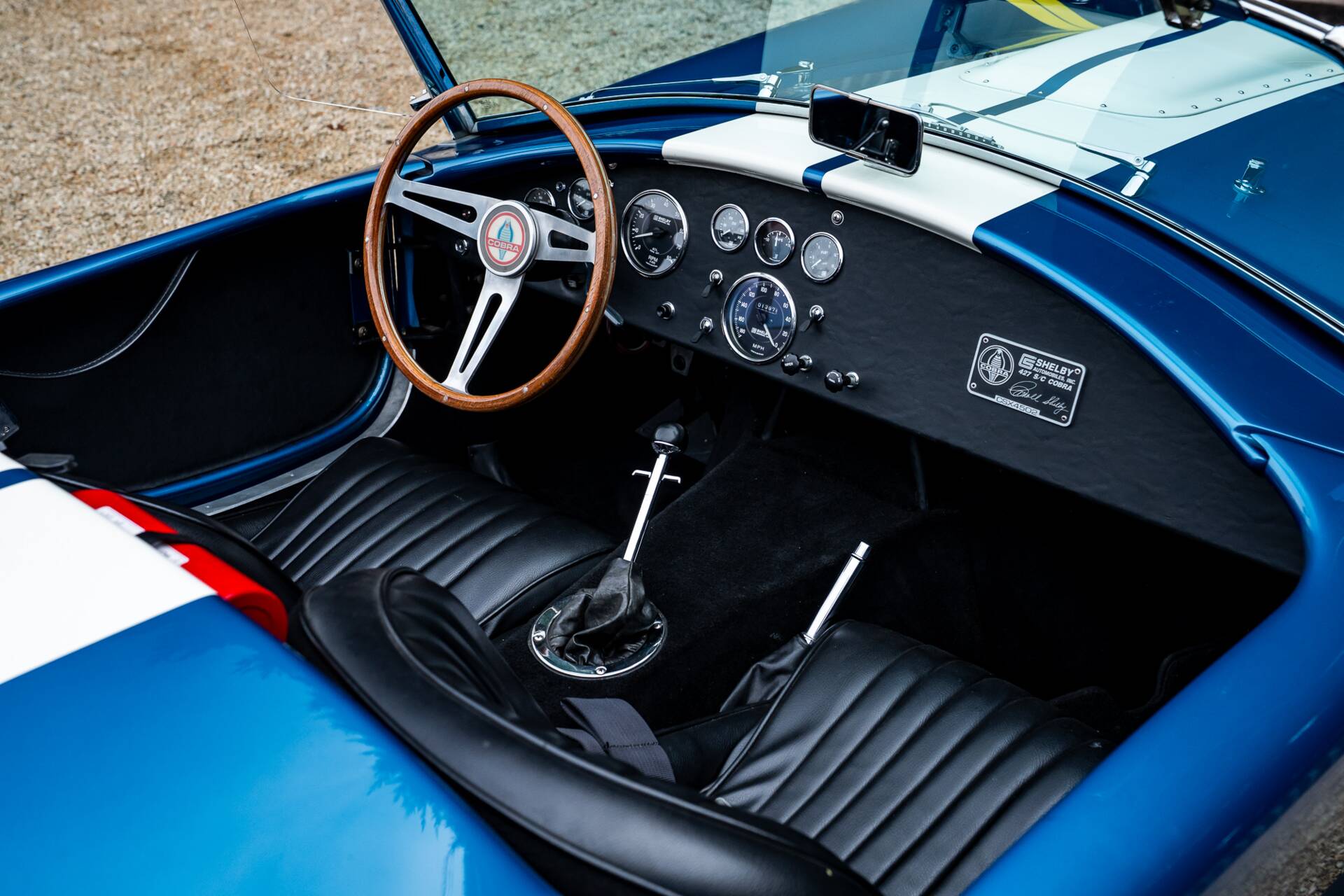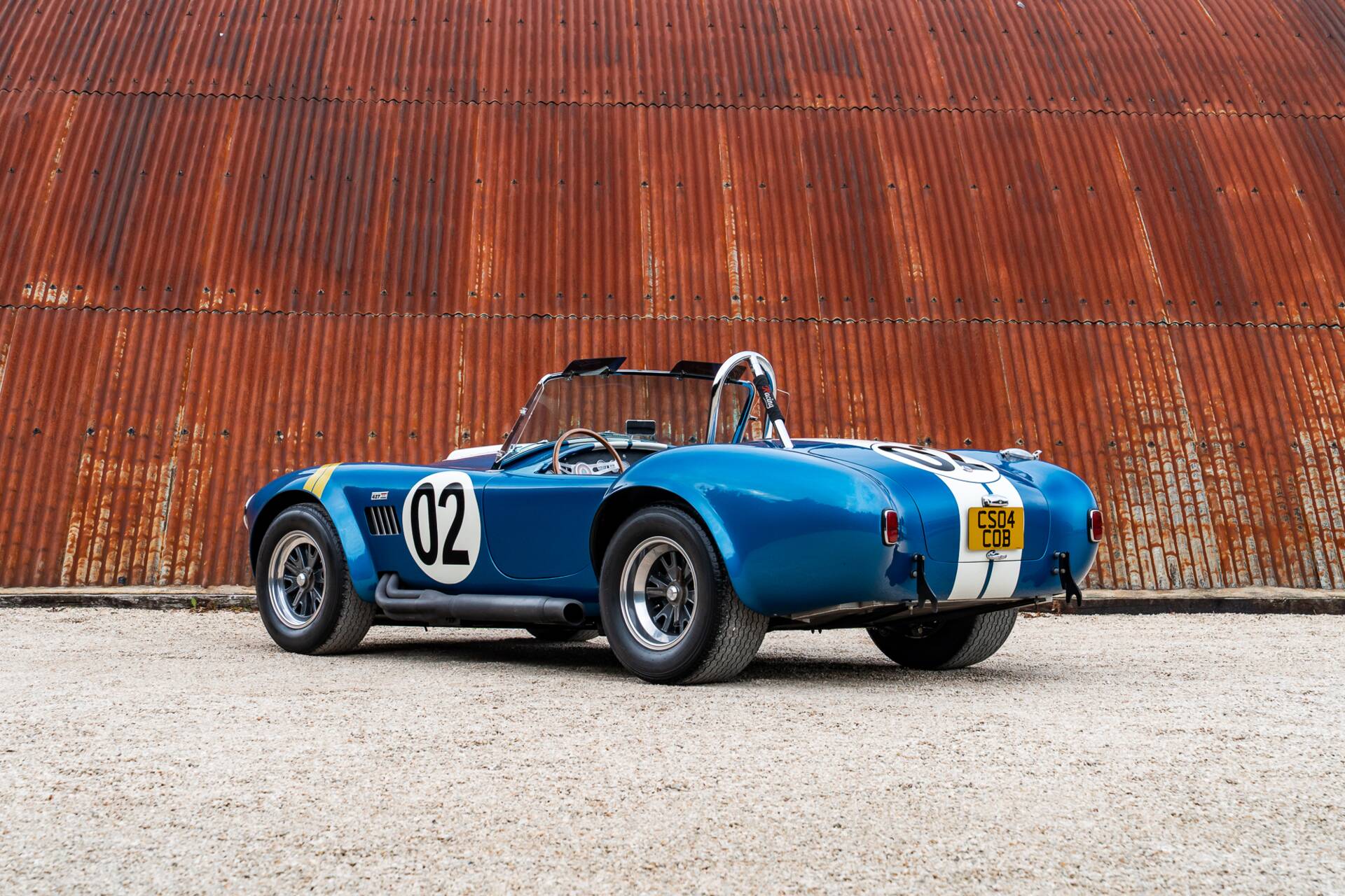 While most 4000-series Cobras had bodies made in glassfibre or aluminium, this is the second of only 10 that were bodied in carbon fibre. Painted in Guardsman Blue with Wimbledon White racing stripes, and with a side-exit exhaust, it has immense presence even when it’s stationary.