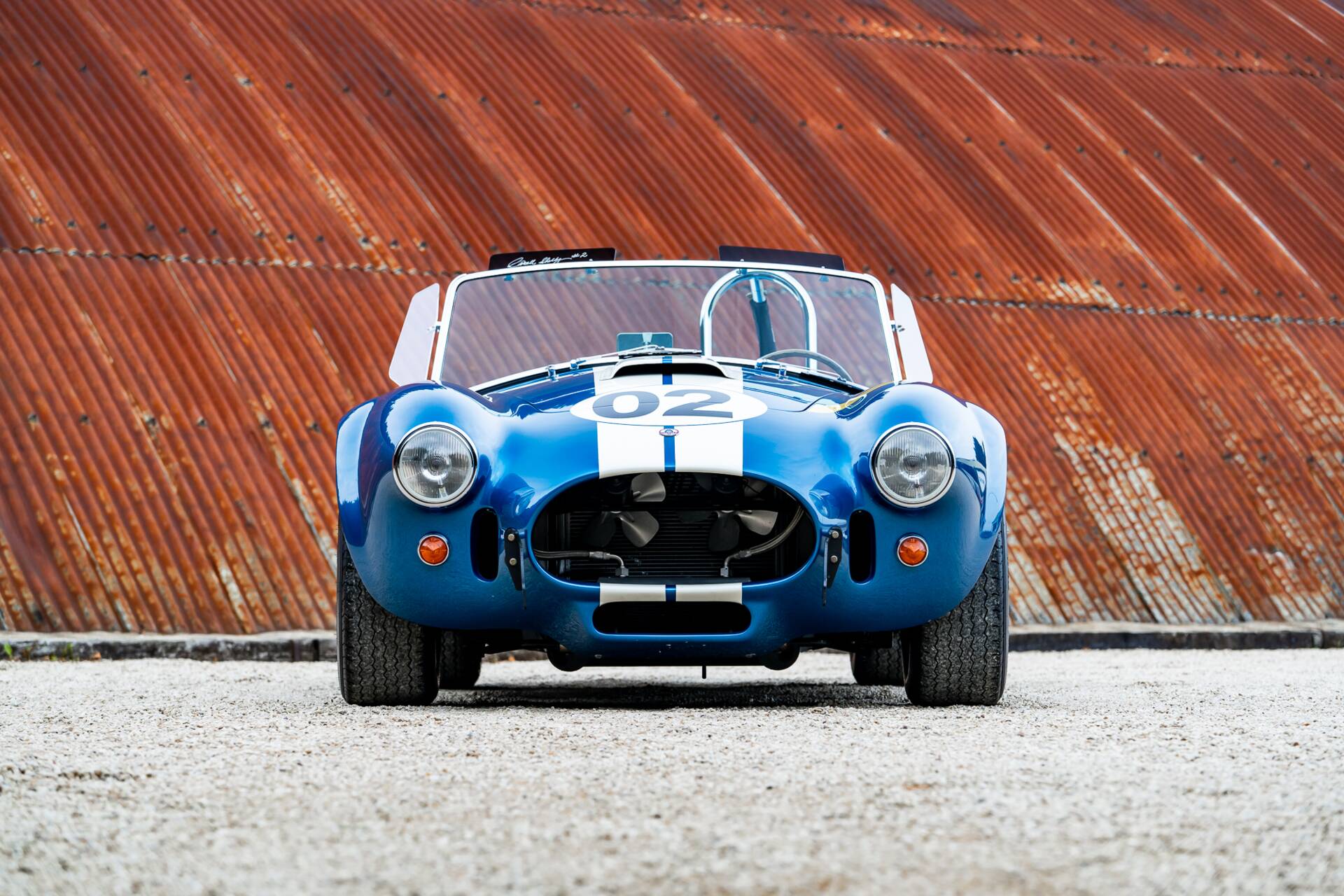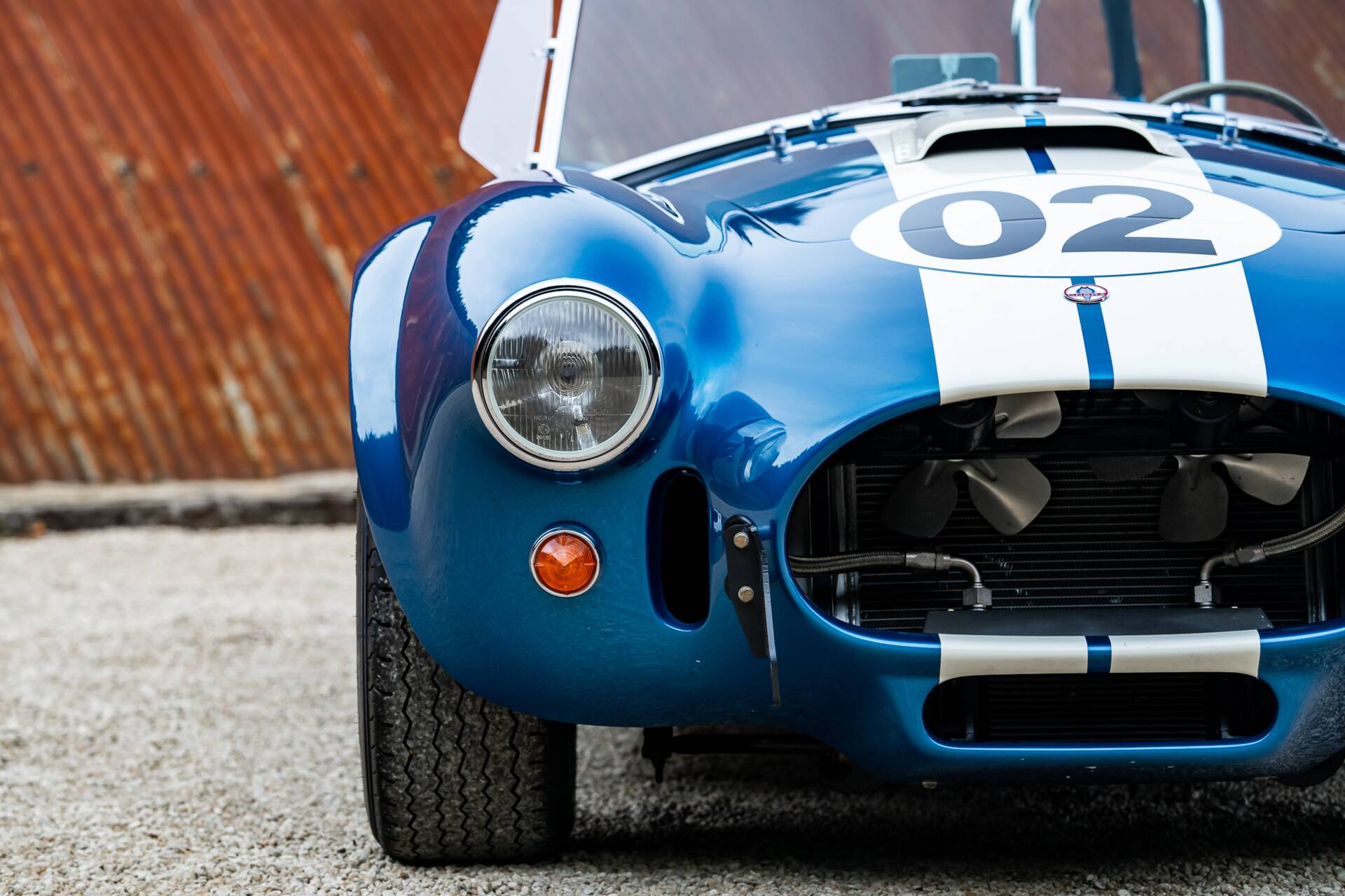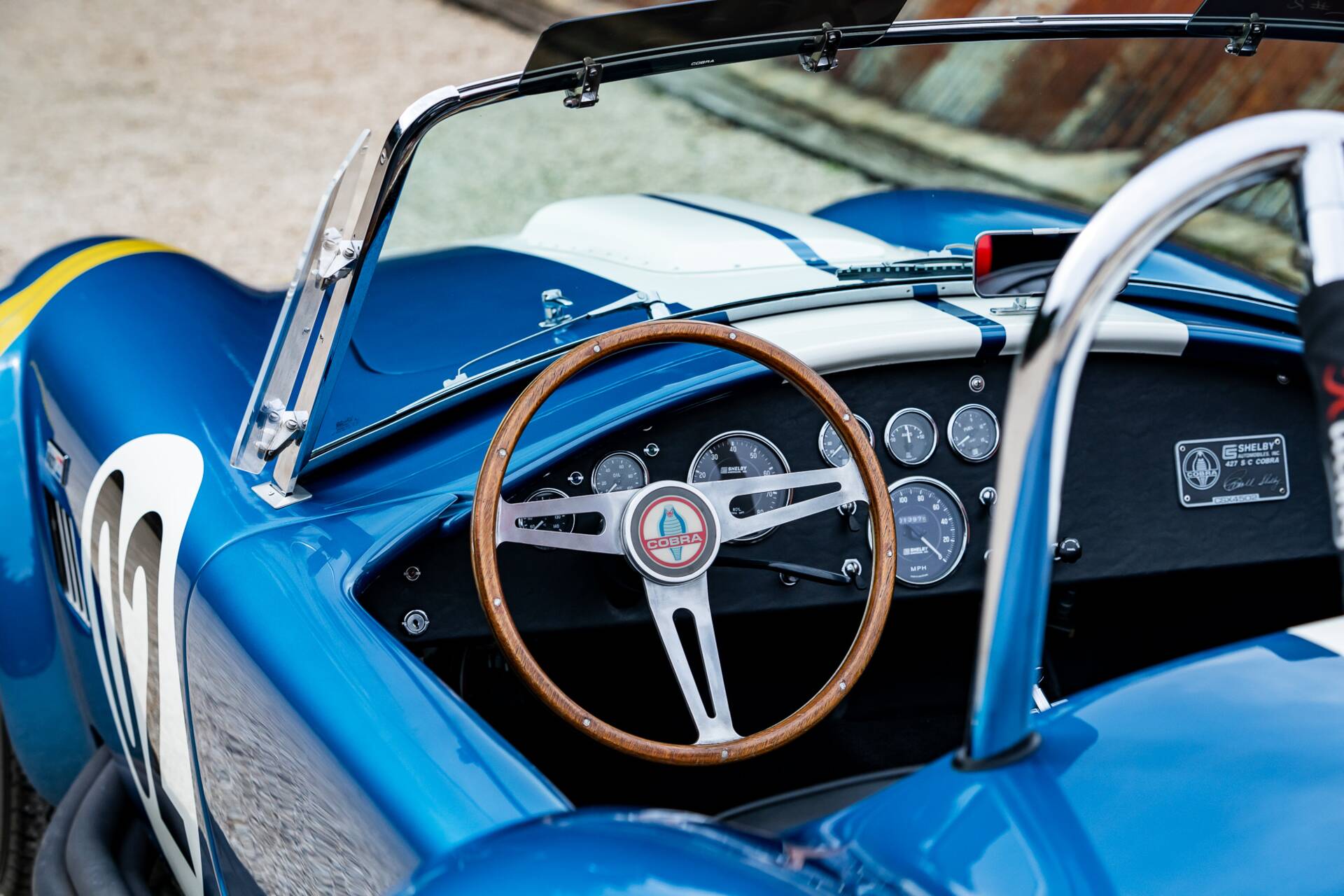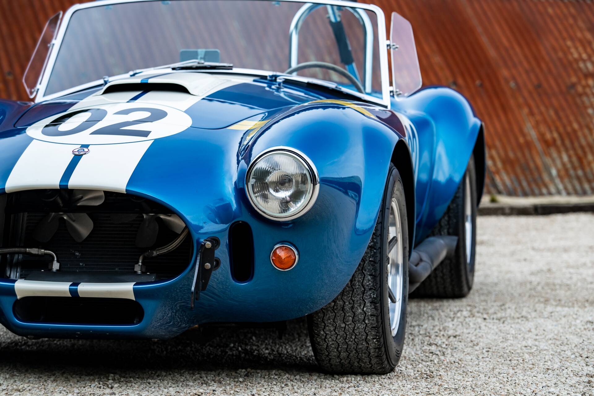 While most 4000-series Cobras had bodies made in glassfibre or aluminium, this is the second of only 10 that were bodied in carbon fibre. Painted in Guardsman Blue with Wimbledon White racing stripes, and with a side-exit exhaust, it has immense presence even when it’s stationary.