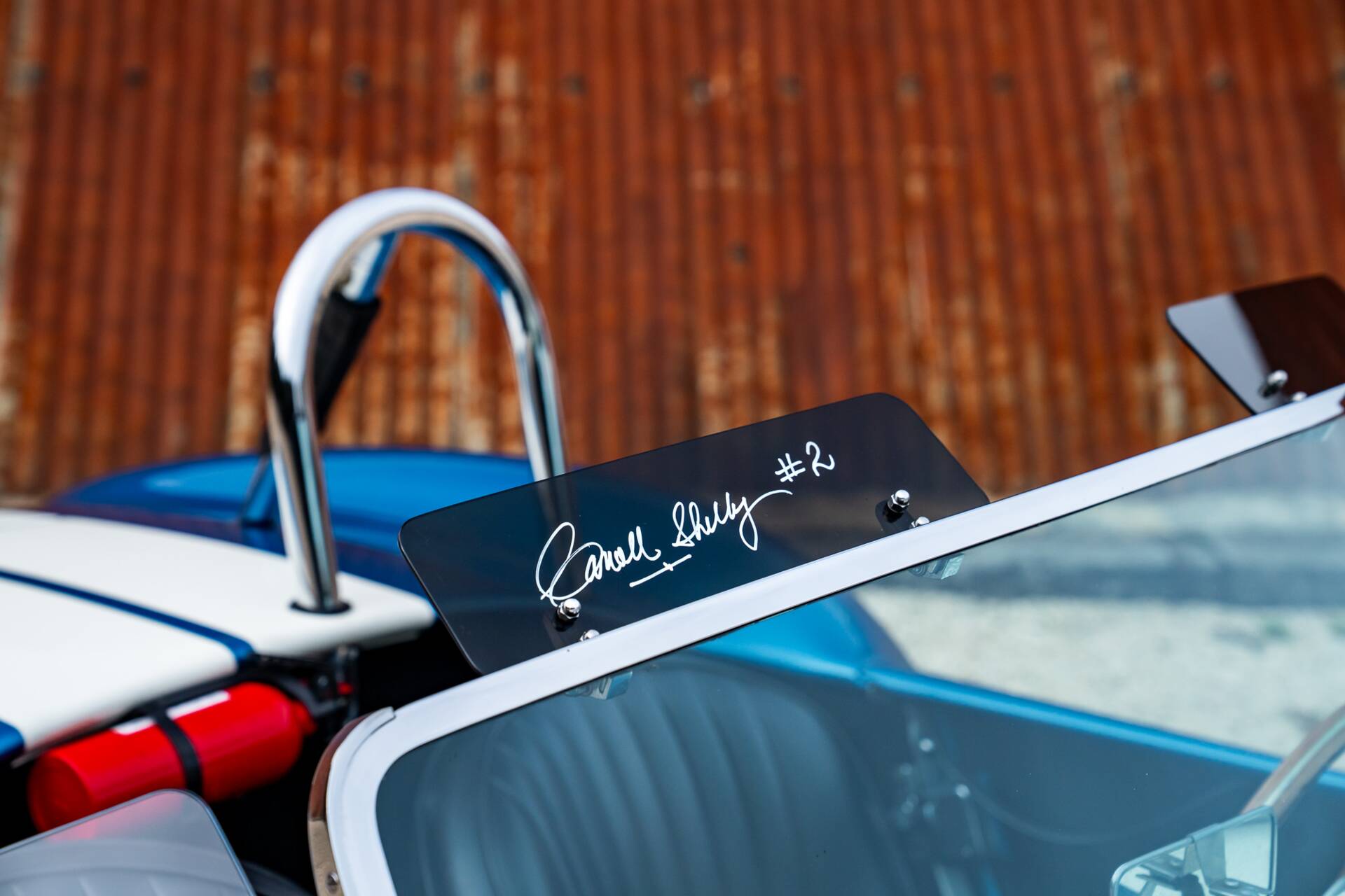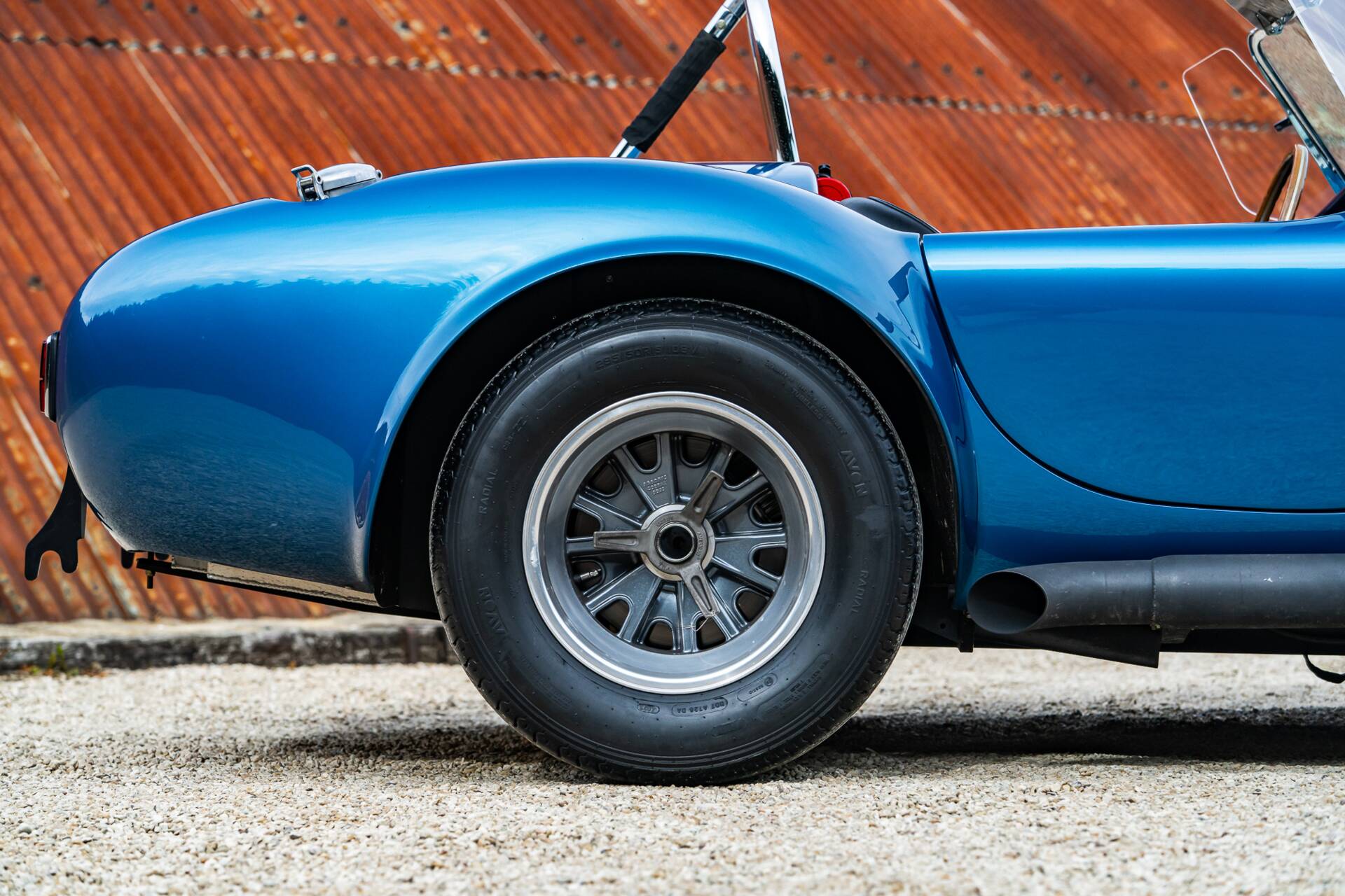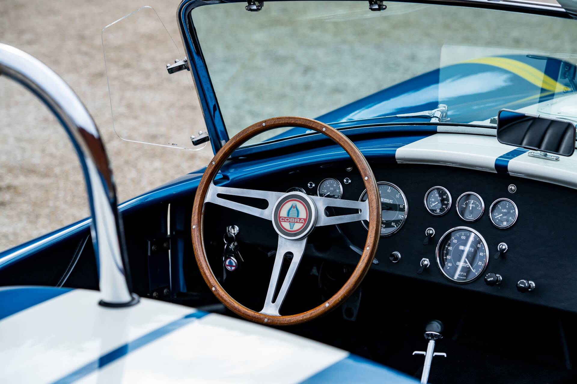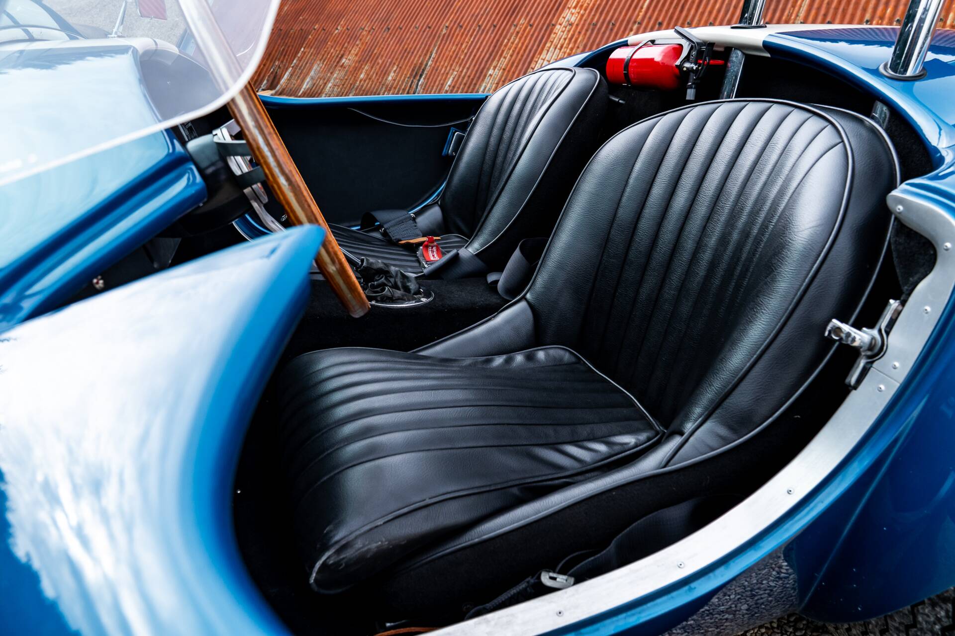 While most 4000-series Cobras had bodies made in glassfibre or aluminium, this is the second of only 10 that were bodied in carbon fibre. Painted in Guardsman Blue with Wimbledon White racing stripes, and with a side-exit exhaust, it has immense presence even when it’s stationary.