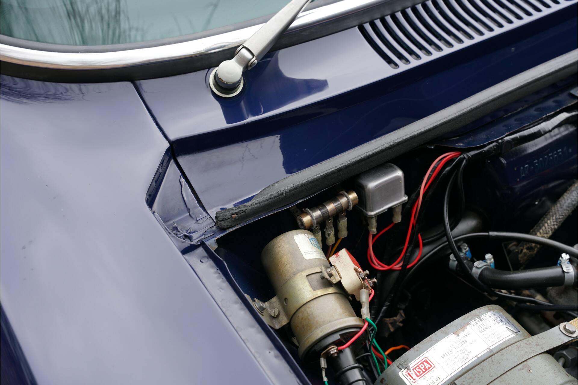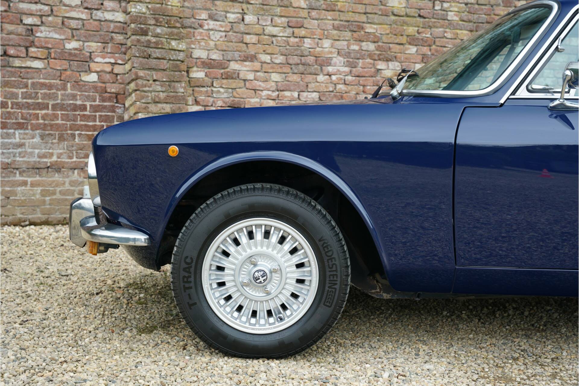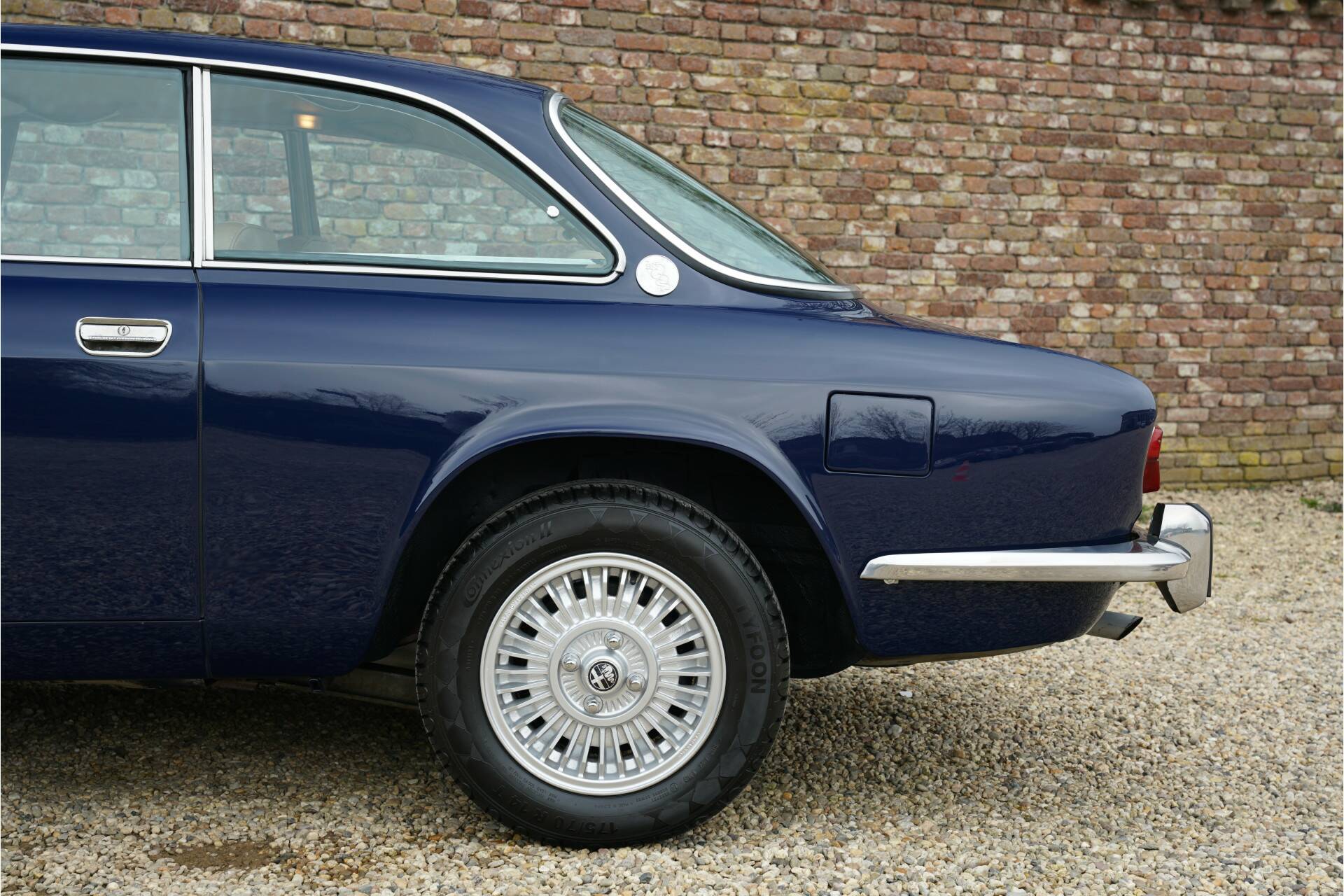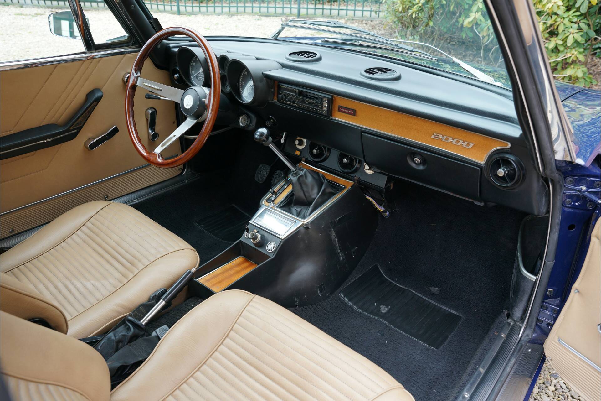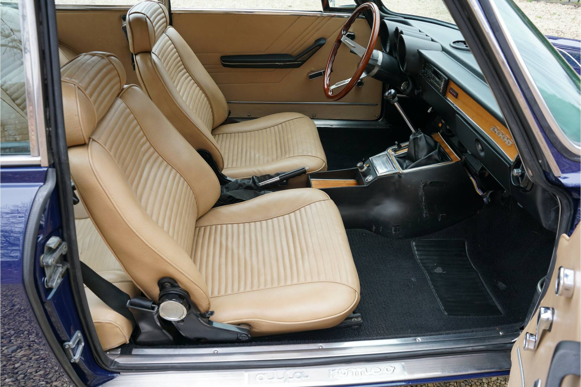 “Blu Ollandese” is most probably the prettiest colour for a 105 series Alfa Romeo, especially when it also has that delicious 2000 engine with twin Weber Carburettors. This car was first allowed on the road in America in 1974. The car has been fully restored to the highest standard. The unblemished bodywork looks fantastic. The nice and thin panelwork is correctly aligned The perfectly applied “Blu Ollandese” paintwork is simply brilliant. The brightwork too is in very good condition. It has perfectly complimentary black carpet and tan vinyl upholstery. During its restoration the 2000 GTV was re-upholstered and has remained pristine. The customary wooden steering wheel and long gearstick are also present. Ergonomically speaking this Alfa Romeo is unusually un-Italian in that it is good. You immediately find the right driving position when you sit down. It is therefore no surprise the 2000 GTV has remained a firm favourite classic. It delivers great entertainment when being driven sportively as well being perfectly able to transport you in all comfort over longer distances. The neat condition of the dashboard deserves a mention, with all gauges, controls and switches working as they should. The 2.0 litre 4-cylinder engine with double overhead cams delivers 132 Ps at 5,500 revs attached to its manual 5-speed gearbox. The engine has no trouble at all propelling this 1,028 kg light Italian coupé. This car sporting its iconic turbine rims is ready to go. It comes with a copy of the original Alfa Romeo owners manual.