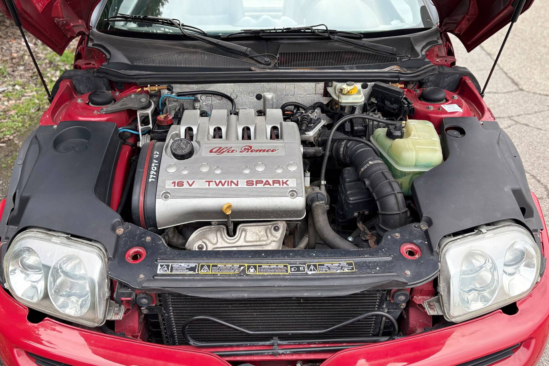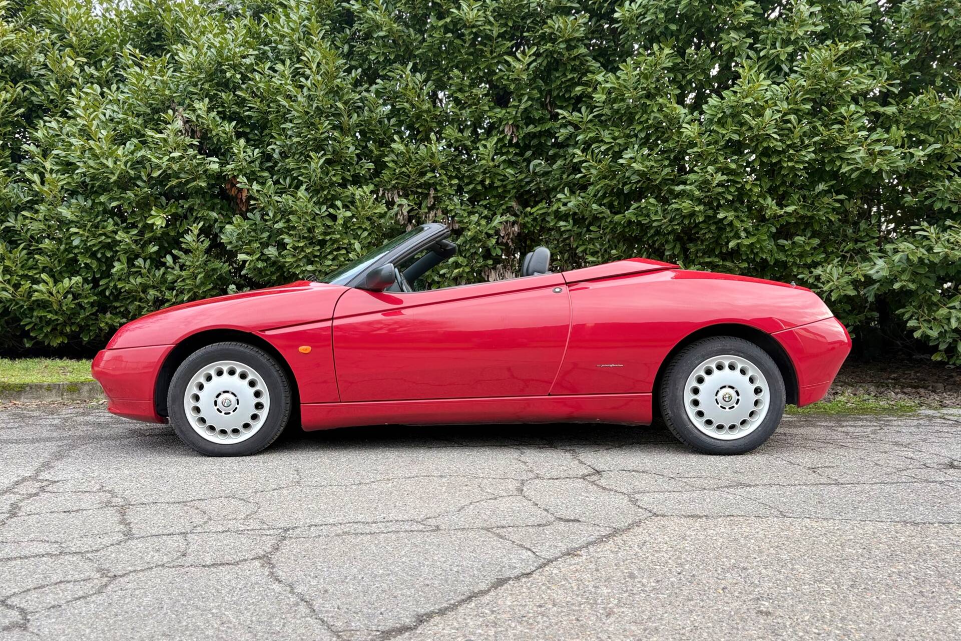 La carrozzeria è rosso Alfa, colore simbolo della sportività italiana, abbinata a una capote nera in ottime condizioni. Gli interni neri, sportivi ed eleganti, si presentano ben conservati e mantengono intatto lo spirito originale della vettura, con dettagli e finiture ancora in ottimo stato.