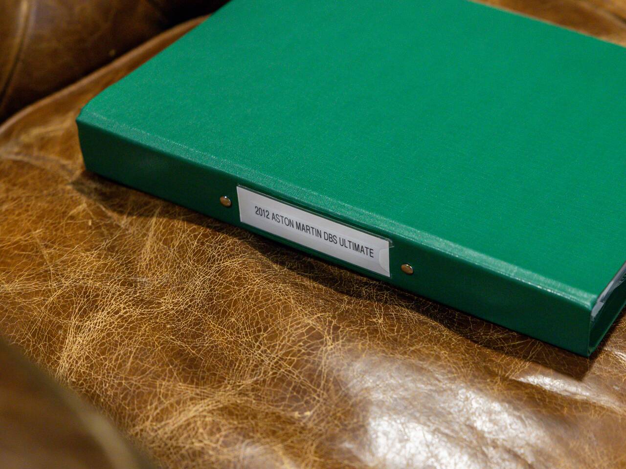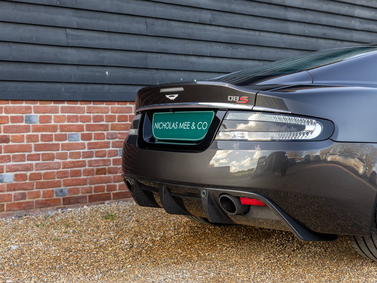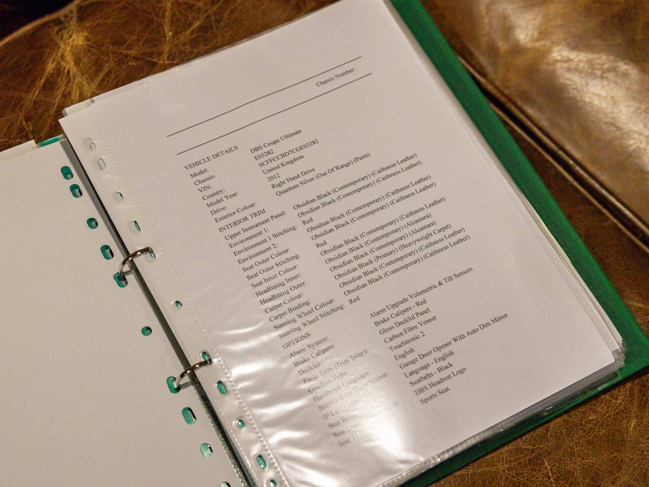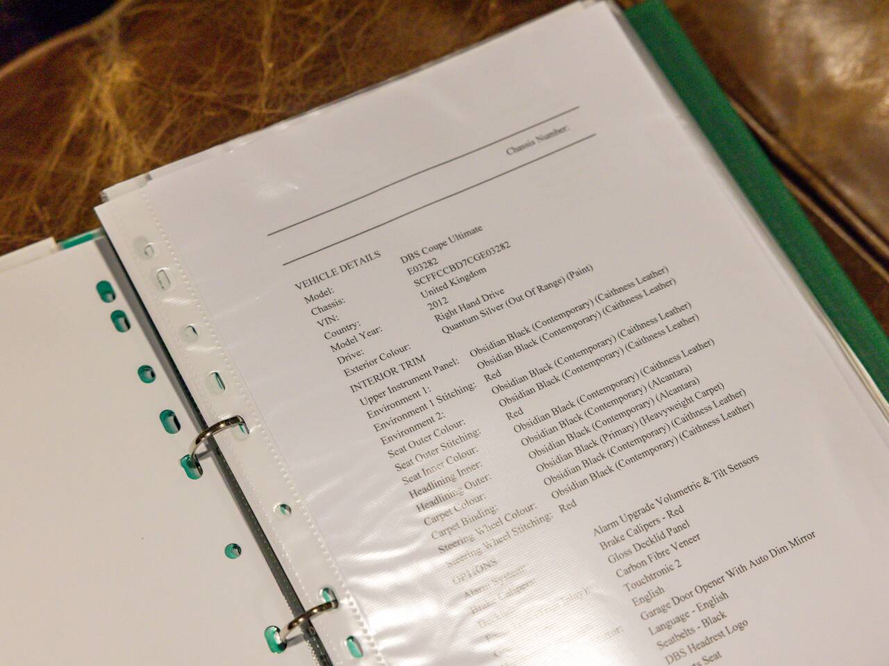 The 'Ultimate' specification included: 2012 model year DBS with 2+2 seating, coachwork in AML Carbon Black, Quantum Silver or Silver Fox, black front grille, bonnet and side strake meshes, carbon fibre wing mirror caps, Zircotec black coated exhaust tailpipe finishers, smoked rear lamps, black lamp surrounds and carbon fibre rear lamp in fills, gloss black diamond turned wheels, DBS badge featuring a red 'S', Quilted Obsidian Black interior, diamond quilt alcantara headlining, carbon fibre upper fascia and piano black centre console, paddle tips trimmed in spicy leather, DBS seat embroidery including a red 'S', black anodised Bang & Olufsen speaker grilles and finally, a unique sill plaque featuring the individual build number.