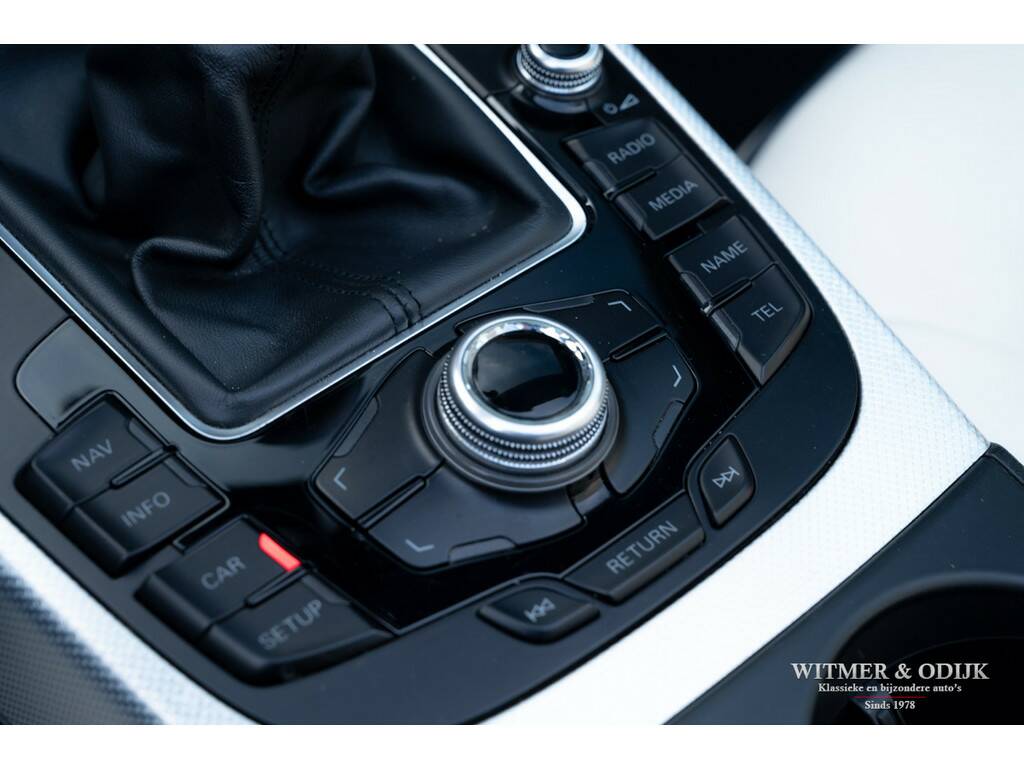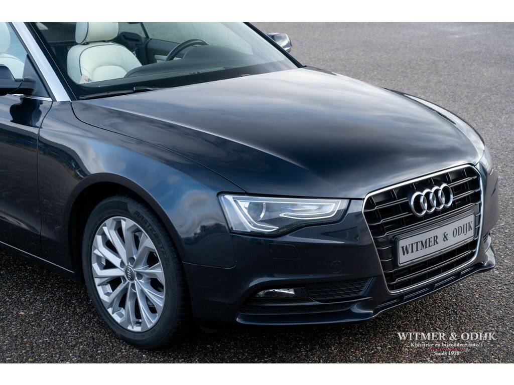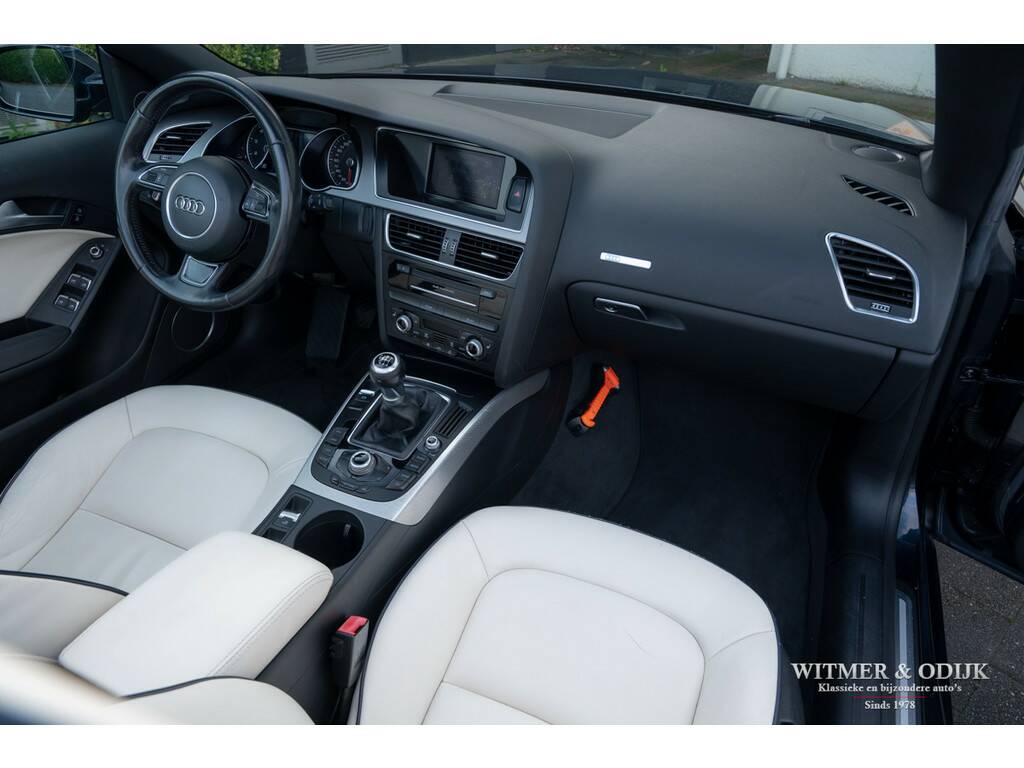 Onze klanten zijn meestal autoliefhebbers. Mensen waar je graag een auto van inruilt, ze zorgen over het algemeen bovengemiddeld goed voor hun hobby-object. Recent verkochten wij een Aston Martin Vantage Roadster, deze zeer vriendelijke en correcte klant had wel een plek in de garage nodig voor de Aston. Zo kwam deze werkelijk prachtige Audi in onze collectie. Laat u niet direct leiden door de kilometerstand, stond er 60.000km op de teller dan had u het ook voor waar aangenomen. Kijk bijvoorbeeld eens naar de kwaliteit van het interieur in deze toch wel kwetsbare kleurstelling. Ook technisch werd er uitermate zorgvuldig met deze A5 omgegaan. Uit het strakke weggedrag, zonder ook maar één piep of kraak, maakt een kenner direct op dat het onderhoud up-to-date is. Uiteraard is de onderhoudsgeschiedenis present. Over de carrosserie en het cabriodak valt ook alleen maar goed nieuws te brengen, geen enkel zichtbaar gebruiksspoor vindt u op de lak. De auto is ook altijd schadevrij gebleven. Het betreft een origineel Nederlands geleverde Audi A5 met de betrouwbare 1.8TFSI motor, rijk voorzien van opties zoals; automatische climat control, regelbare stoelverwarming, cruise control, parc distance control, opvouwbaar windscherm, creme leer met donkerblauwe piping, multi-media systeem met navigatie, xenon verlichting, elektrisch bedienbaar cabriodak, lichtmetalen velgen, etc. Een optisch 'nieuwe' Audi voor een wel zeer aantrekkelijke prijs. Rijklaar inclusief nieuwe APK, garantie en onderhoudsbeurt in onze showroom. Maak een a.u.b. een afspraak wanneer u de auto wilt bezichtigen.
