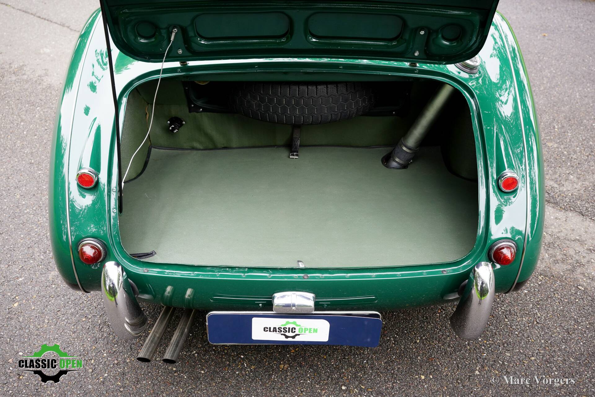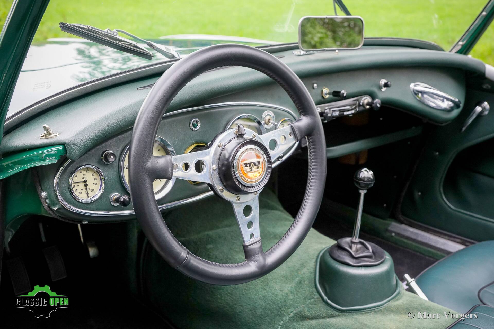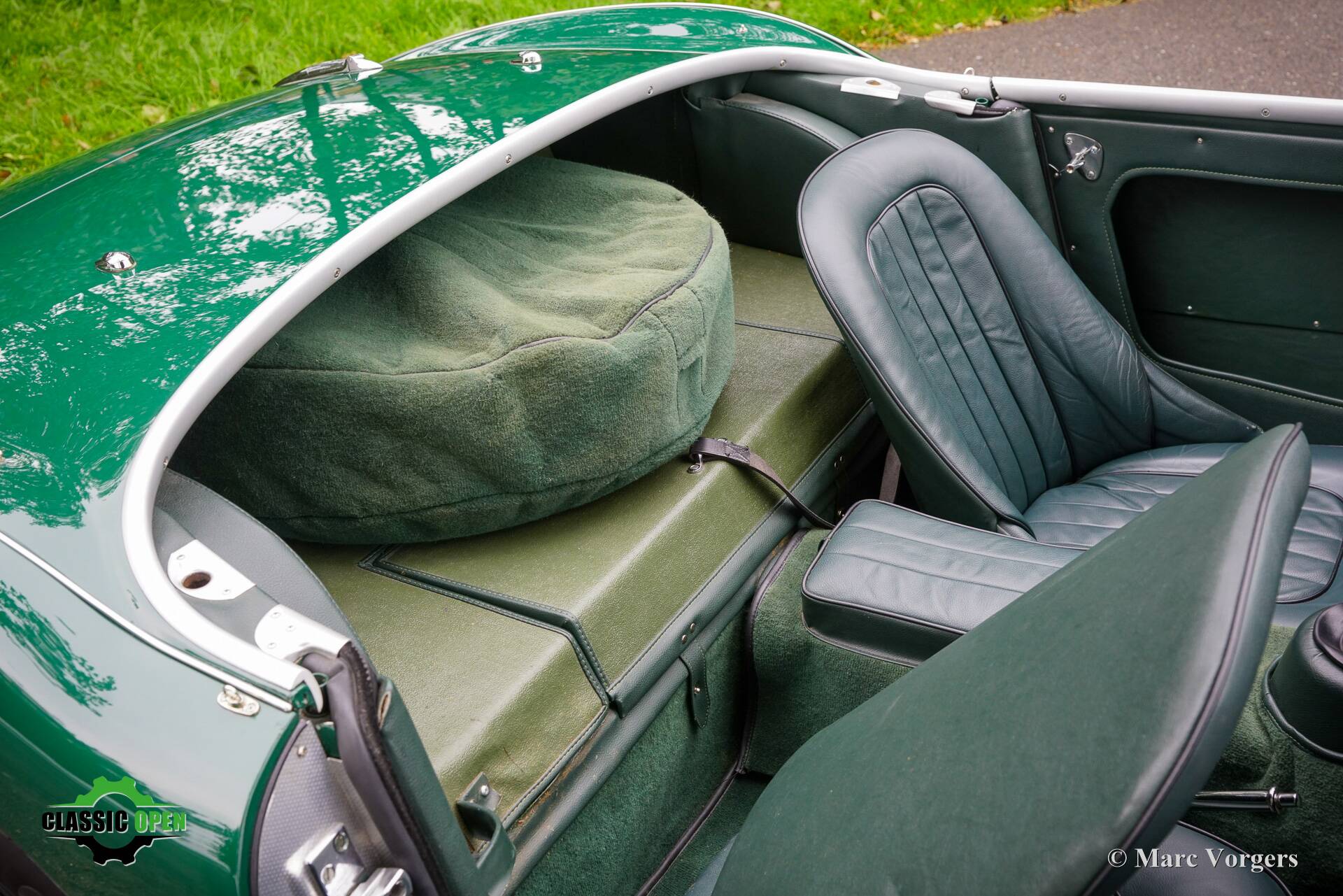 The exterior looks purposeful in its British Racing green with black. The black wire wheels and the big Lucas SFT700 lamps add to the sporty appearance as does the deletion of the standard bumpers.