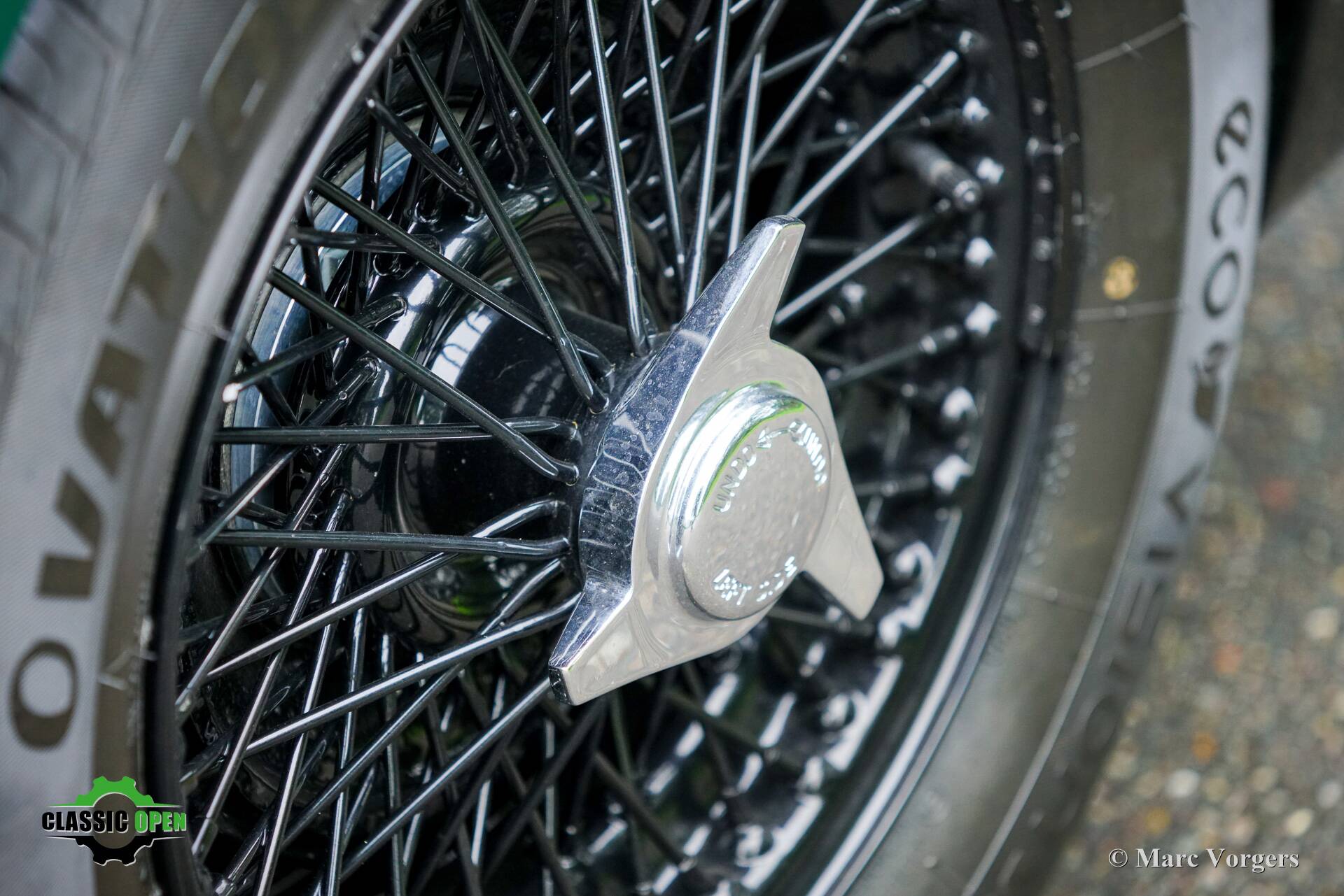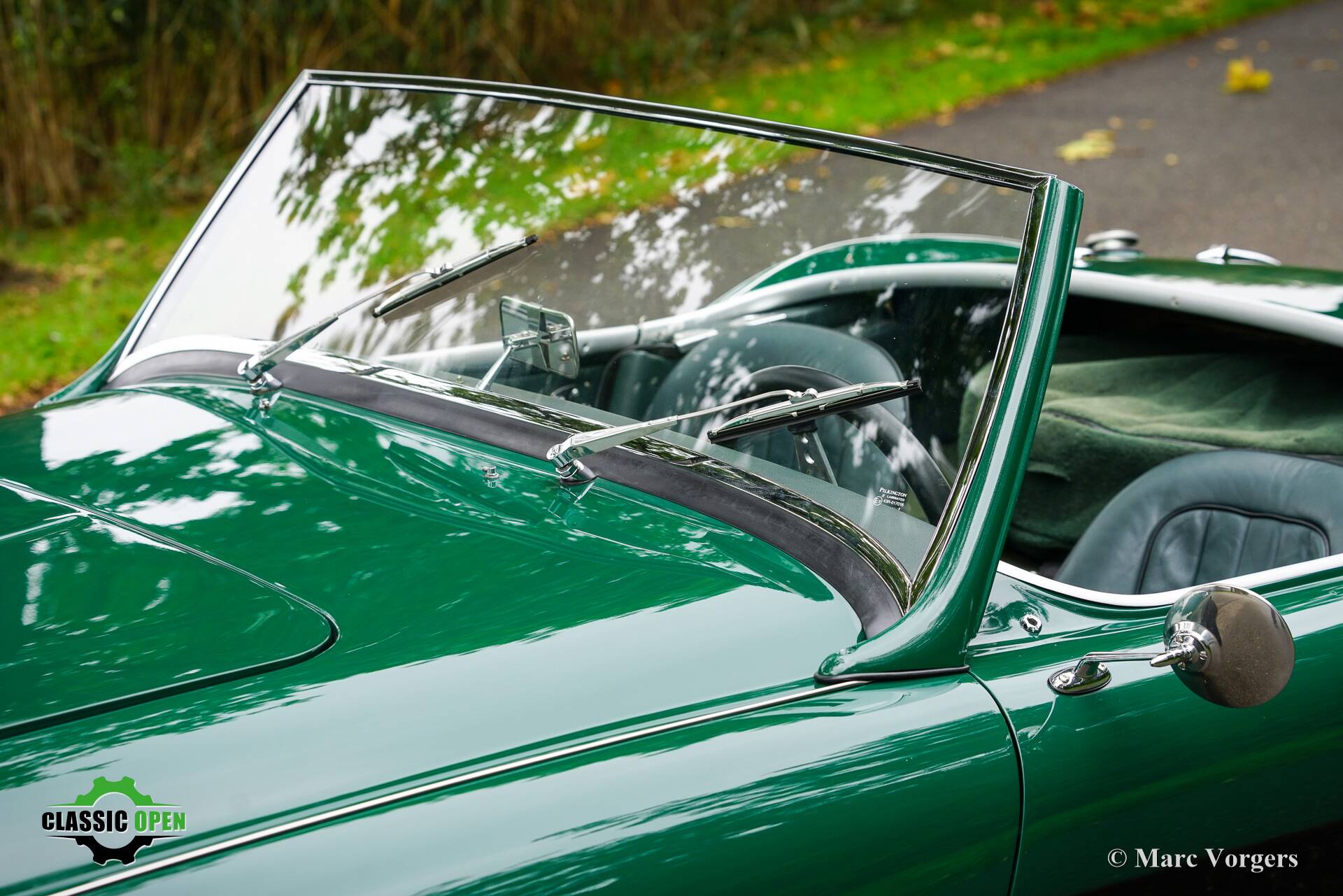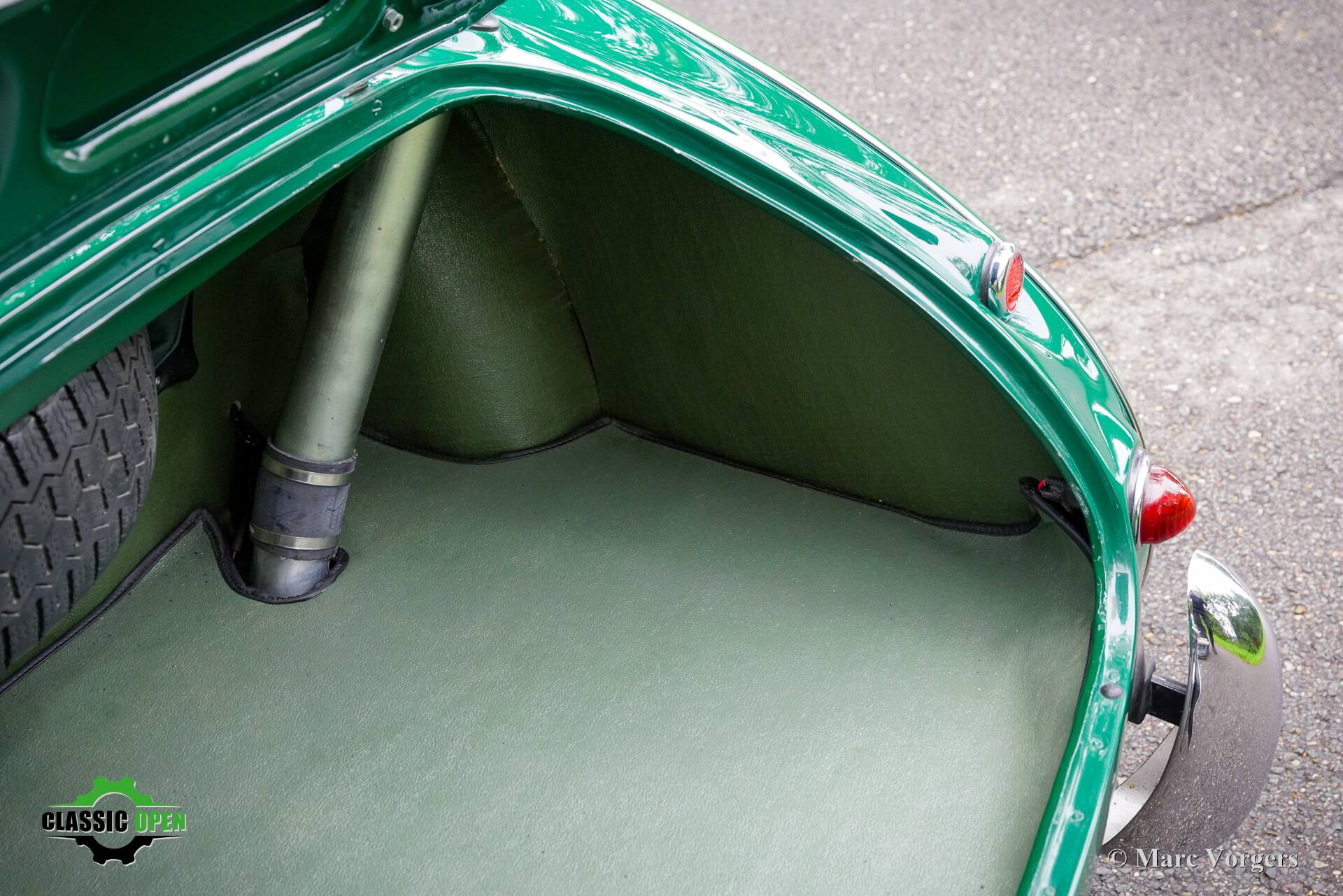 The exterior looks purposeful in its British Racing green with black. The black wire wheels and the big Lucas SFT700 lamps add to the sporty appearance as does the deletion of the standard bumpers.